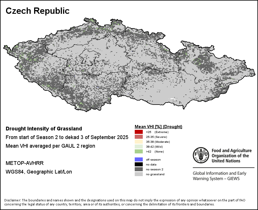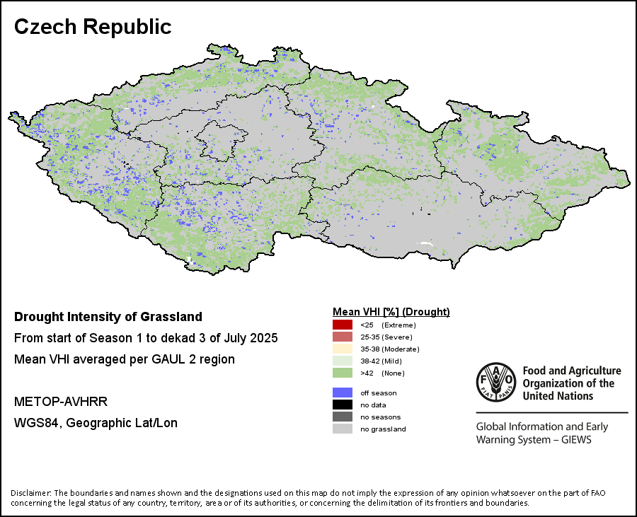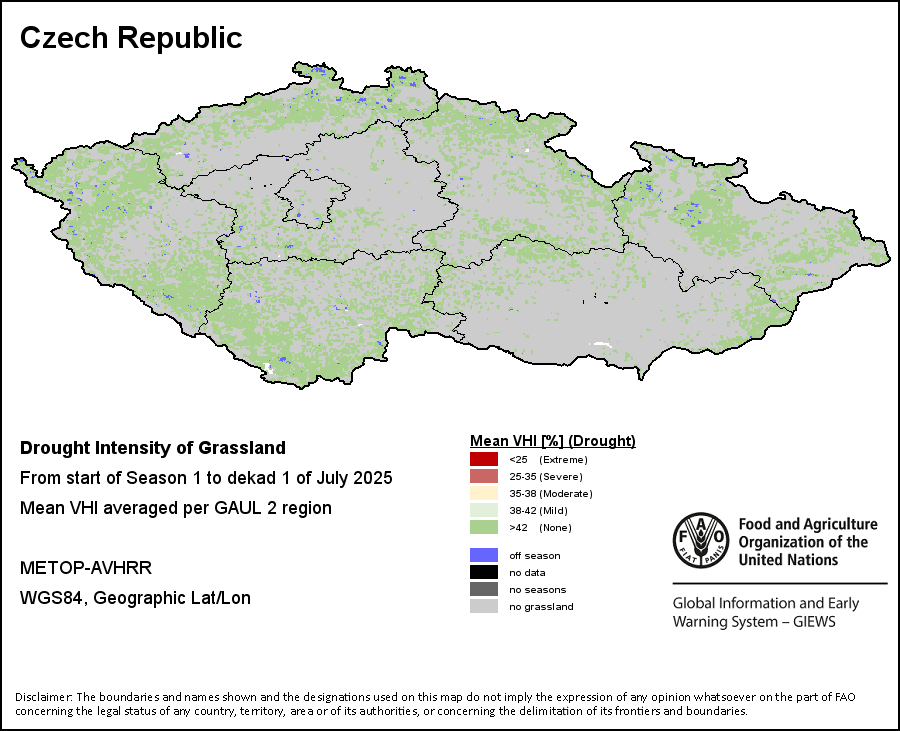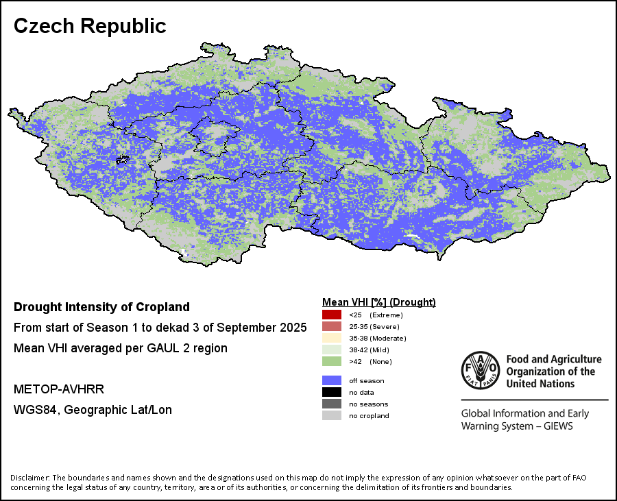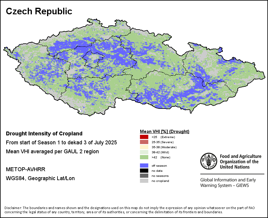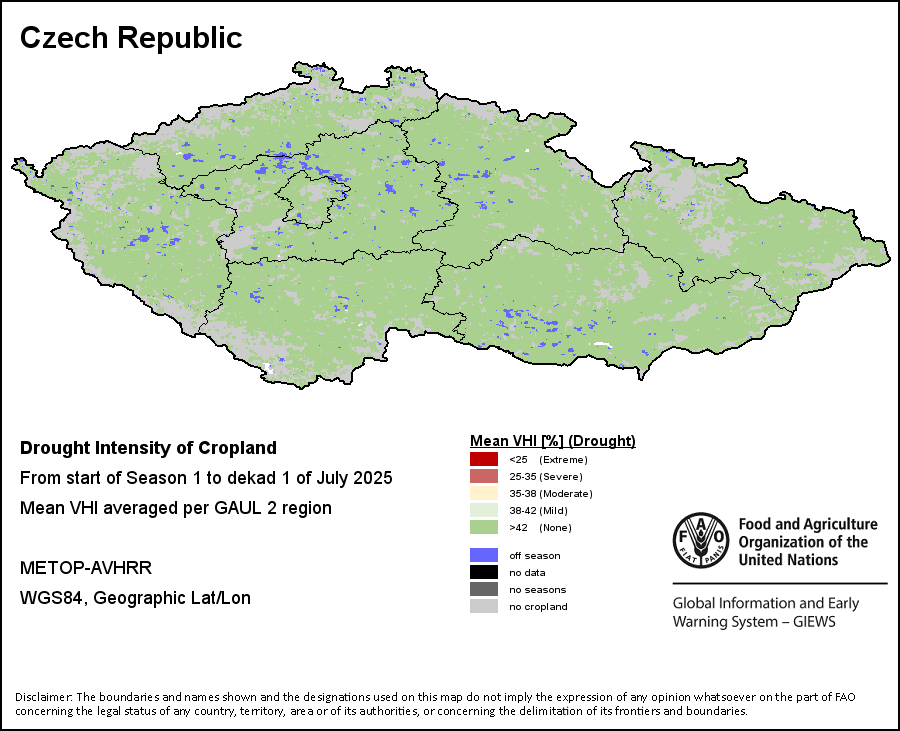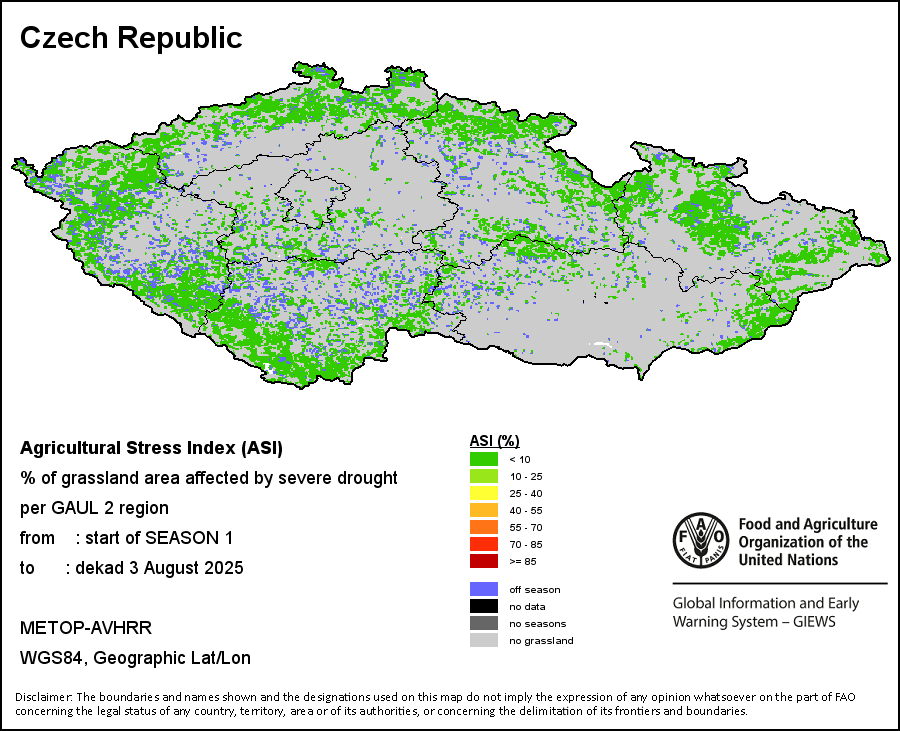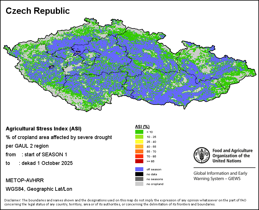 The Agricultural Stress Index (ASI) is a quick-look indicator that facilitates the early identification of cropped land with a high likelihood of water stress (drought). The Index is based on the integration of the Vegetation Health Index (VHI) in two dimensions that are critical in the assessment of a drought event in agriculture: temporal and spatial. The first step of the ASI calculation is a temporal averaging of the VHI, assessing the intensity and duration of dry periods occurring during the crop cycle at the pixel level; this calculation includes the use of crop coefficients, which introduces sensitivity of a crop to water stress during each phenological phase. The second step determines the spatial extent of drought events by calculating the percentage of pixels in arable areas with a VHI value below 35 percent (this value was identified as a critical threshold in assessing the extent of drought in previous research by Kogan, 1995). Each administrative area is classified according to the percentage of the affected area to facilitate the quick interpretation of results.