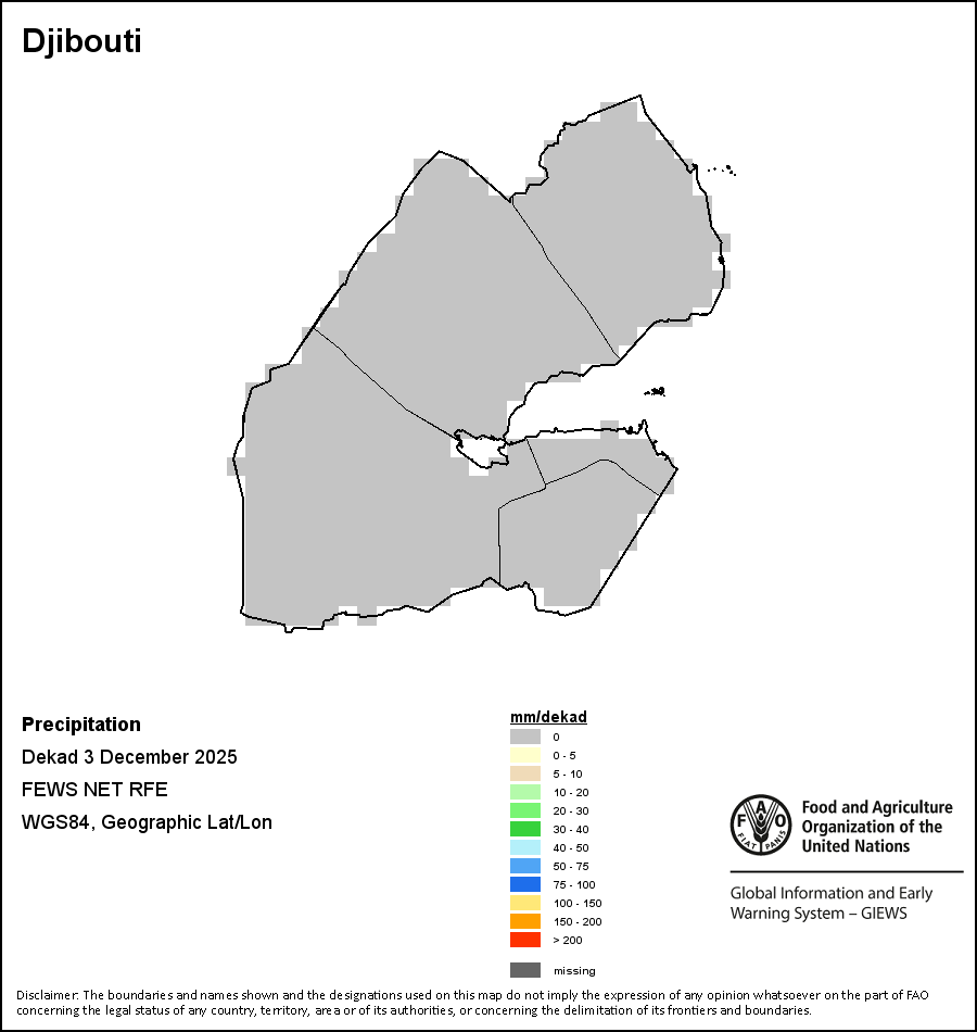The country level maps and graphs depict the latest 36-month period of the seasonal, vegetation and precipitation indicators. The data is presented by dekad and month. All three vegetation indicators are based on 10-day (dekadal) vegetation data from the METOP-AVHRR sensor at 1 km resolution (2007 and after). Data at 1 km resolution for the period 1984-2006 are derived from the NOAA-AVHRR dataset at 16 km resolution. Precipitation estimates for all African countries (except Cabo Verde and Mauritius) are taken from NOAA/FEWSNet (16 km resolution), while for the remaining countries data is obtained from ECMWF (25 km resolution). Owing to the higher resolution of vegetation indicators (e.g., NDVI, VHI) compared to coarser precipitation indicators, the number of sub-national units for which valid zonal statistics can be generated for vegetation indices is greater than the number of units for precipitation indicators for certain countries.