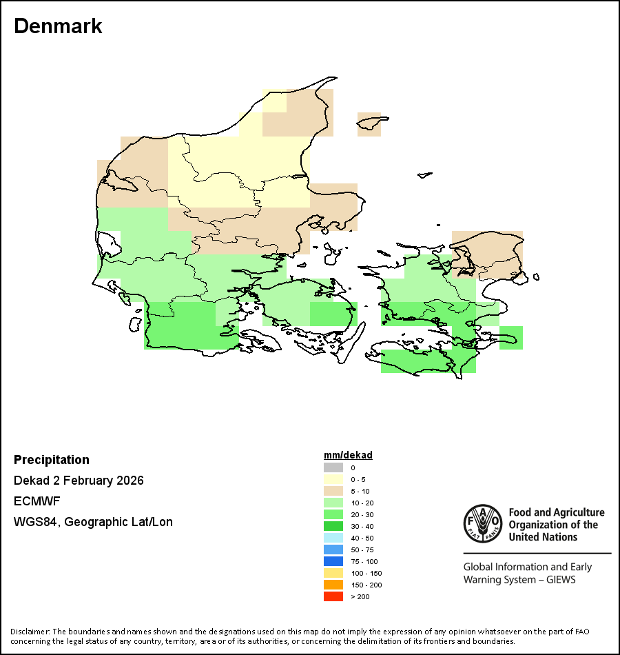 На карте изображены кумулятивные объемы осадков в декаду (10-дневный период). Оценки атмосферных осадков для всех африканских стран (за исключением Кабо-Верде и Маврикия) получены из системы NOAA/Системы раннего предупреждения об опасности голода, а по остальным странам данные получены из системы ECMWF.