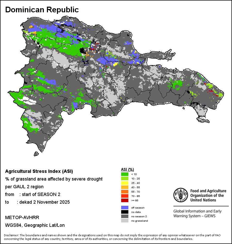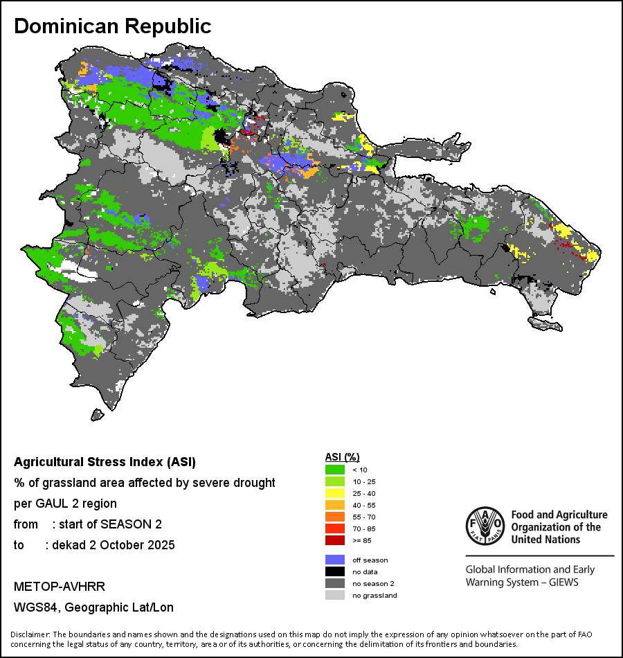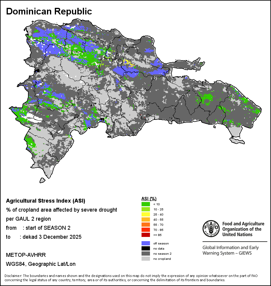 The Agricultural Stress Index (ASI) is a quick-look indicator that facilitates the early identification of cropped land with a high likelihood of water stress (drought). The Index is based on the integration of the Vegetation Health Index (VHI) in two dimensions that are critical in the assessment of a drought event in agriculture: temporal and spatial. The first step of the ASI calculation is a temporal averaging of the VHI, assessing the intensity and duration of dry periods occurring during the crop cycle at the pixel level; this calculation includes the use of crop coefficients, which introduces sensitivity of a crop to water stress during each phenological phase. The second step determines the spatial extent of drought events by calculating the percentage of pixels in arable areas with a VHI value below 35 percent (this value was identified as a critical threshold in assessing the extent of drought in previous research by Kogan, 1995). Each administrative area is classified according to the percentage of the affected area to facilitate the quick interpretation of results.