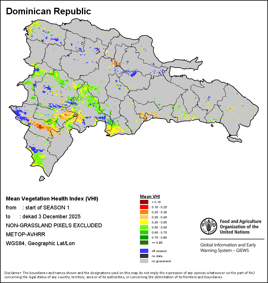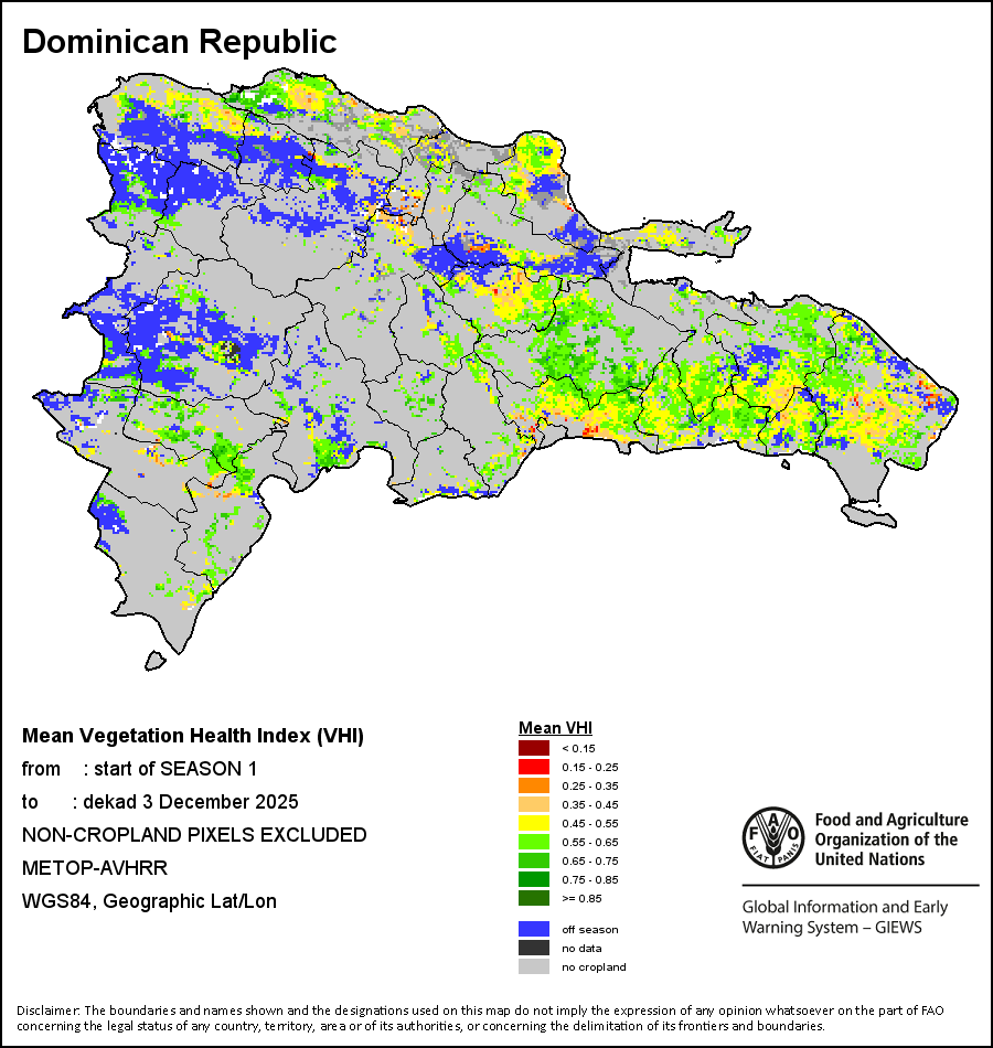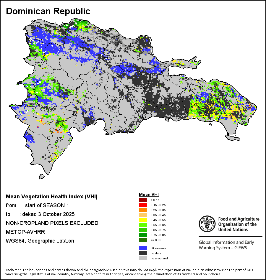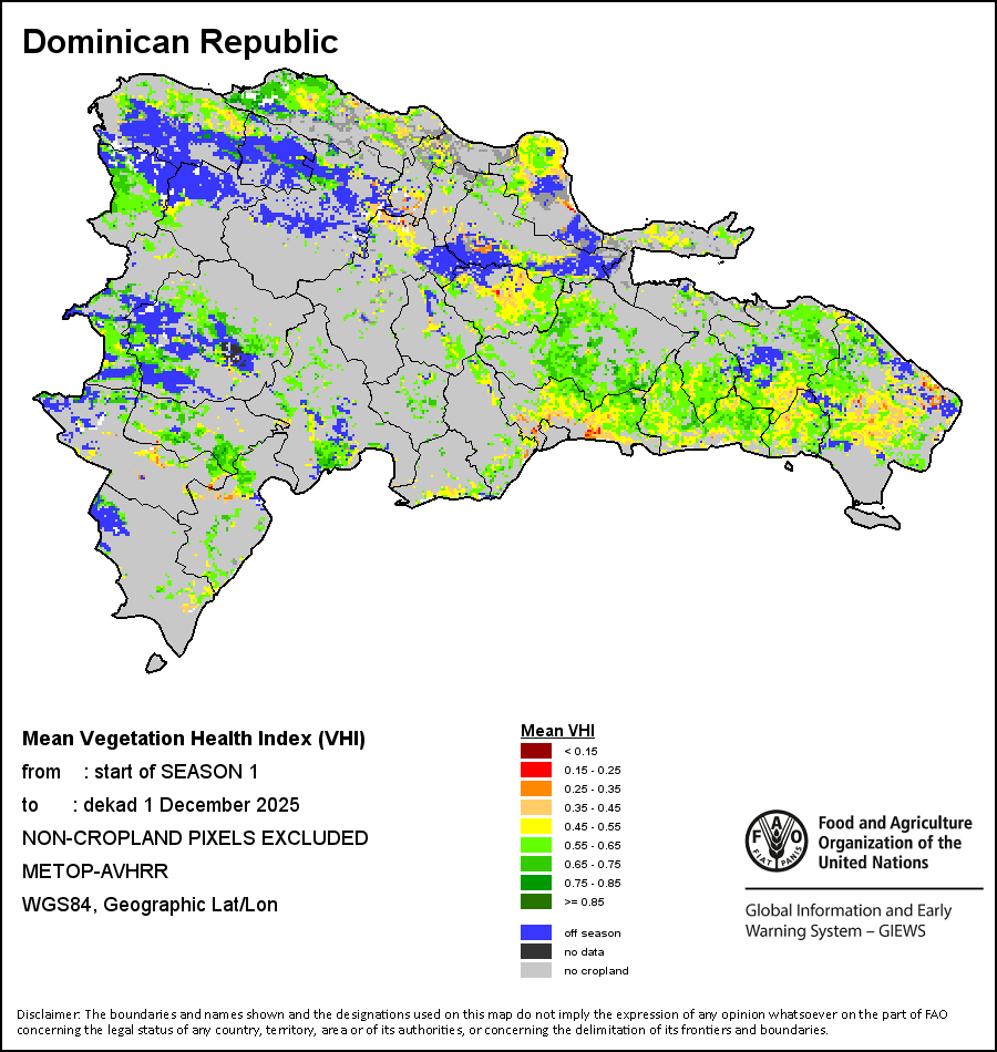 The country level maps and graphs depict the latest 36-month period of the seasonal, vegetation and precipitation indicators. The data is presented by dekad and month. All three vegetation indicators are based on 10-day (dekadal) vegetation data from the METOP-AVHRR sensor at 1 km resolution (2007 and after). Data at 1 km resolution for the period 1984-2006 are derived from the NOAA-AVHRR dataset at 16 km resolution. Precipitation estimates for all African countries (except Cabo Verde and Mauritius) are taken from NOAA/FEWSNet (16 km resolution), while for the remaining countries data is obtained from ECMWF (25 km resolution). Owing to the higher resolution of vegetation indicators (e.g., NDVI, VHI) compared to coarser precipitation indicators, the number of sub-national units for which valid zonal statistics can be generated for vegetation indices is greater than the number of units for precipitation indicators for certain countries.