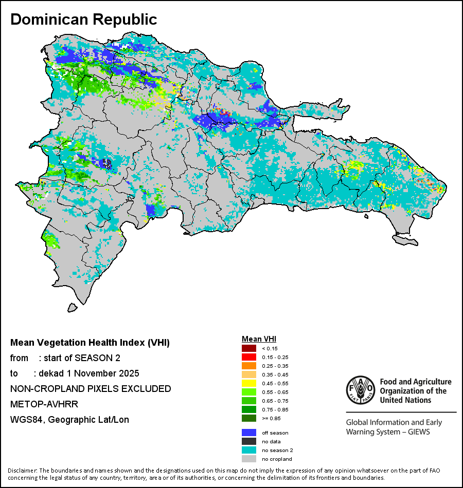 The Weighted Mean Vegetation Health Index (Weighted Mean VHI) allows the user to assess the severity of the drought from the start of the growing season, examining the vegetation health and the influence of temperature on plant conditions. The Mean VHI is an average of the dekadal VHI values over the crop growing season (from the start until the last dekad of analysis), weighted by crop coefficients (Kc), assigned to VHI values at the dekads corresponding to the Start of the Season (SOS), Maximum of the Season (MOS) and End of the Season (EOS). Crop coefficient is applied for the purpose of reflecting the crop’s water sensitivity at different phenology stages.