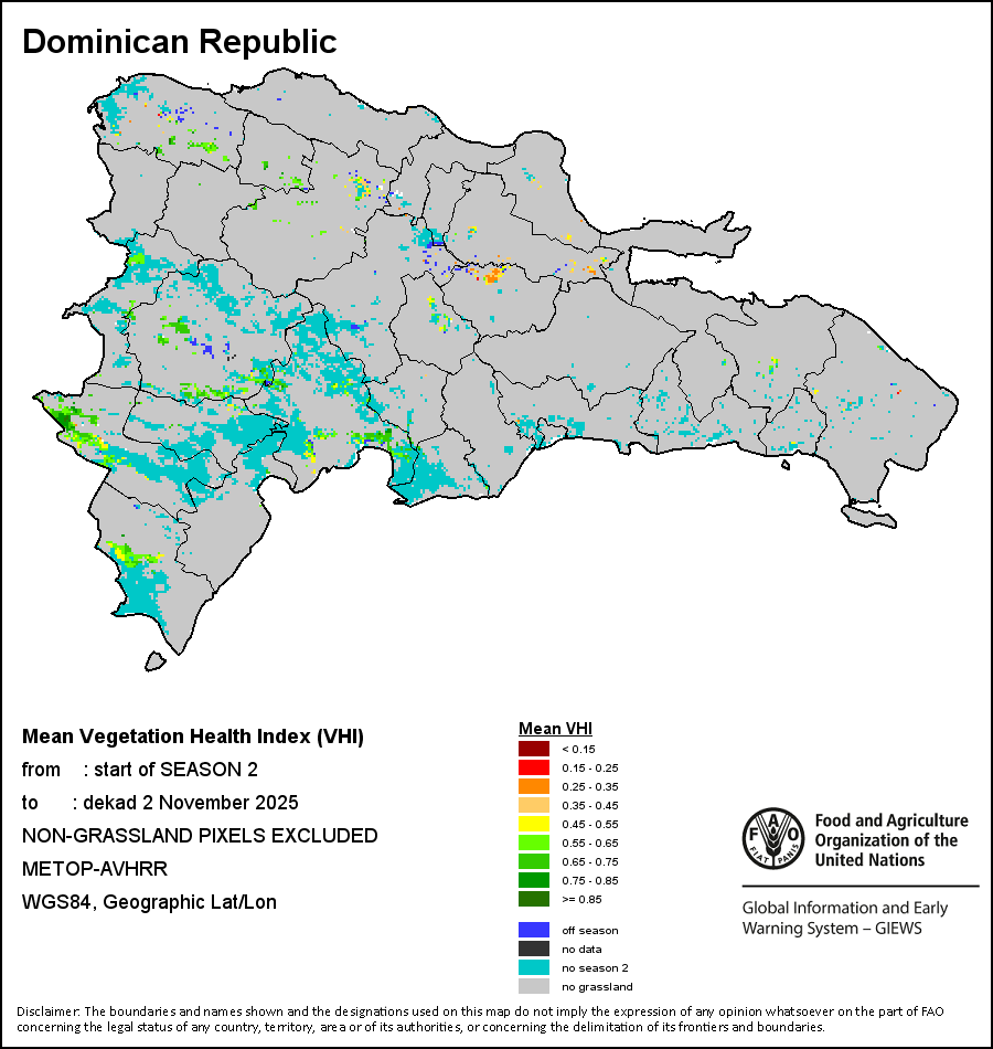 The Normalized Difference Vegetation Index (NDVI) measures the “greenness” of ground cover and is used as a proxy to indicate the density and health of vegetation. NDVI values range from +1 to -1, with high positive values corresponding to dense and healthy vegetation, and low and/or negative NDVI values indicating poor vegetation conditions or sparse vegetative cover. The NDVI anomaly indicates the variation of the current dekad to the long-term average, where a positive value (for example 20 percent) would signify enhanced vegetation conditions compared to the average, while a negative value (for instance -40 percent) would indicate comparatively poor vegetation conditions.