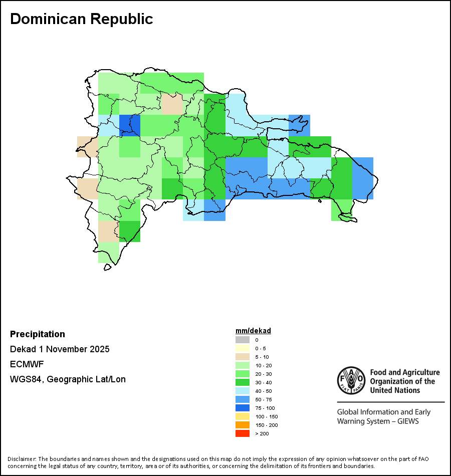 The map depicts cumulative rainfall volumes over a dekad (a 10-day period). Precipitation estimates for all African countries (except Cabo Verde and Mauritius) are taken from NOAA/FEWSNet, while for the remaining countries data is obtained from ECMWF.