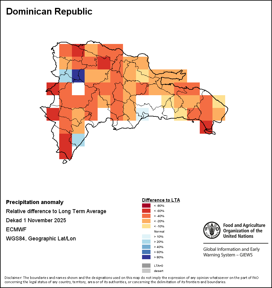 The map illustrates the difference between the current rainfall volume and the average level. Rainfall levels are compared with the Long-Term Average (LTA), which refers to the period 1989-2015. Warmer colours identify areas which have received lower-than-average rainfall, while colder colours are given to areas where precipitation has been above average.