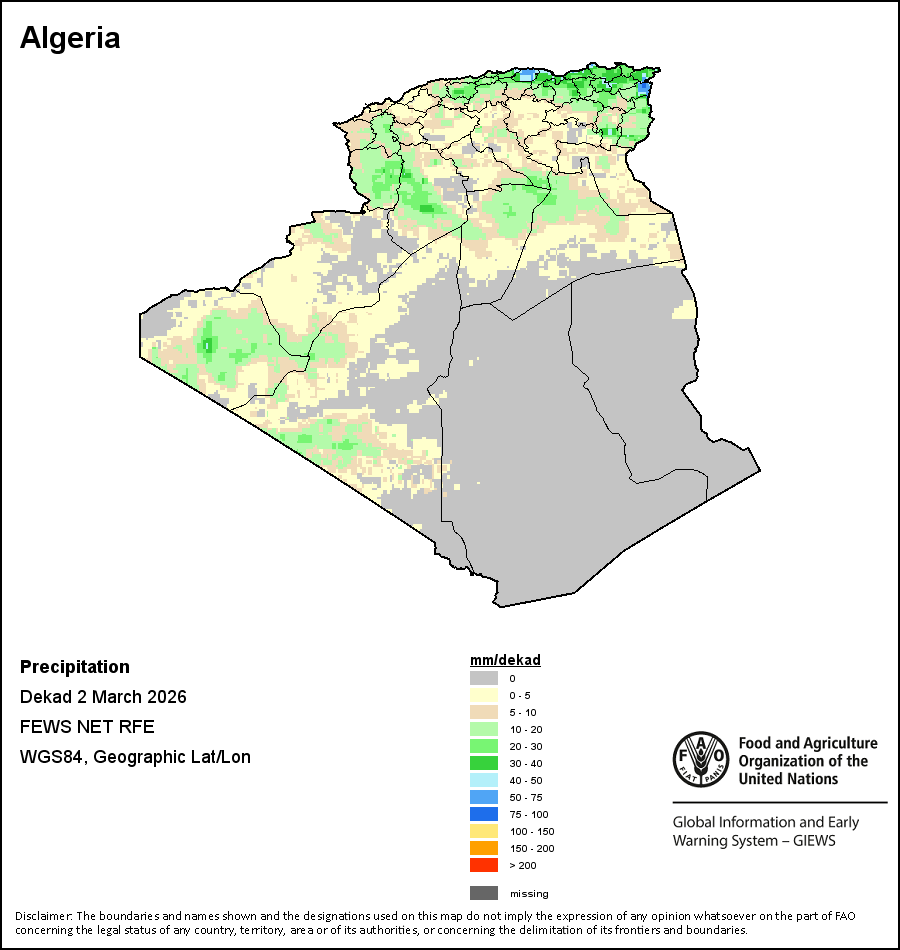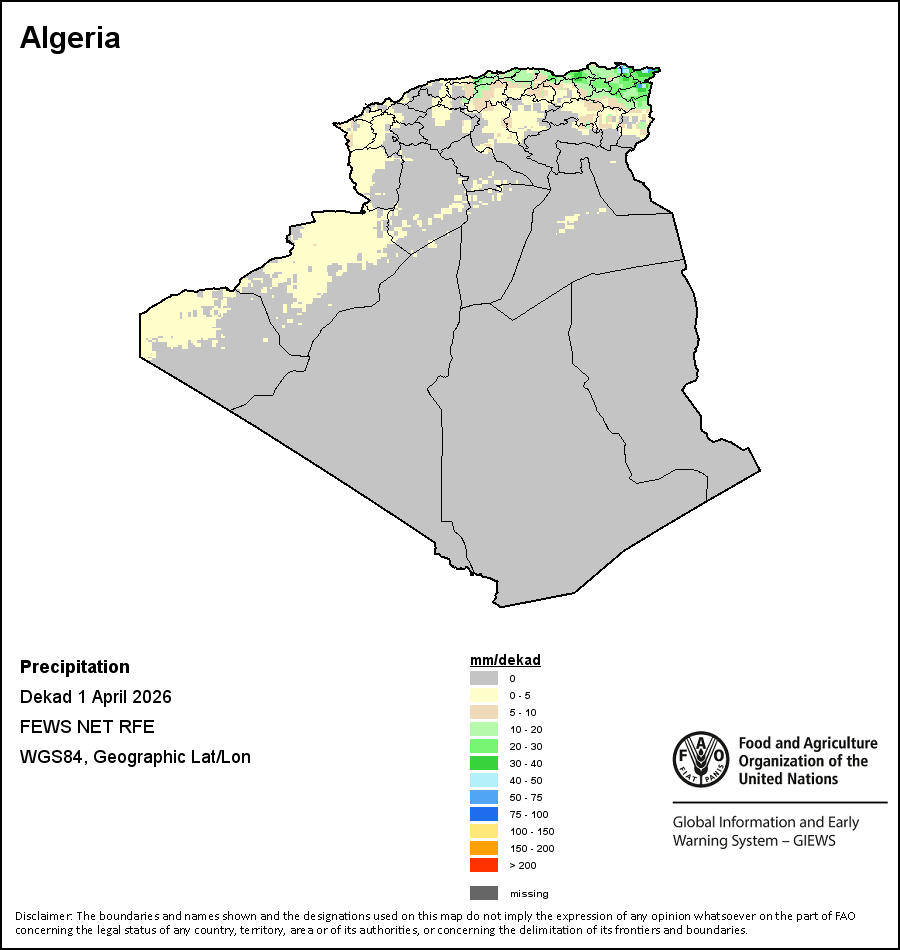 На картах и графиках на уровне страны показывается последний период в 36 месяцев по сезонным показателям, показателям растительного покрова и уровня атмосферных осадков. Данные представляются по 10-дневным периодам и по месяцам. Все три показателя растительного покрова основаны на 10-дневных данных по растительному покрову, полученных от сенсора METOR-AVHRR при разрешении в 1 км (начиная с 2007 года). Данные при разрешении в 1 км за период 1984-2006 гг. были получены из банка данных NOAA-AVHRR при разрешении в 16 км. Оценки атмосферных осадков для всех африканских стран (за исключением Кабо-Верде и Маврикия) получены из системы NOAA/Системы раннего предупреждения об опасности голода (разрешении в 16 km), а по остальным странам данные получены из системы ECMWF (разрешении в 25 km). Благодаря более высокой разрешающей способности показателей состояния растительного покрова (например, NDVI, VHI) по сравнению с показателями осадков, у некоторых стран количество субнациональных единиц, для которых можно получить действительную статистику по данным показателям, больше, чем по показателям осадков.