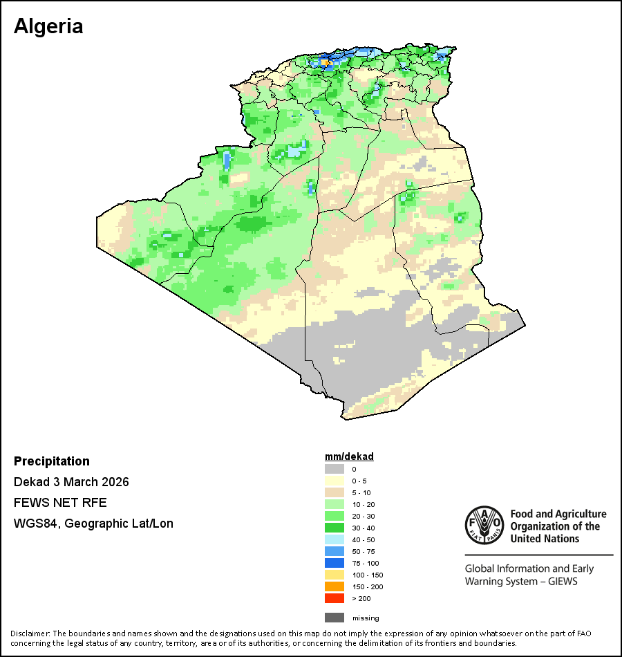 На карте изображены кумулятивные объемы осадков в декаду (10-дневный период). Оценки атмосферных осадков для всех африканских стран (за исключением Кабо-Верде и Маврикия) получены из системы NOAA/Системы раннего предупреждения об опасности голода, а по остальным странам данные получены из системы ECMWF.