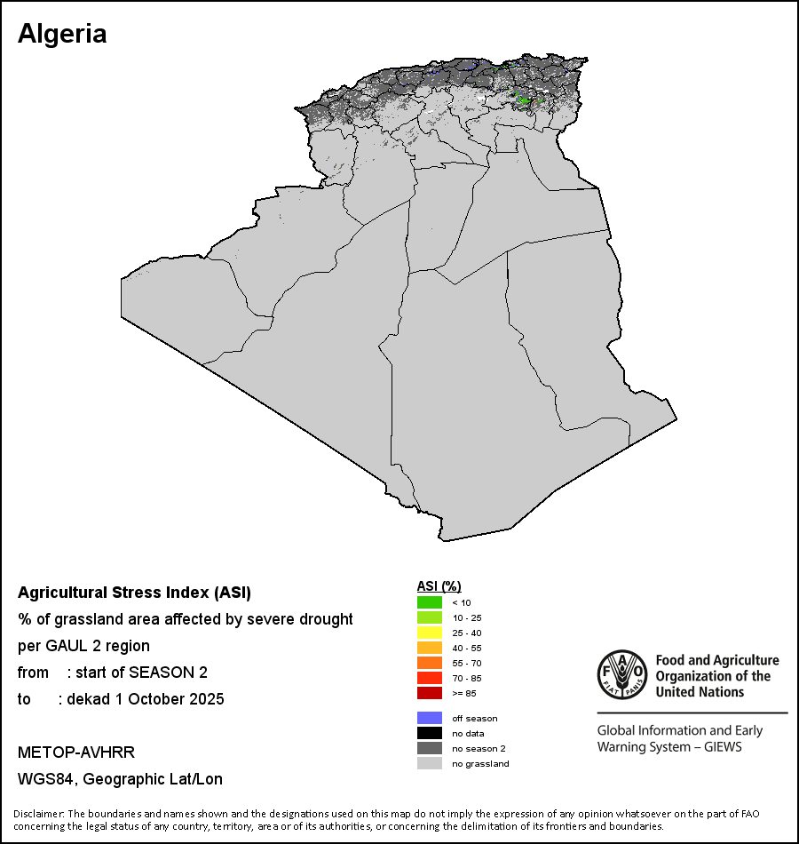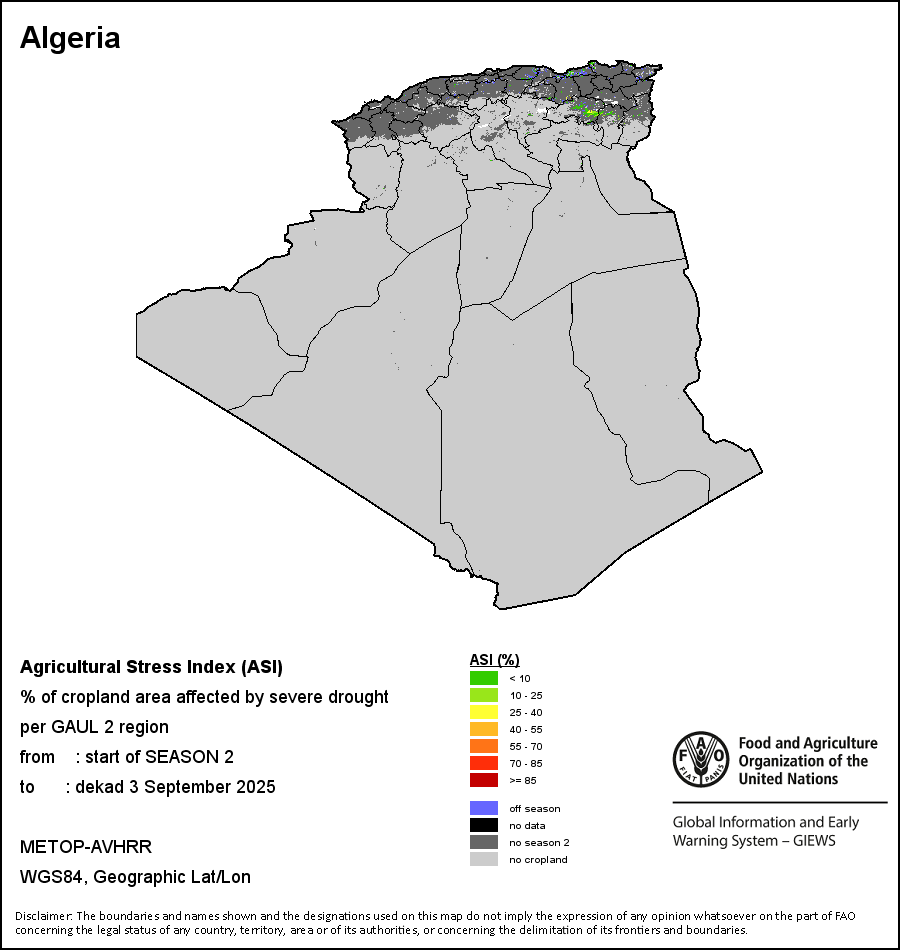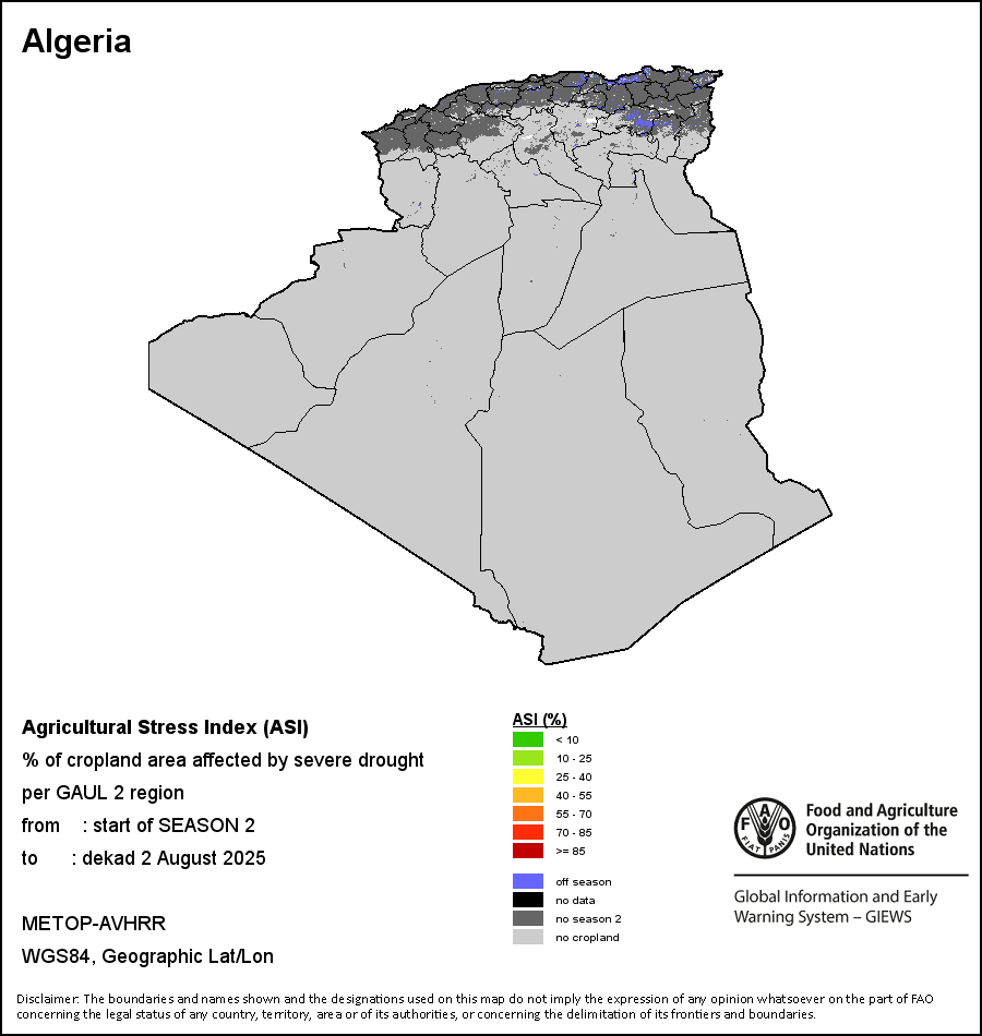 农业干旱胁迫指数(ASI)是一项速览指数,有助于在早期甄别较大可能发生水胁迫(干旱)的耕地。 该指数通过整合植被健康指数(VHI)在评估农业旱情方面具有关键意义的两个维度,即时间和空间维度,而得出。计算农业干旱胁迫指数的第一步是求植被健康指数的时间平均值,对作物周期内旱情的强度和时长进行像素级评估;这项计算包括采用作物系数衡量某种作物在各物候阶段对干旱胁迫的敏感度。第二步是确定旱情的空间广度,方法是计算植被健康指数值低于35%(Kogan前期研究将这一数值确定为评估干旱程度的临界值,1995年)的耕地的像素百分比。然后把各个行政区域根据受影响面积的百分比进行划分,便于对结果进行快速解读。