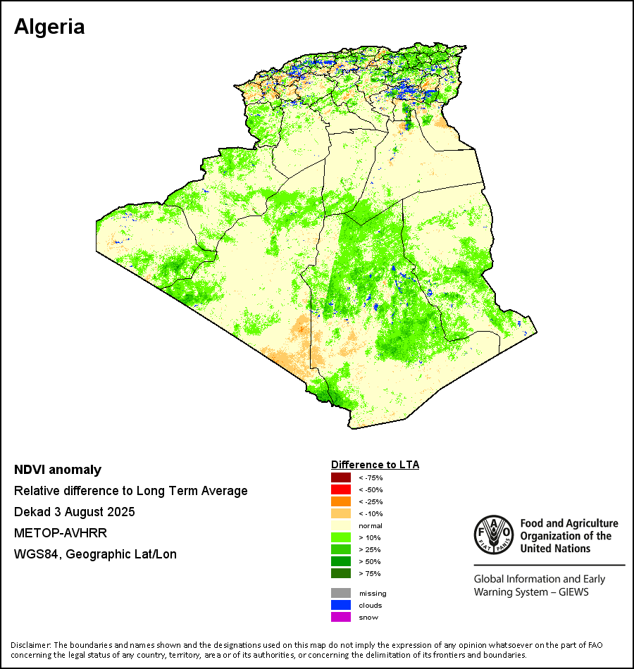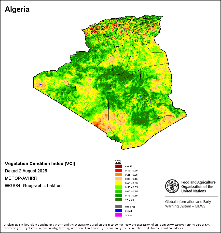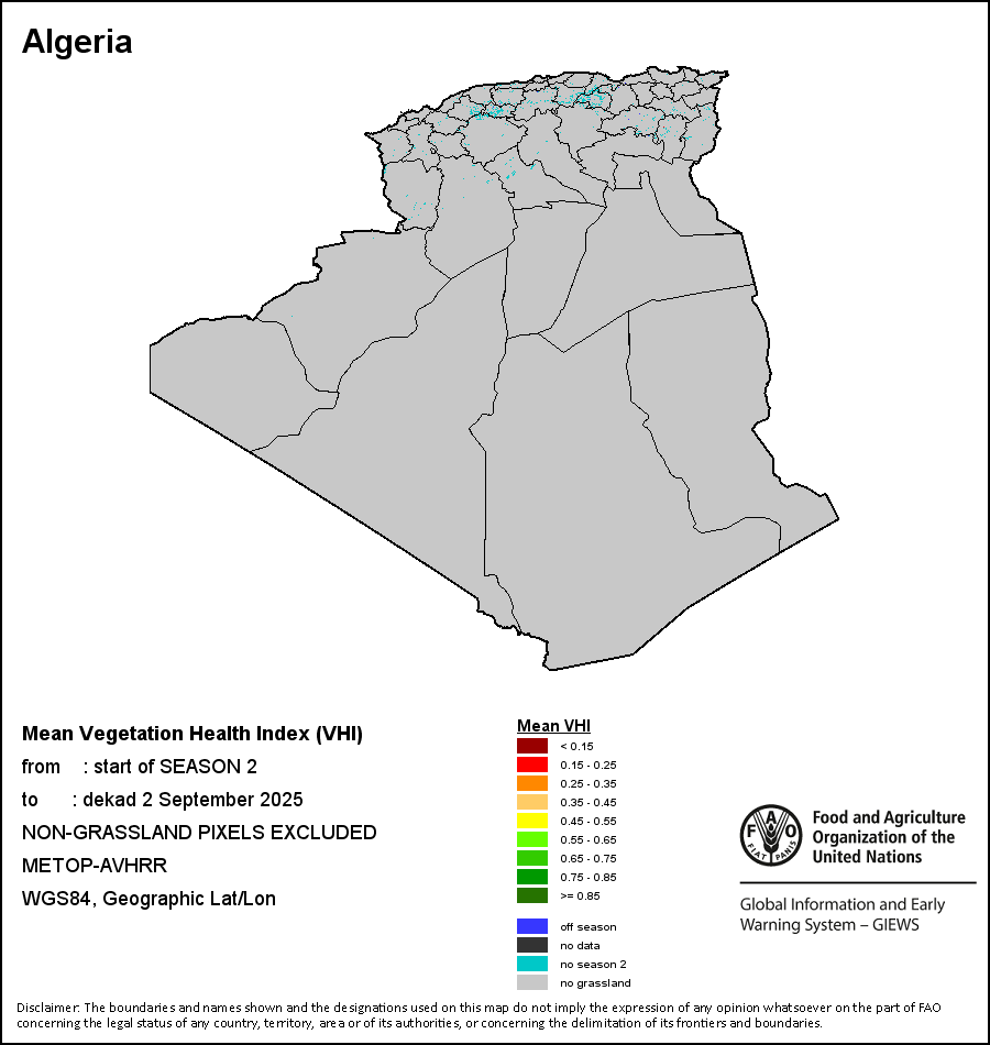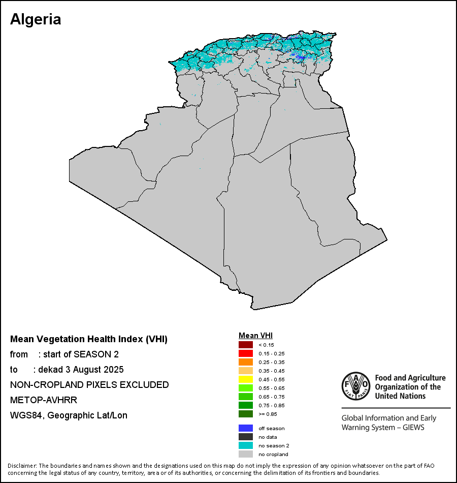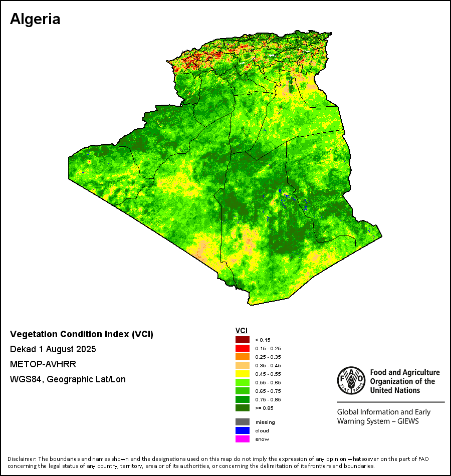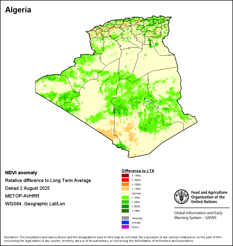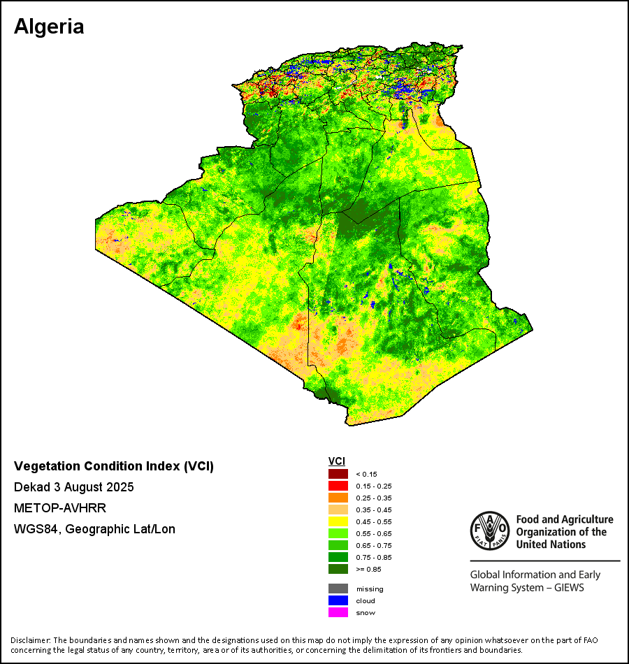 国别地图和图表显示的是最近36个月期间的季节、植被和降水指标。数据按每10天和每月呈现。   更多