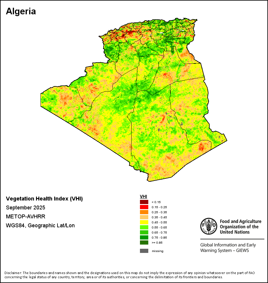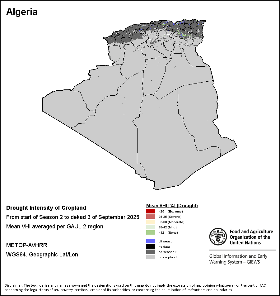 农业干旱依据其强度划分为四类:极端、严重、重度或轻度。干旱的强度通过各全球行政单位分层制度二级区域(GAUL 2)地区累积加权平均植被健康指数计算得出,意味着植被健康状况越差旱情就越严重。