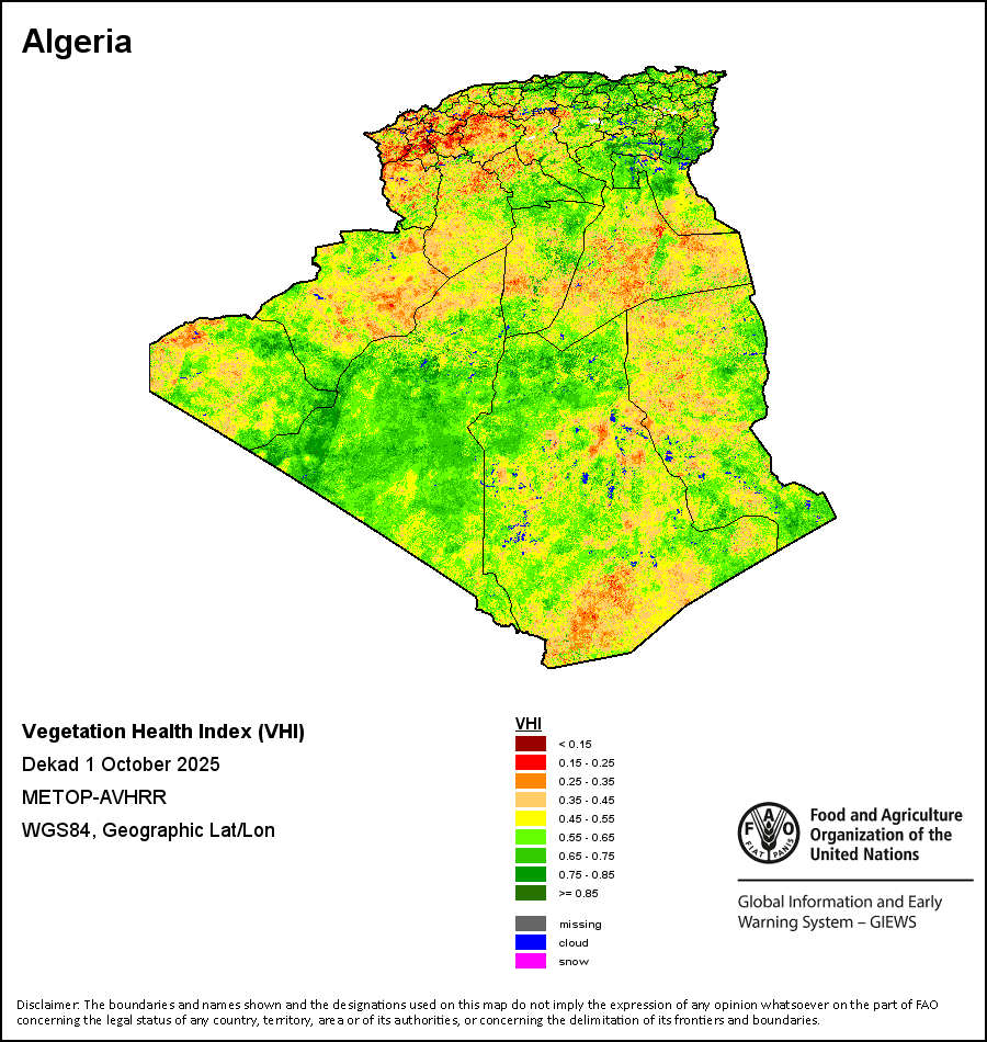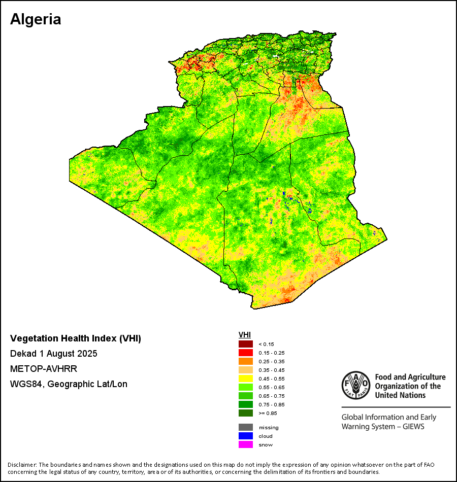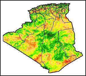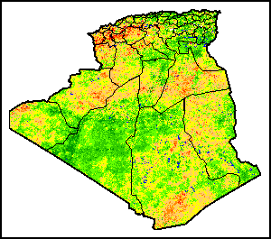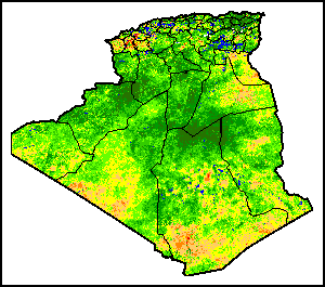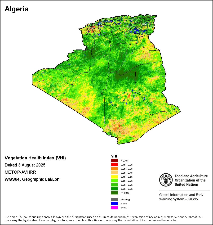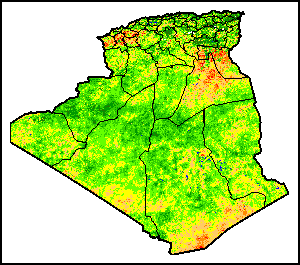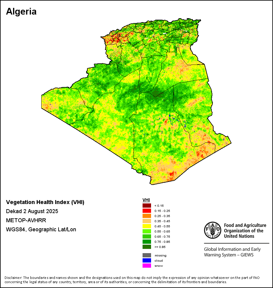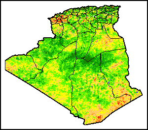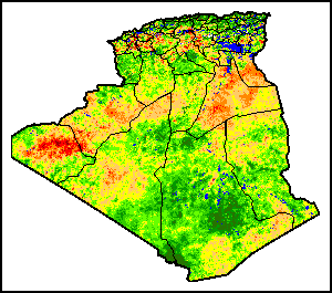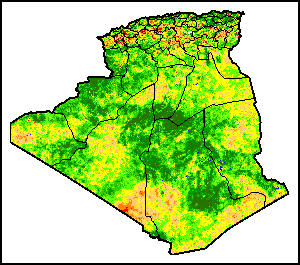 植被健康指数(VHI)根据植被健康状况以及气温对作物状况的影响情况显示干旱的严重程度。 VHI是一项综合指数,是用于计算ASI的基础性指标。它结合了植被状况指数(VCI)和气温状况指数(TCI)。TCI的计算采用了与VCI类似的方程,但它把当前气温与长期最高和最低值联系起来,因为一个假定前提是气温越高就倾向于造成植被状况恶化。比方说,VHI指数下降就意味着植被状况相对较差,而气温越高则意味着植被状况受到胁迫,较长时间延续则成为干旱的指征。VHI映像针对两个主要季节进行计算并分为三种时间模式:旬度、月度和年度。