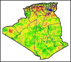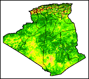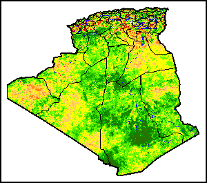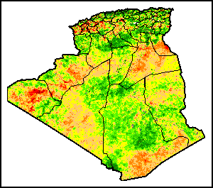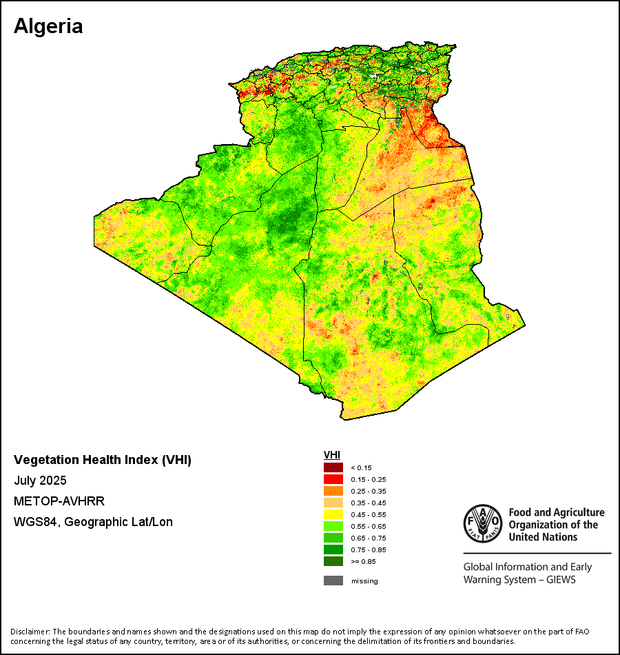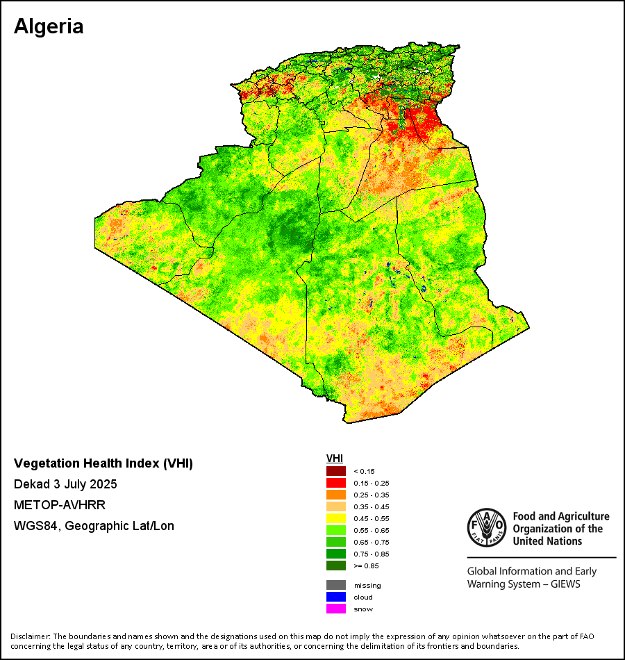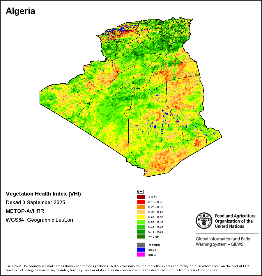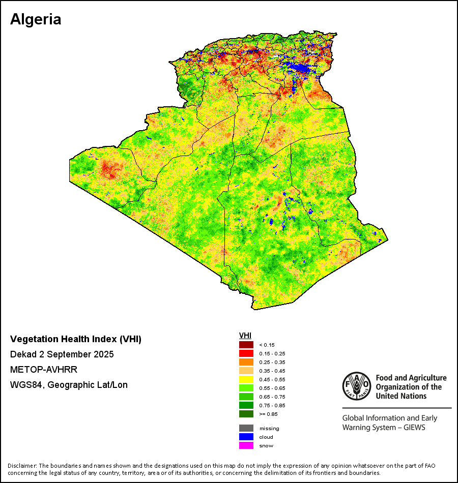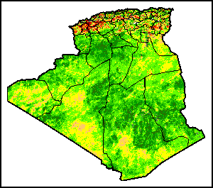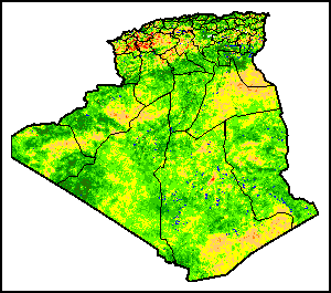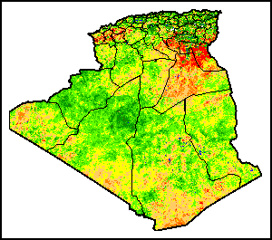 植被健康指数(VHI)根据植被健康状况以及气温对作物状况的影响情况显示干旱的严重程度。 VHI是一项综合指数,是用于计算ASI的基础性指标。它结合了植被状况指数(VCI)和气温状况指数(TCI)。TCI的计算采用了与VCI类似的方程,但它把当前气温与长期最高和最低值联系起来,因为一个假定前提是气温越高就倾向于造成植被状况恶化。比方说,VHI指数下降就意味着植被状况相对较差,而气温越高则意味着植被状况受到胁迫,较长时间延续则成为干旱的指征。VHI映像针对两个主要季节进行计算并分为三种时间模式:旬度、月度和年度。