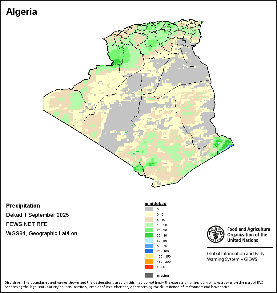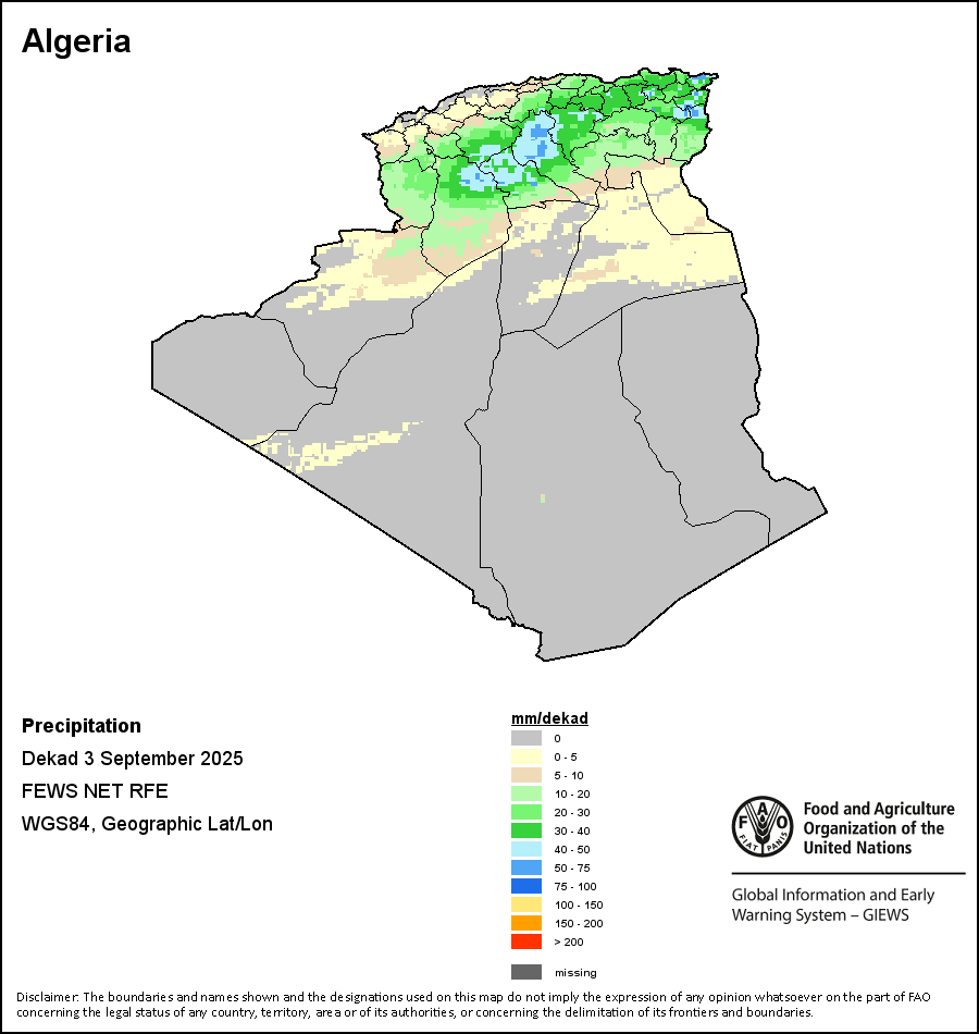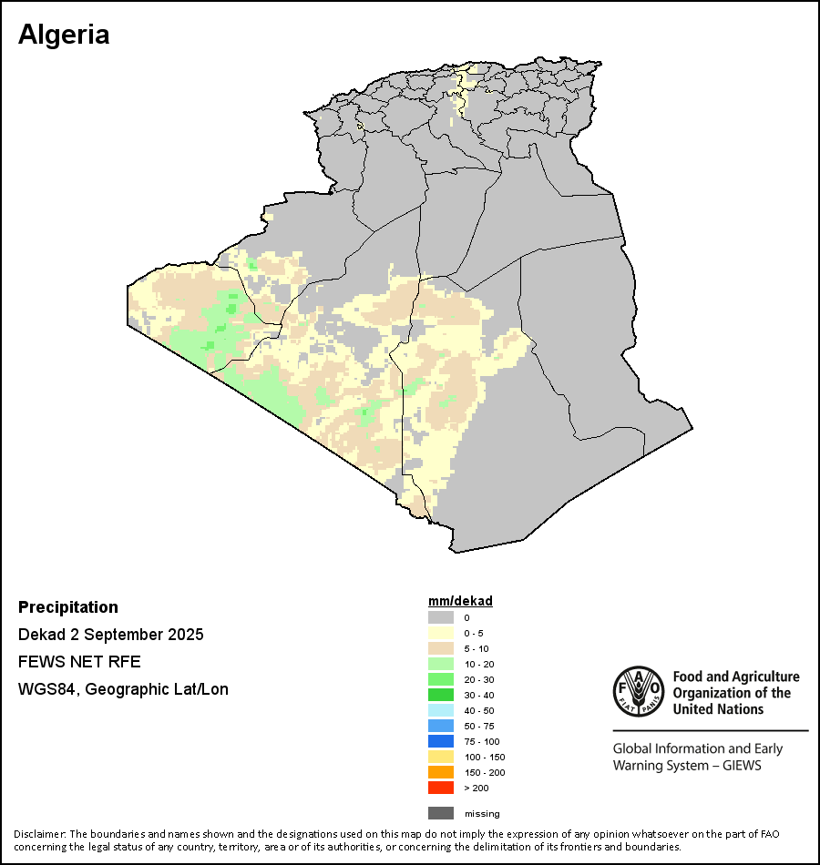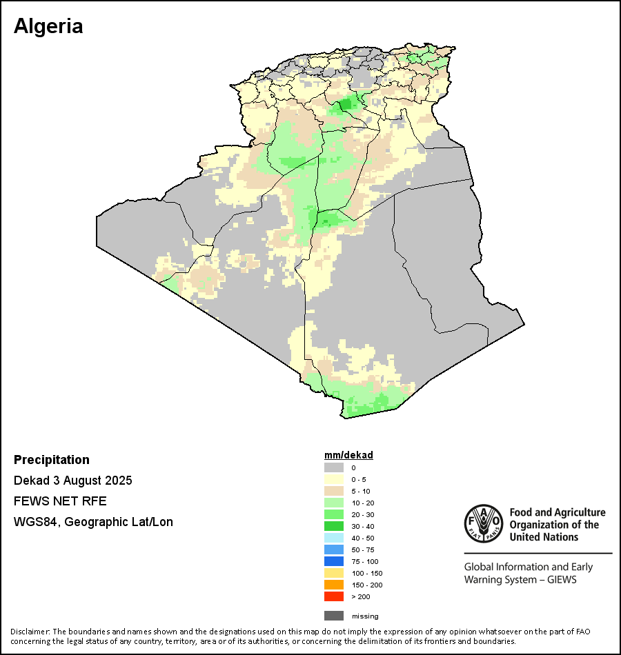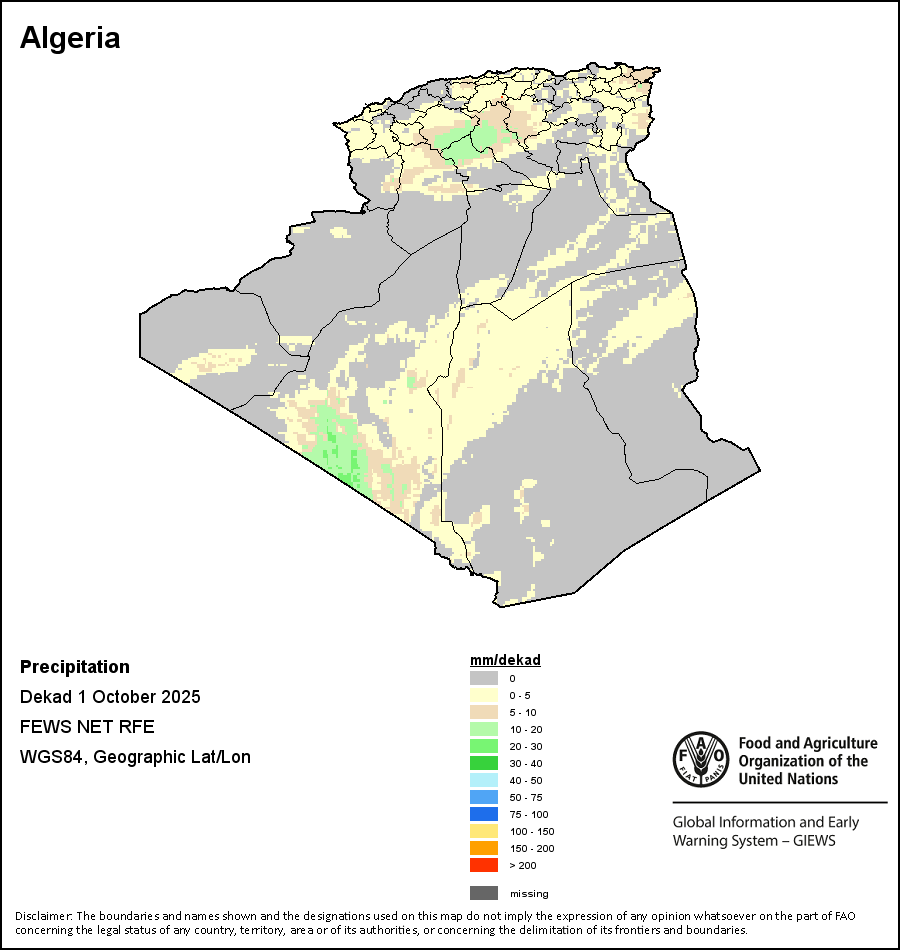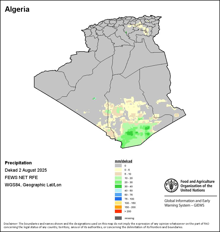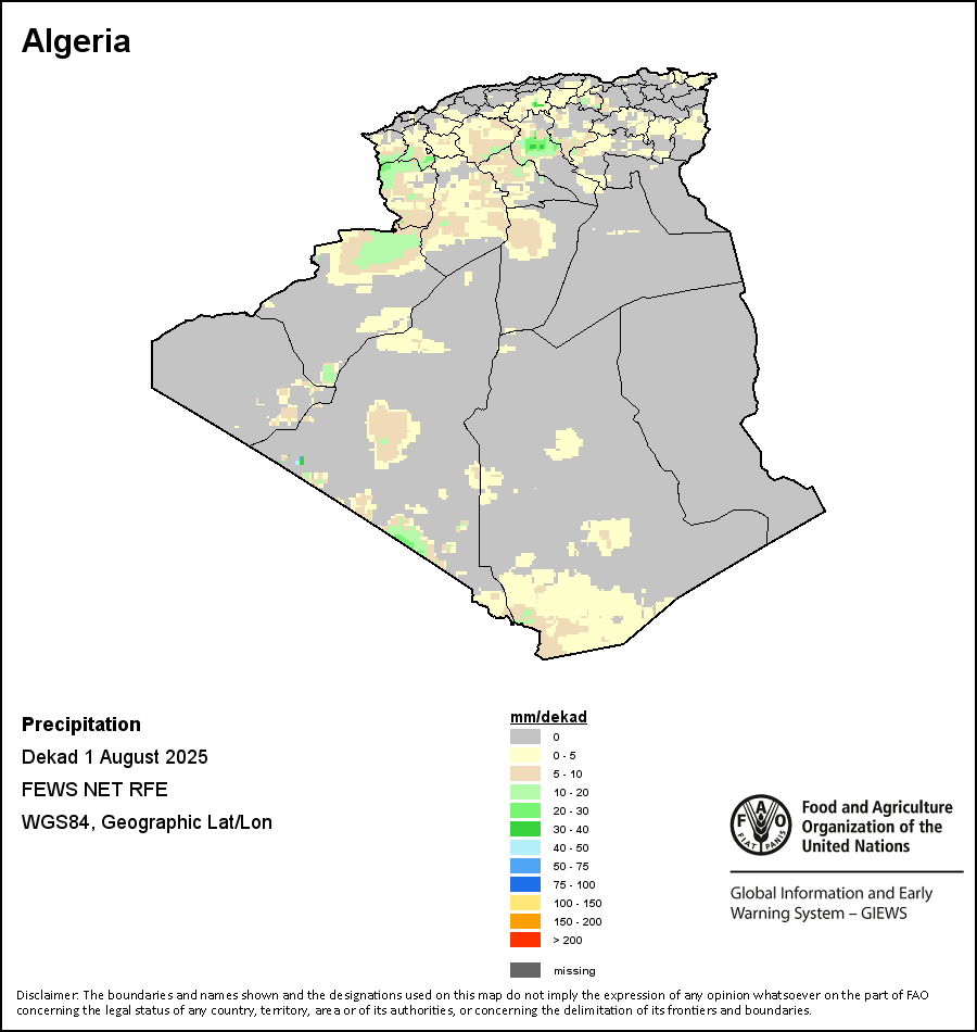 该图谱显示了每一旬(十天)的累积降水量。 所有非洲国家的降水量估算(除佛得角和毛里求斯外)均取自NOAA/FEWSNet,其他国家则取自ECMWF。