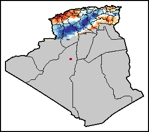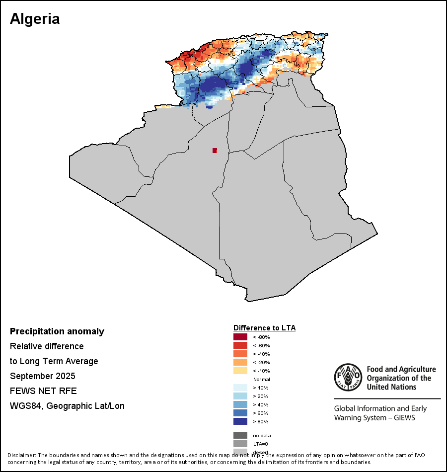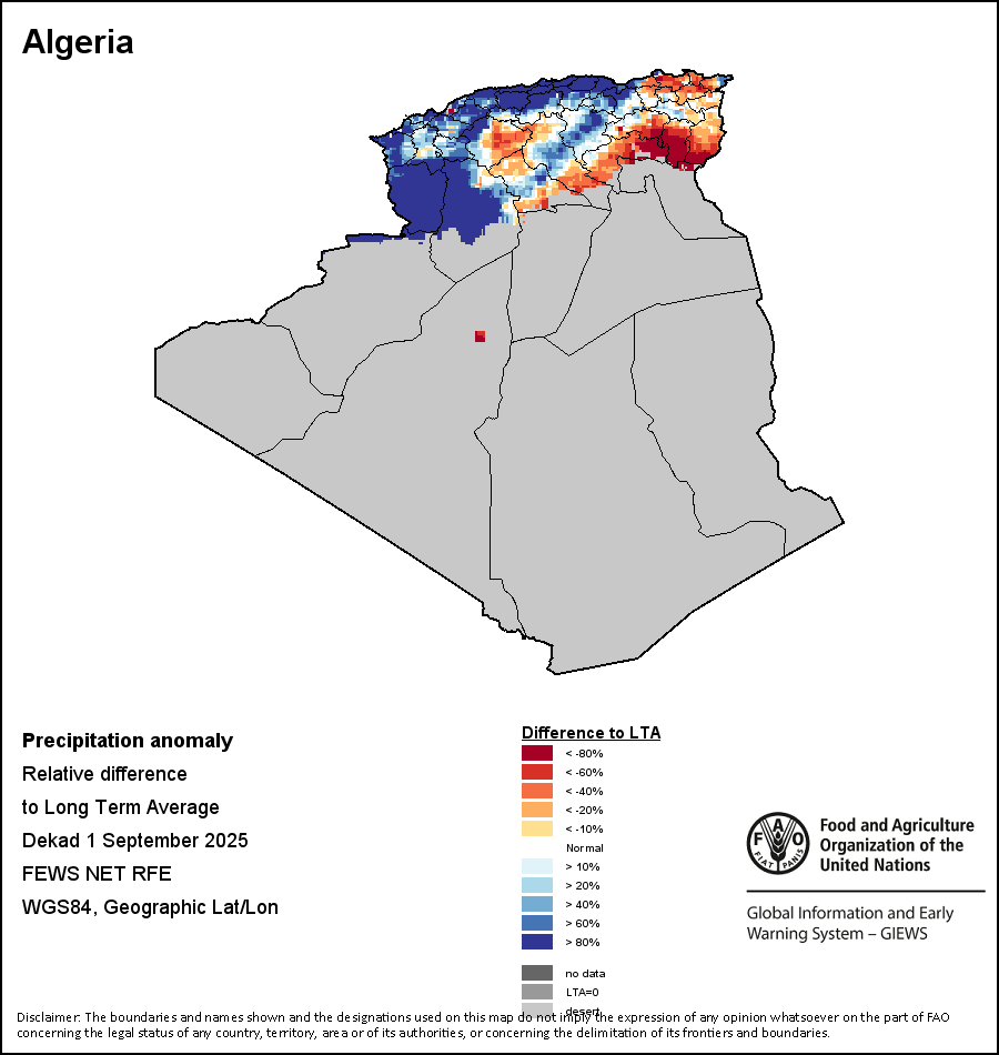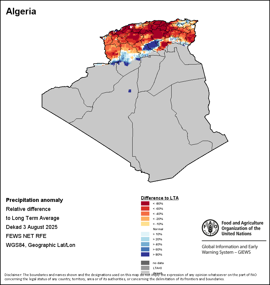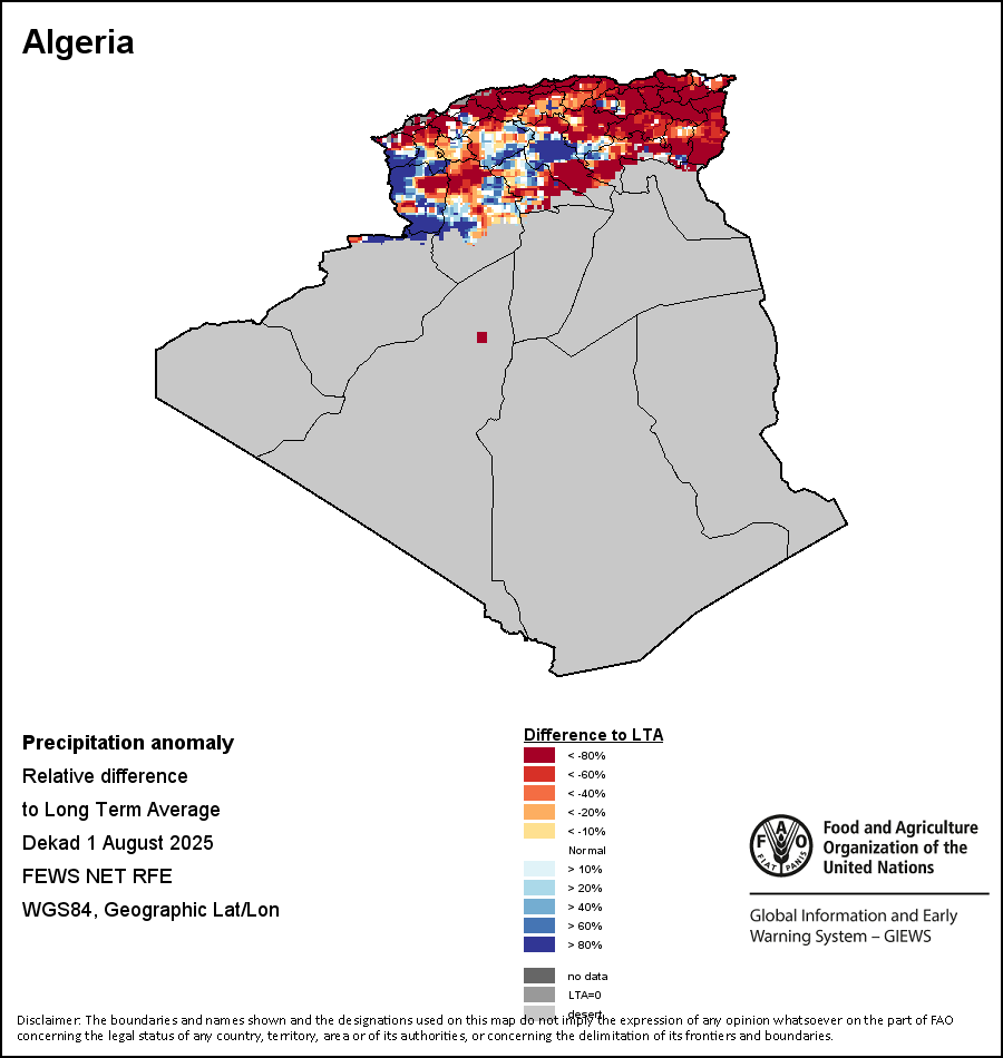 该图谱显示了当前降水量与平均水平之间的差异。 由降水量水平与长期平均值(LTA)进行比较得出,长期平均值系指1989-2015年期间的数值。暖色调指示的是降水量低于平均水平的地区,而冷色调指示的则是降水量高于平均水平的地区。降雨量估算数据来自欧洲中期天气预报这些(ECMWF)。