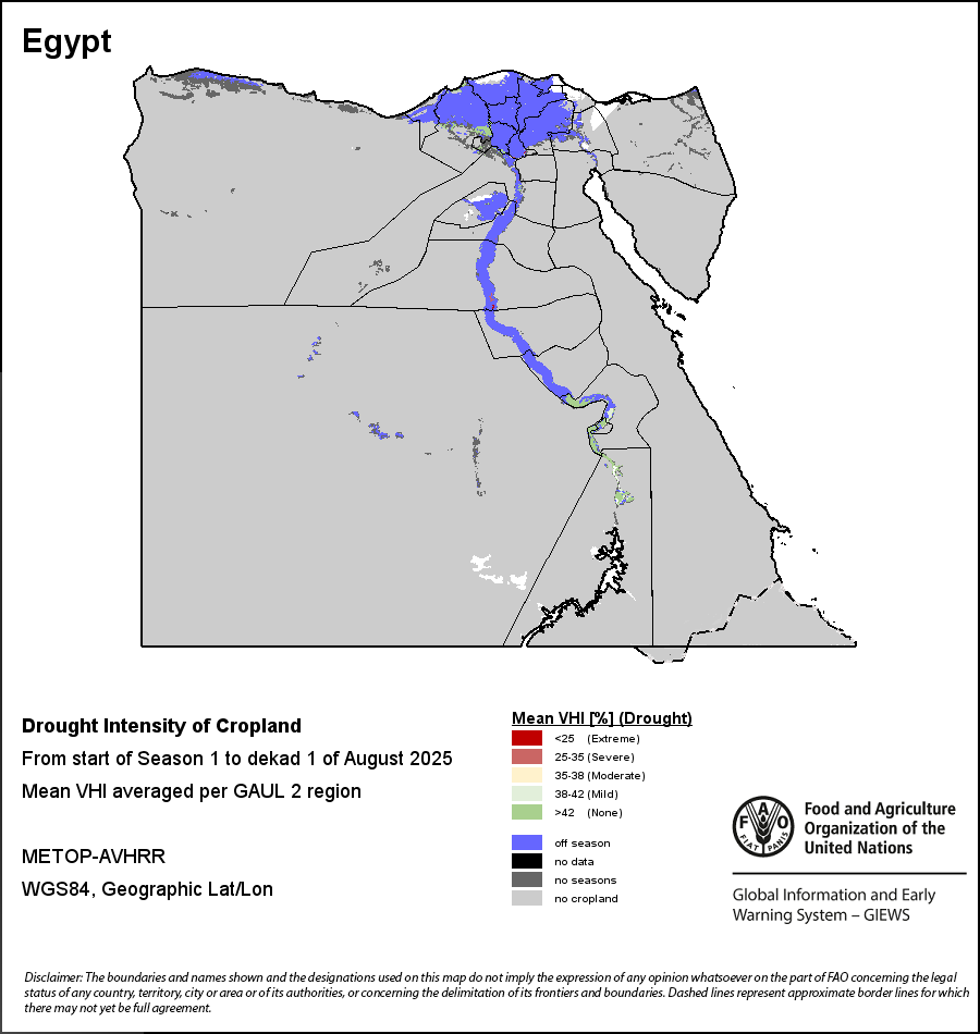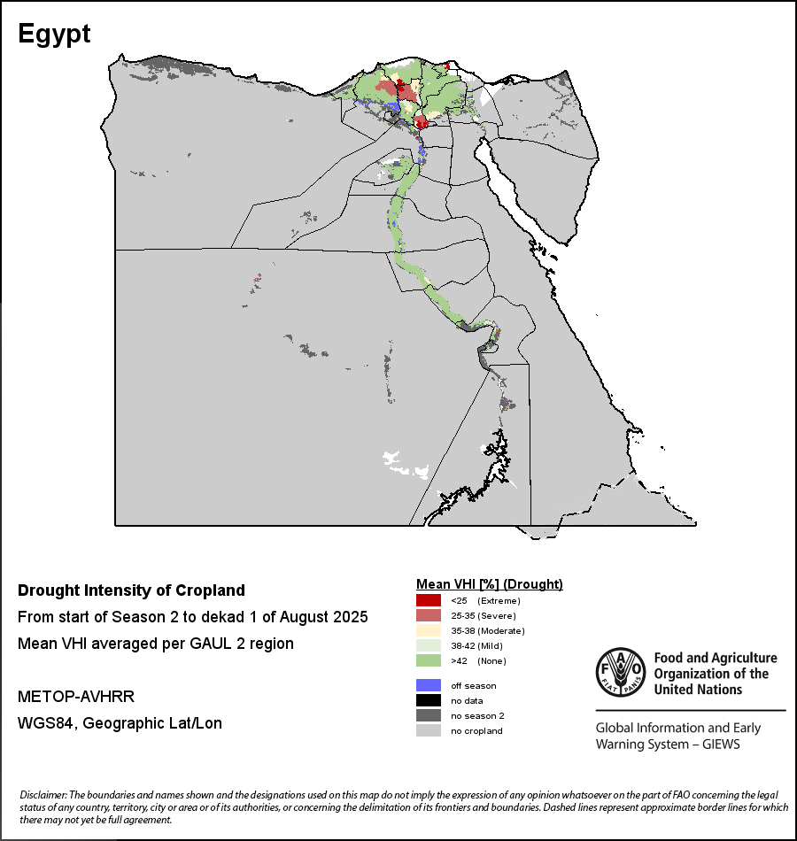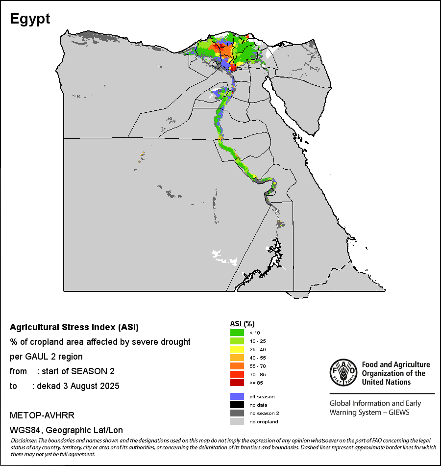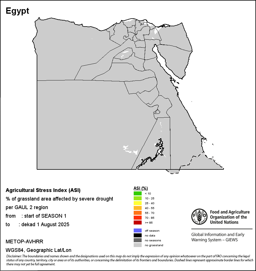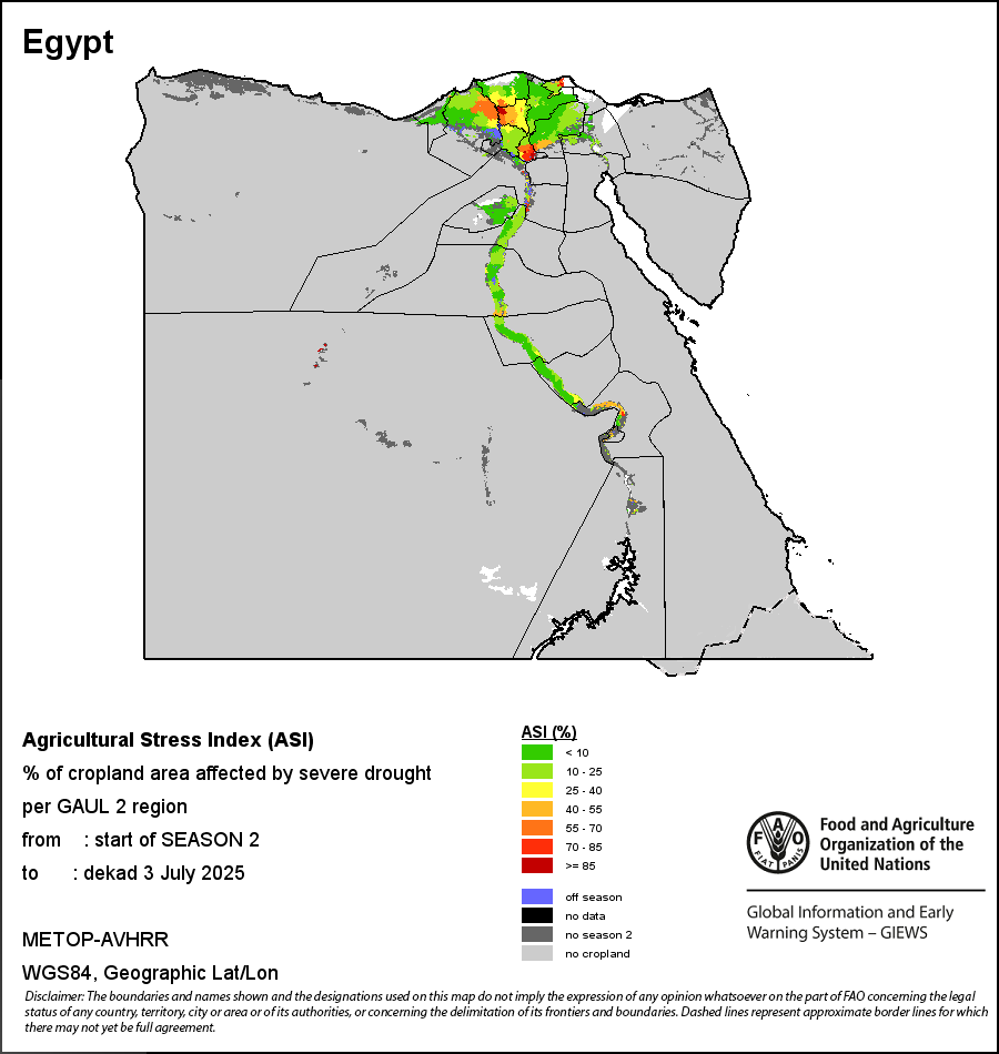 The Agricultural Stress Index (ASI) is a quick-look indicator that facilitates the early identification of cropped land with a high likelihood of water stress (drought). The Index is based on the integration of the Vegetation Health Index (VHI) in two dimensions that are critical in the assessment of a drought event in agriculture: temporal and spatial. The first step of the ASI calculation is a temporal averaging of the VHI, assessing the intensity and duration of dry periods occurring during the crop cycle at the pixel level; this calculation includes the use of crop coefficients, which introduces sensitivity of a crop to water stress during each phenological phase. The second step determines the spatial extent of drought events by calculating the percentage of pixels in arable areas with a VHI value below 35 percent (this value was identified as a critical threshold in assessing the extent of drought in previous research by Kogan, 1995). Each administrative area is classified according to the percentage of the affected area to facilitate the quick interpretation of results.