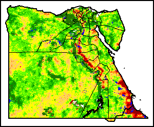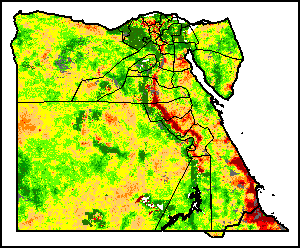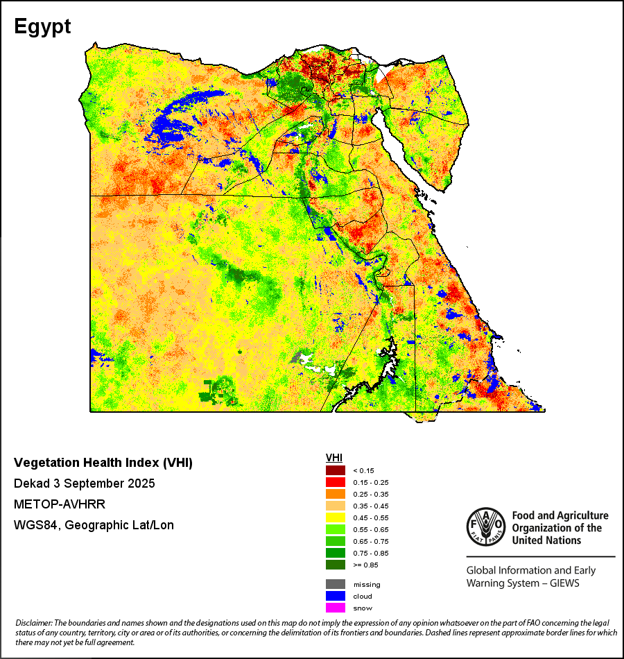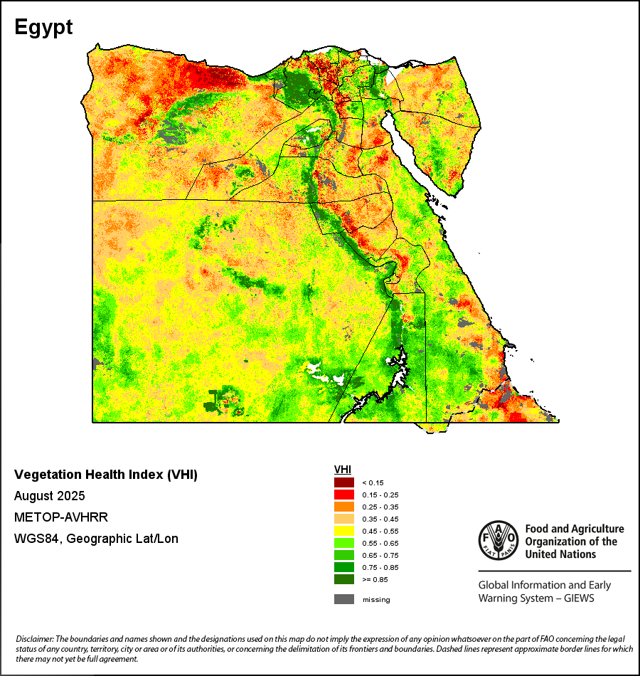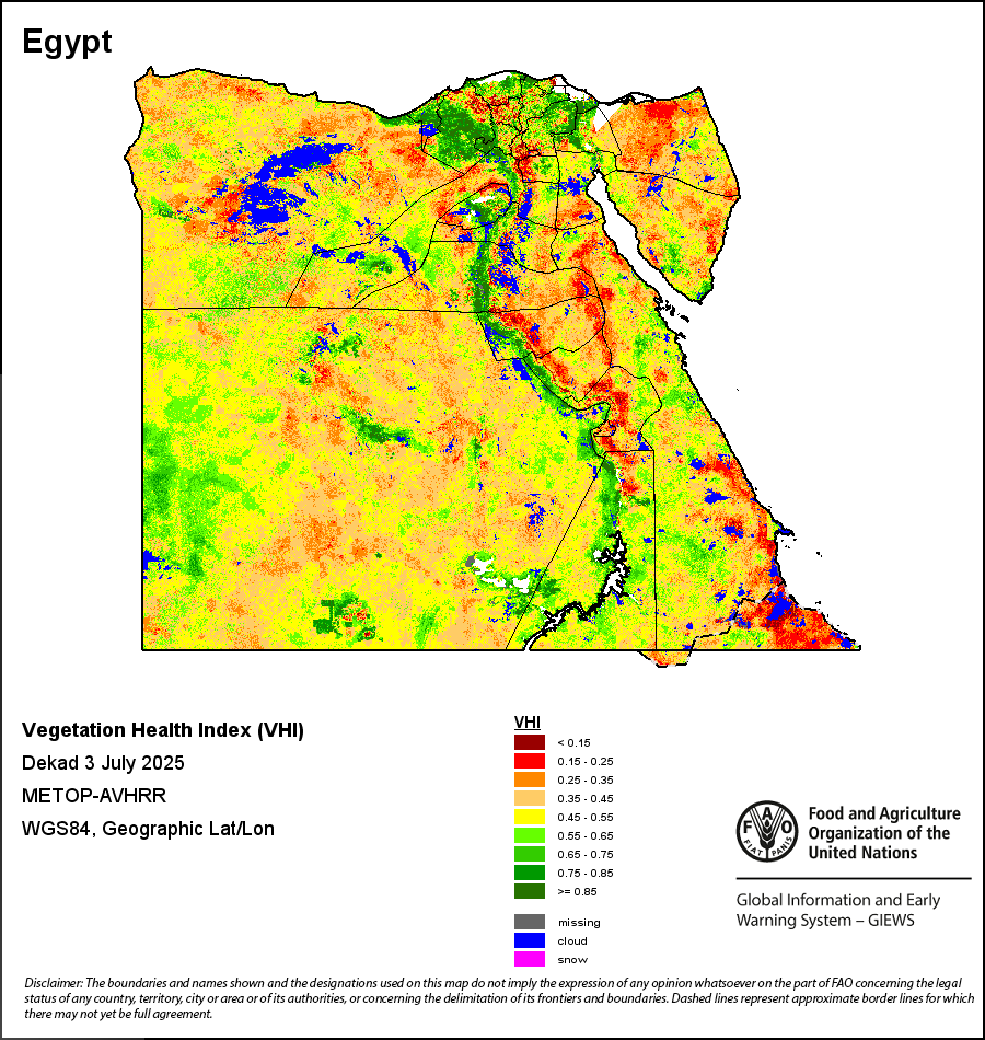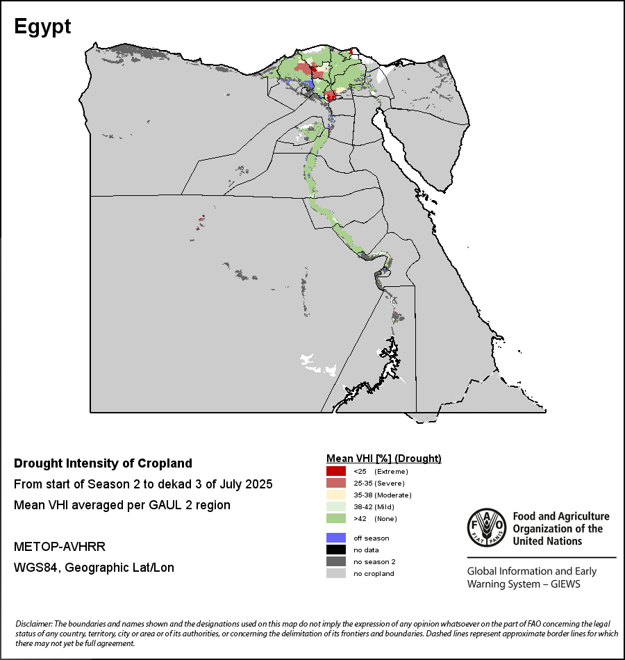 The Agricultural Stress Index (ASI) is a quick-look indicator that facilitates the early identification of cropped land with a high likelihood of water stress (drought). The Index is based on the integration of the Vegetation Health Index (VHI) in two dimensions that are critical in the assessment of a drought event in agriculture: temporal and spatial. The first step of the ASI calculation is a temporal averaging of the VHI, assessing the intensity and duration of dry periods occurring during the crop cycle at the pixel level; this calculation includes the use of crop coefficients, which introduces sensitivity of a crop to water stress during each phenological phase. The second step determines the spatial extent of drought events by calculating the percentage of pixels in arable areas with a VHI value below 35 percent (this value was identified as a critical threshold in assessing the extent of drought in previous research by Kogan, 1995). Each administrative area is classified according to the percentage of the affected area to facilitate the quick interpretation of results.