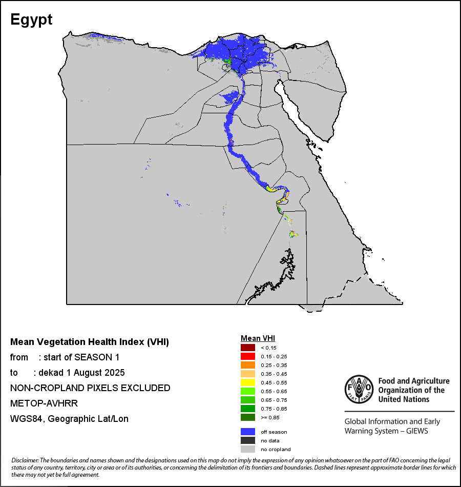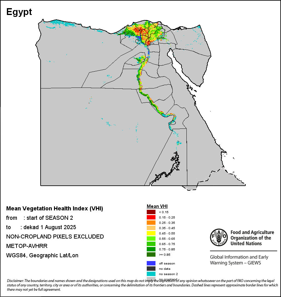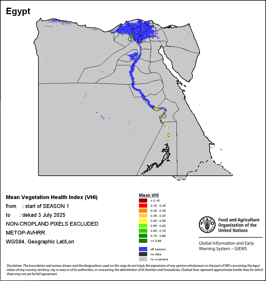 The Weighted Mean Vegetation Health Index (Weighted Mean VHI) allows the user to assess the severity of the drought from the start of the growing season, examining the vegetation health and the influence of temperature on plant conditions. The Mean VHI is an average of the dekadal VHI values over the crop growing season (from the start until the last dekad of analysis), weighted by crop coefficients (Kc), assigned to VHI values at the dekads corresponding to the Start of the Season (SOS), Maximum of the Season (MOS) and End of the Season (EOS). Crop coefficient is applied for the purpose of reflecting the crop’s water sensitivity at different phenology stages.