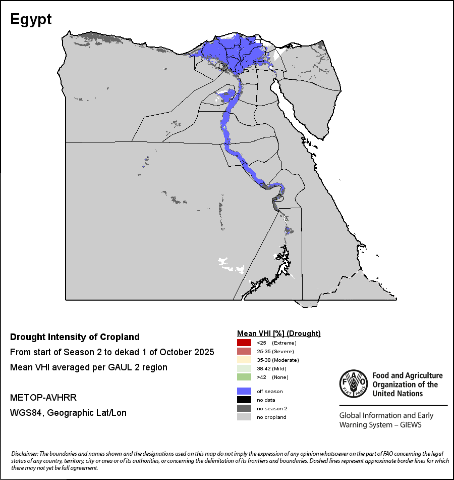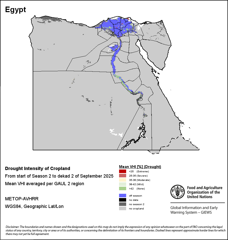 Agricultural droughts are classified by their intensity and are categorized into four classes: Extreme, Severe, Moderate or Mild. The intensity of the drought is calculated through the Weighted Mean Vegetation Health Index aggregated per GAUL 2 region, indicating that the poorer the vegetation health the more severe the drought.