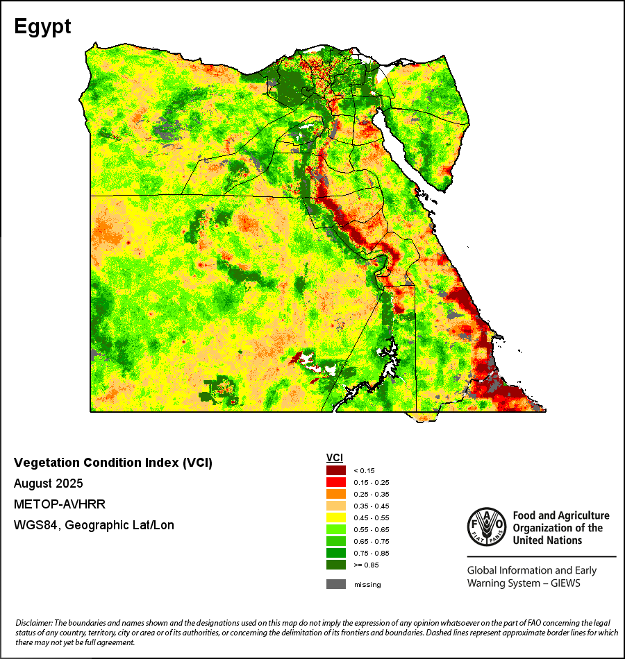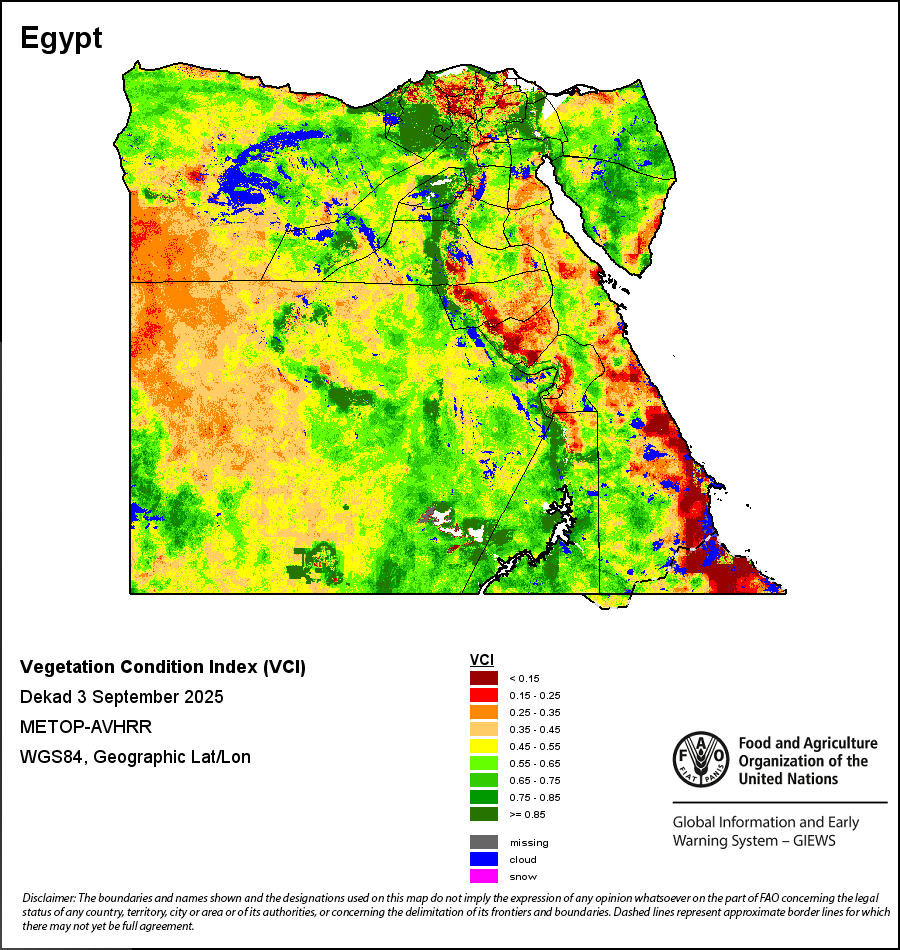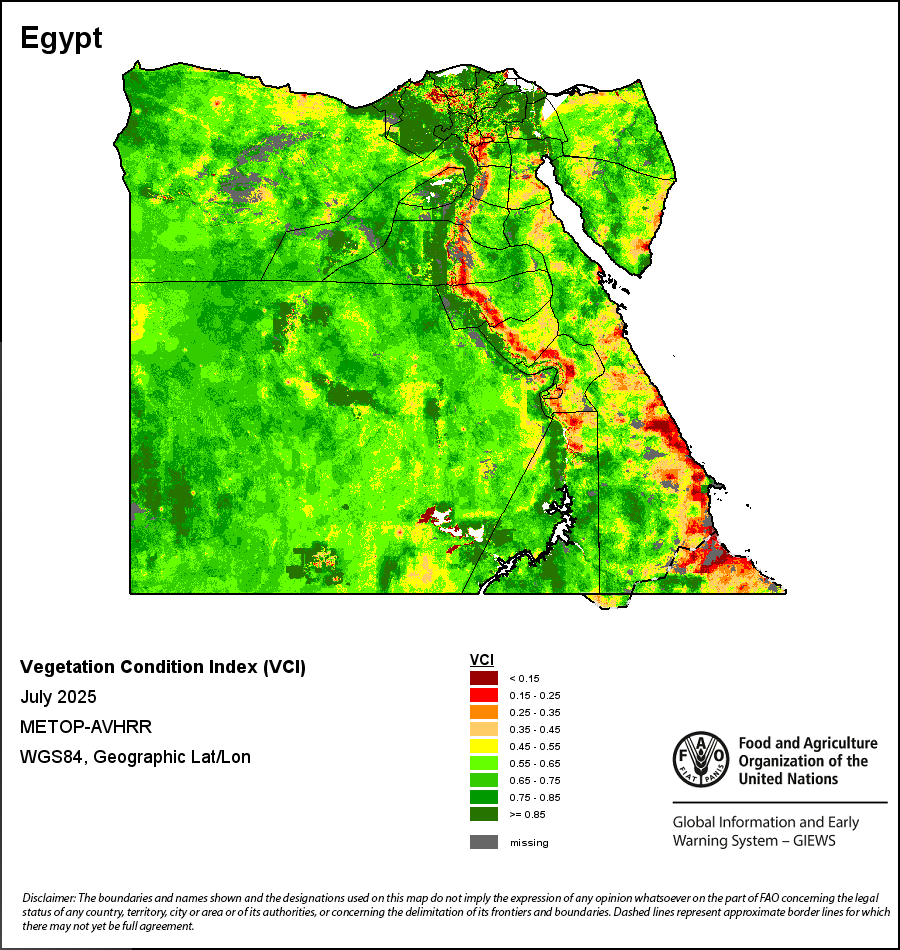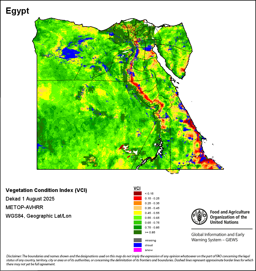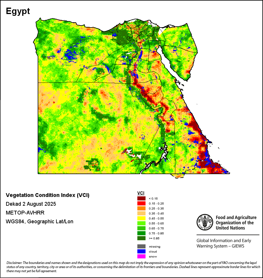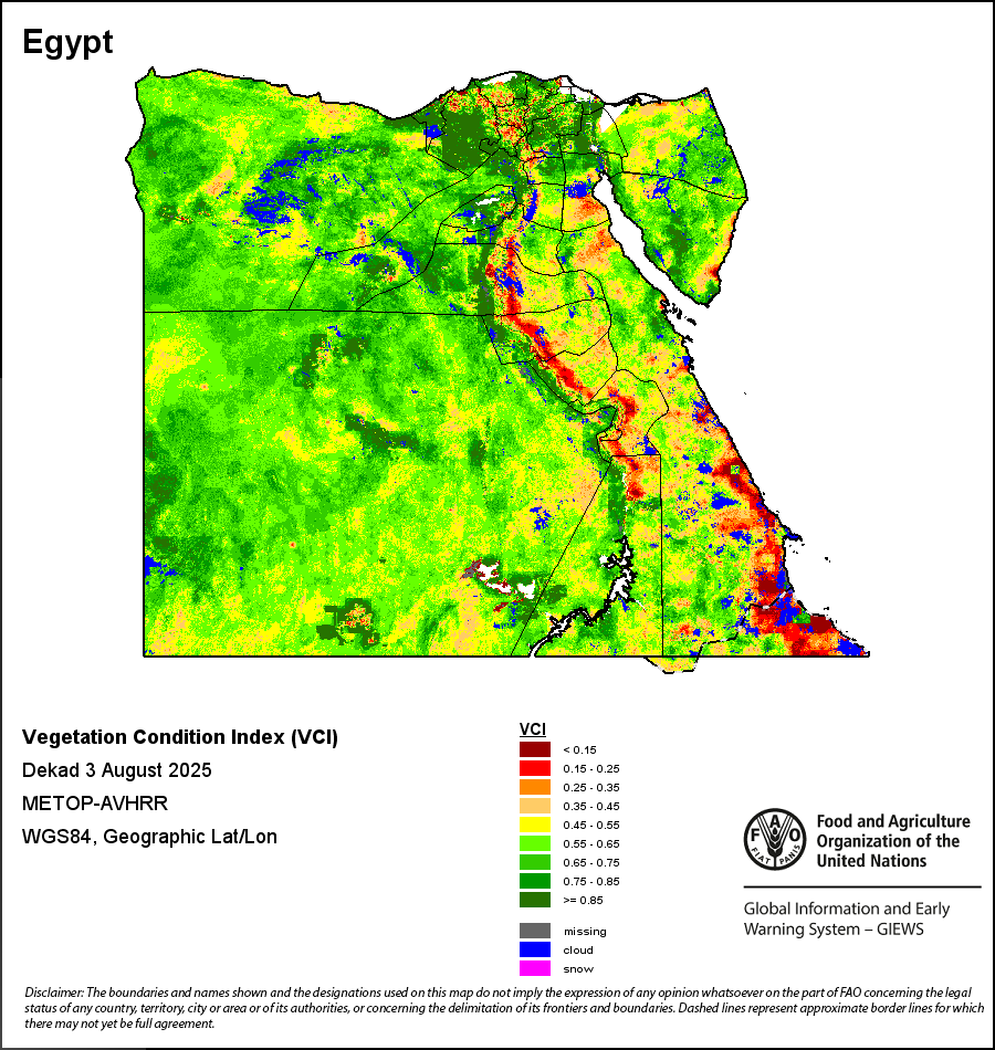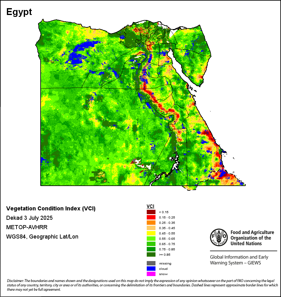 The Vegetation Condition Index (VCI) evaluates the current vegetation health in comparison to the historical trends. The VCI relates current dekadal Normalized Difference Vegetation Index (NDVI) to its long-term minimum and maximum, normalized by the historical range of NDVI values for the same dekad. The VCI was designed to separate the weather-related component of the NDVI from the ecological element.