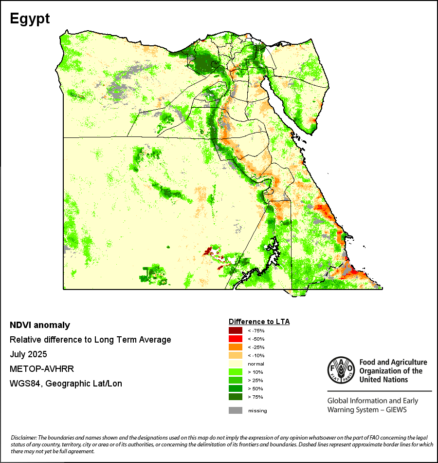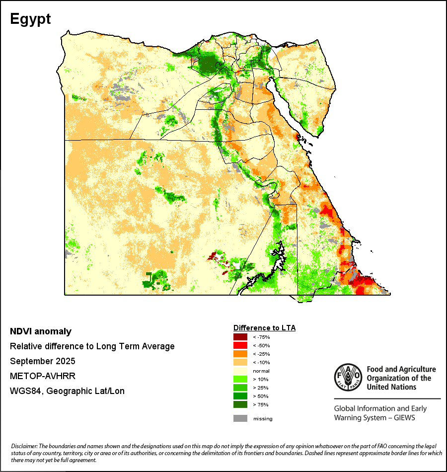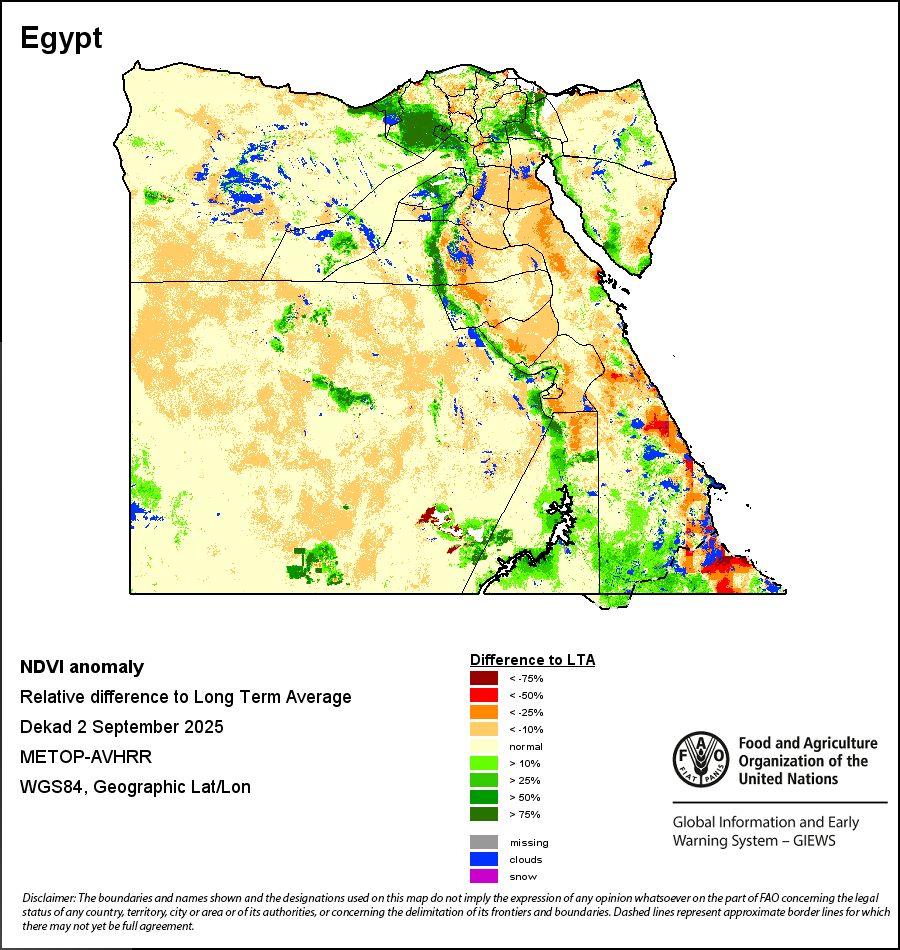 The Normalized Difference Vegetation Index (NDVI) measures the “greenness” of ground cover and is used as a proxy to indicate the density and health of vegetation. NDVI values range from +1 to -1, with high positive values corresponding to dense and healthy vegetation, and low and/or negative NDVI values indicating poor vegetation conditions or sparse vegetative cover. The NDVI anomaly indicates the variation of the current dekad to the long-term average, where a positive value (for example 20 percent) would signify enhanced vegetation conditions compared to the average, while a negative value (for instance -40 percent) would indicate comparatively poor vegetation conditions.