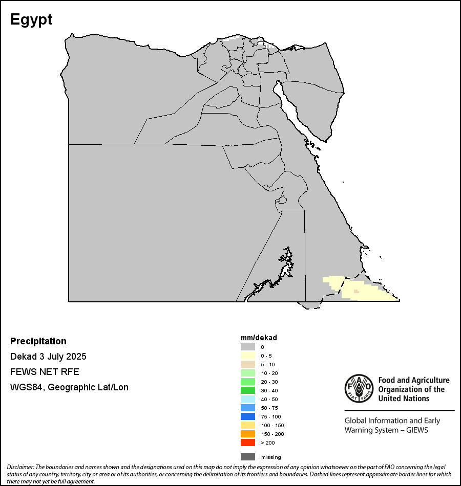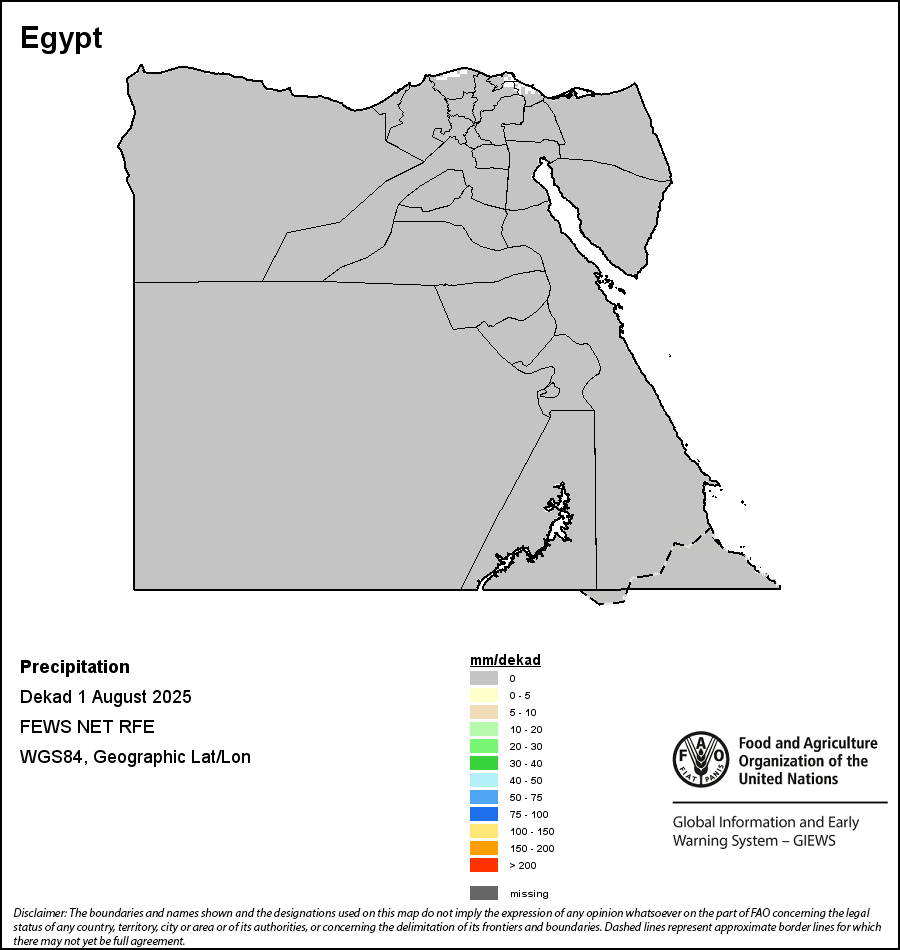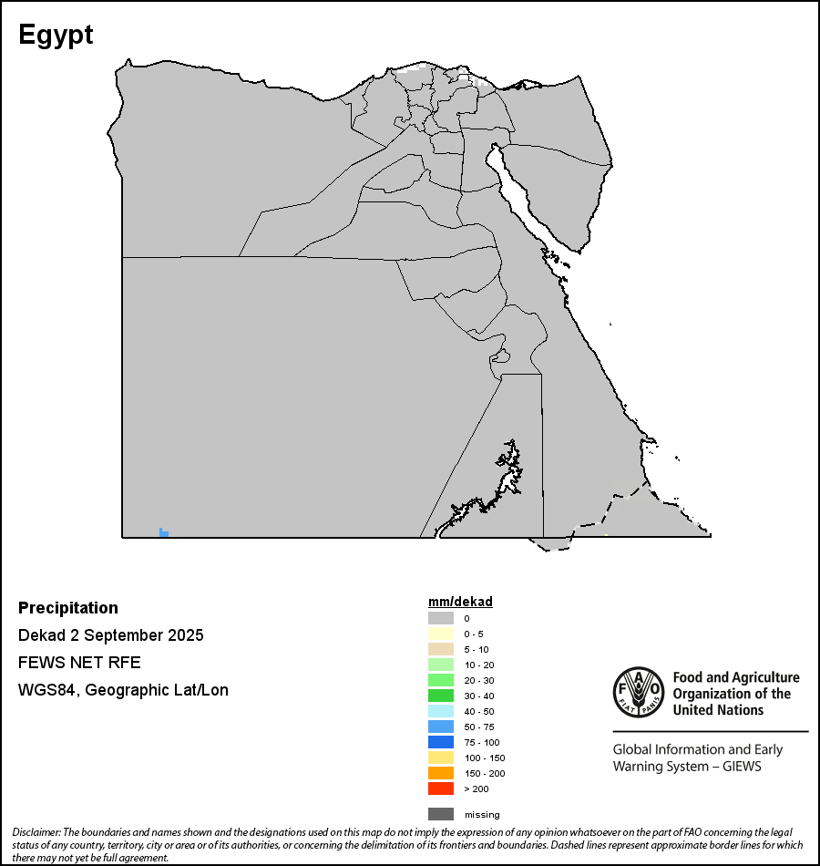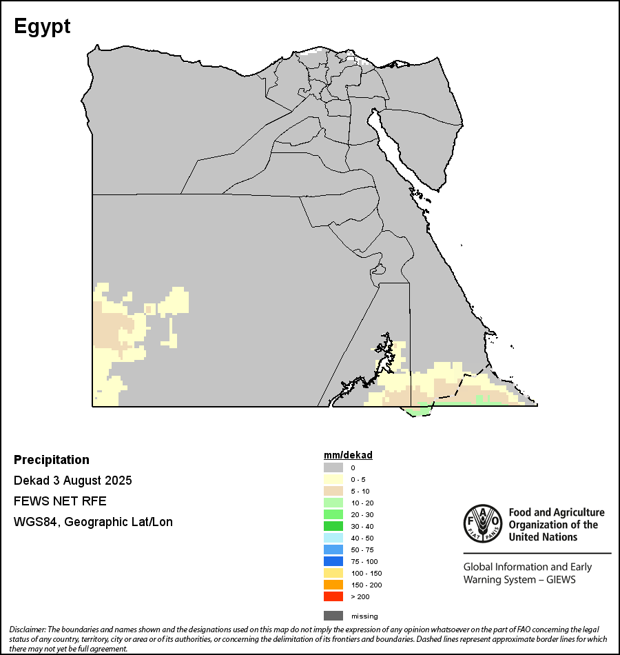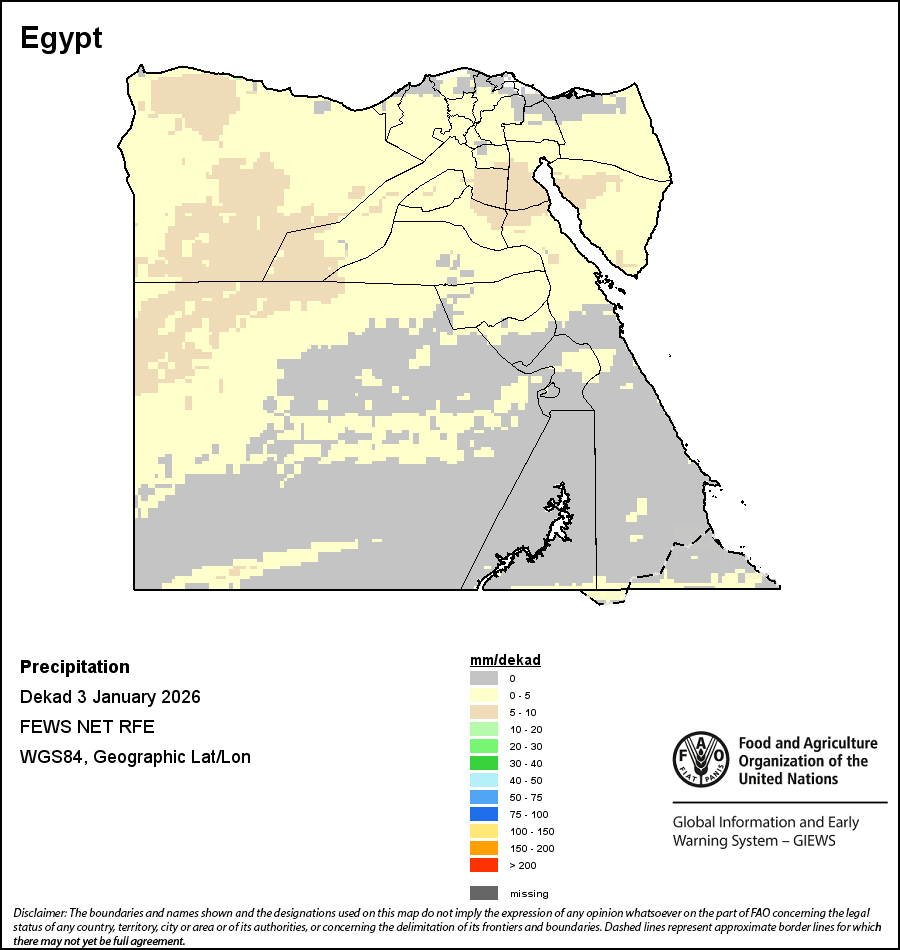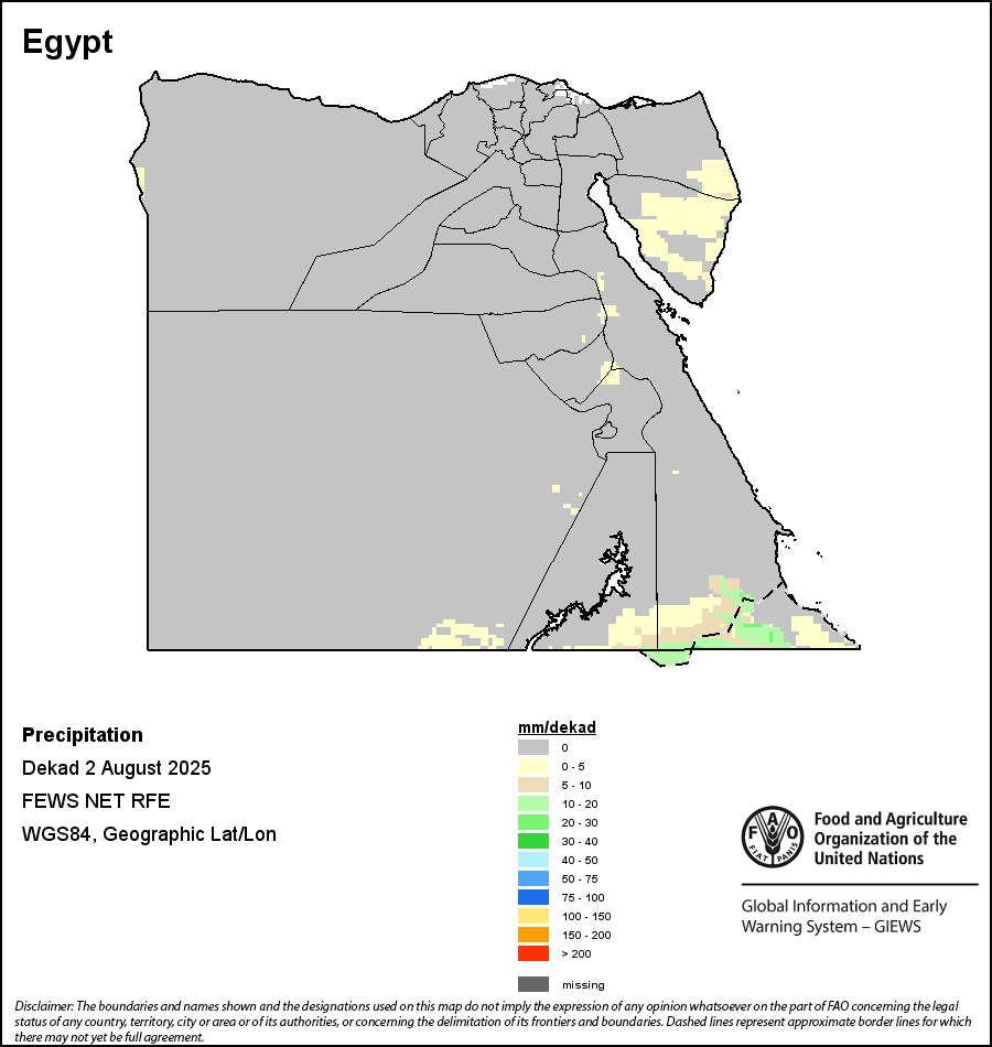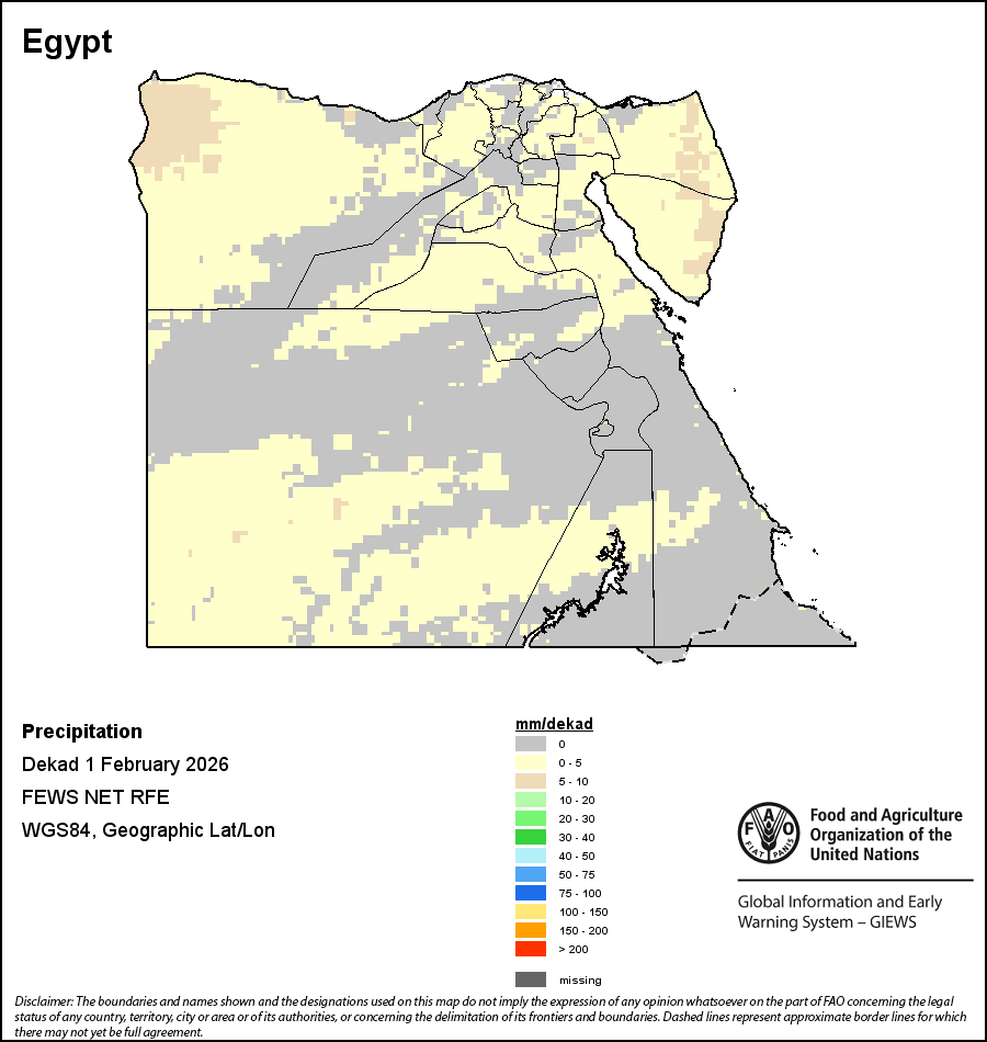 The map depicts cumulative rainfall volumes over a dekad (a 10-day period). Precipitation estimates for all African countries (except Cabo Verde and Mauritius) are taken from NOAA/FEWSNet, while for the remaining countries data is obtained from ECMWF.