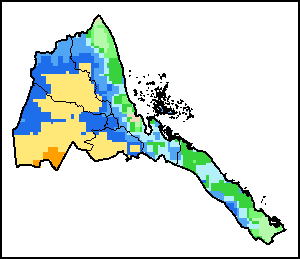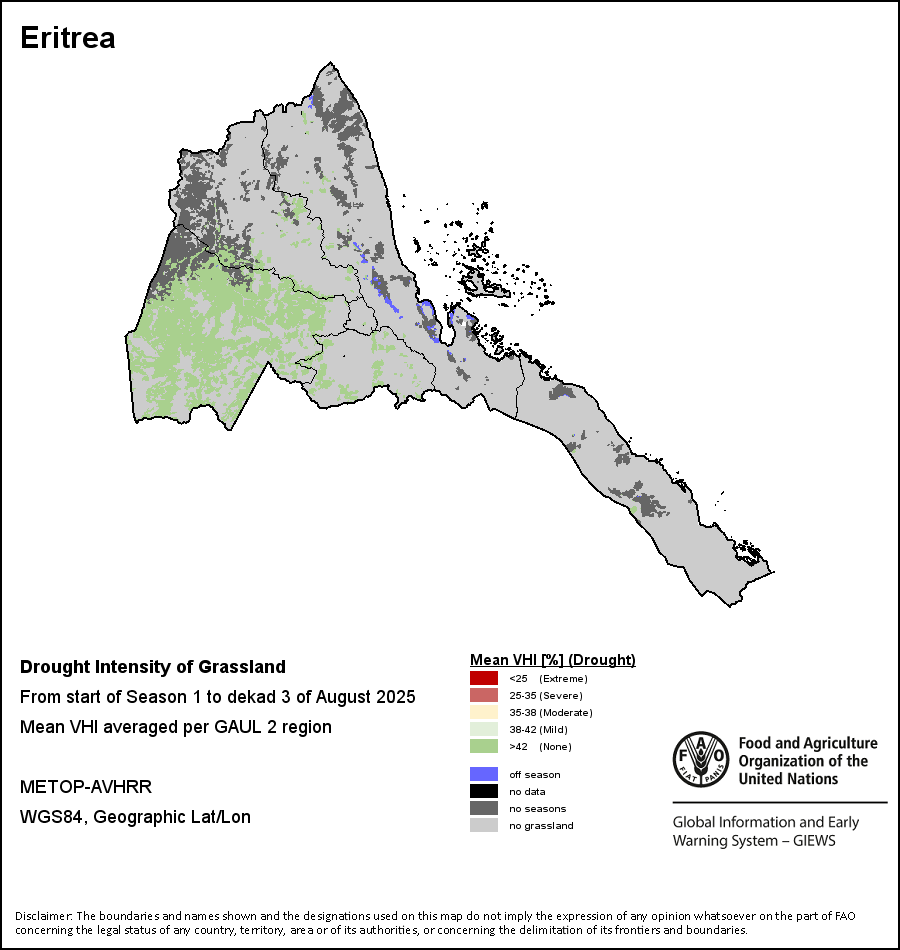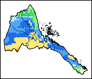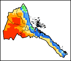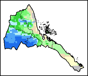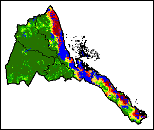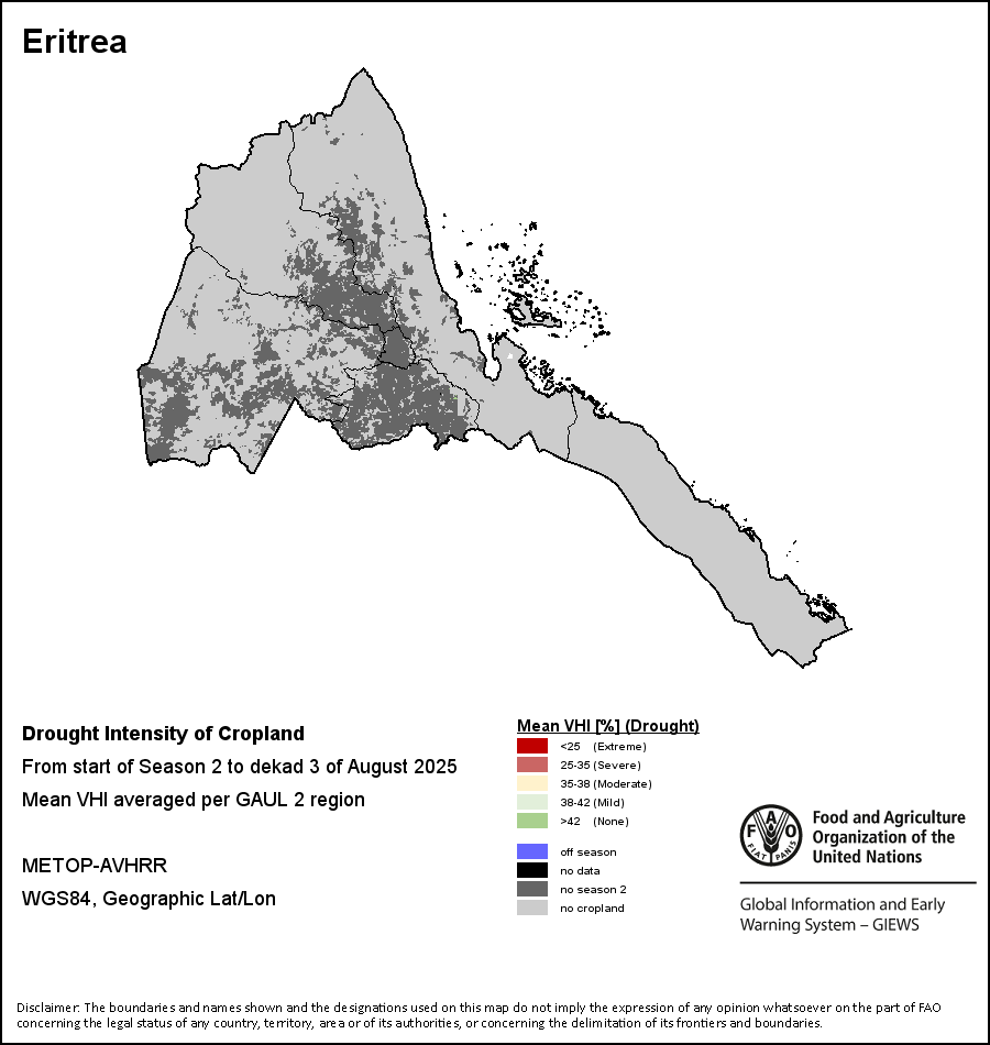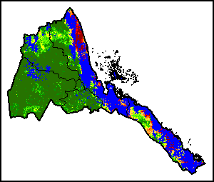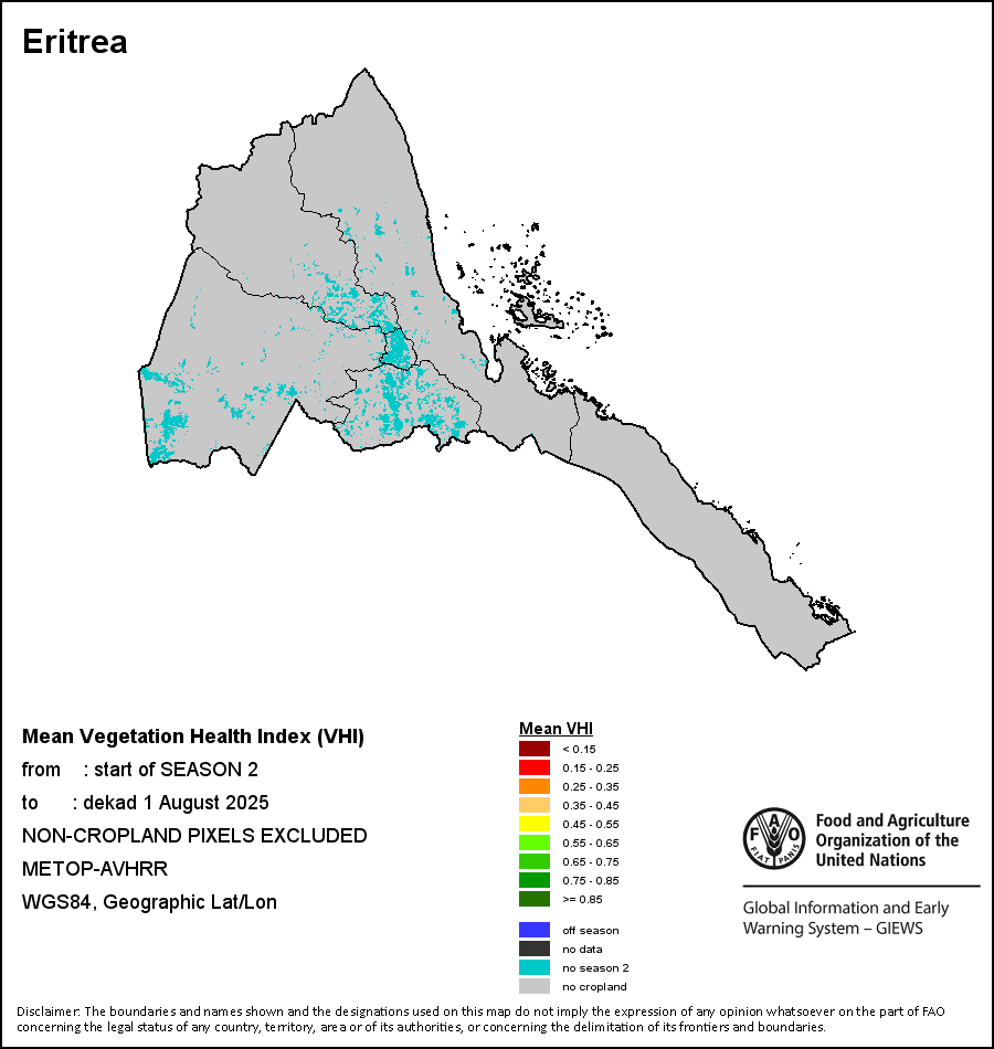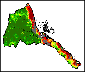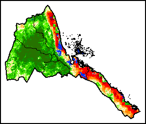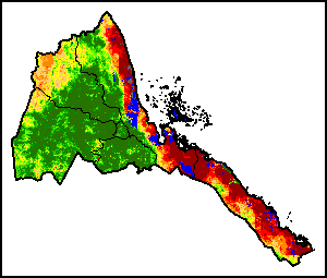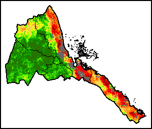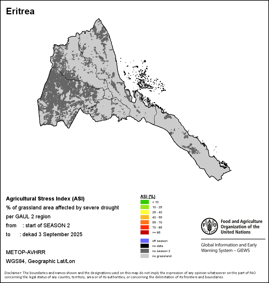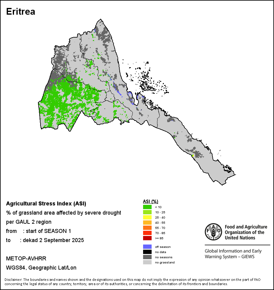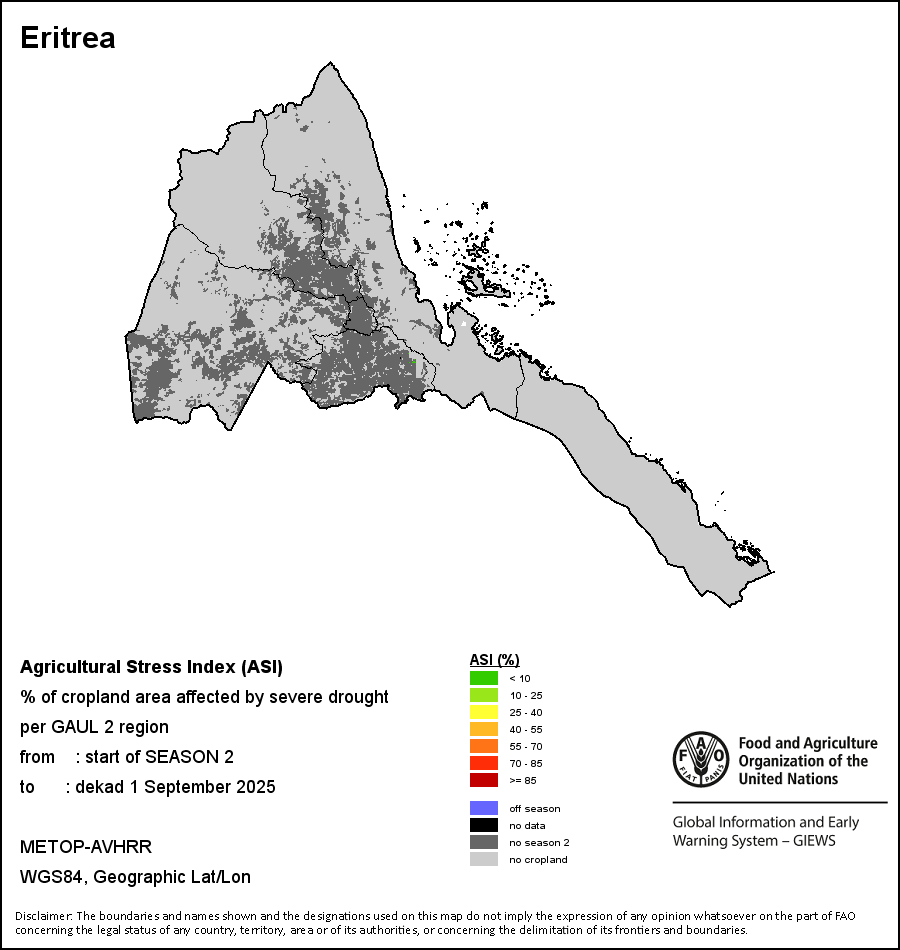 The Agricultural Stress Index (ASI) is a quick-look indicator that facilitates the early identification of cropped land with a high likelihood of water stress (drought). The Index is based on the integration of the Vegetation Health Index (VHI) in two dimensions that are critical in the assessment of a drought event in agriculture: temporal and spatial. The first step of the ASI calculation is a temporal averaging of the VHI, assessing the intensity and duration of dry periods occurring during the crop cycle at the pixel level; this calculation includes the use of crop coefficients, which introduces sensitivity of a crop to water stress during each phenological phase. The second step determines the spatial extent of drought events by calculating the percentage of pixels in arable areas with a VHI value below 35 percent (this value was identified as a critical threshold in assessing the extent of drought in previous research by Kogan, 1995). Each administrative area is classified according to the percentage of the affected area to facilitate the quick interpretation of results.