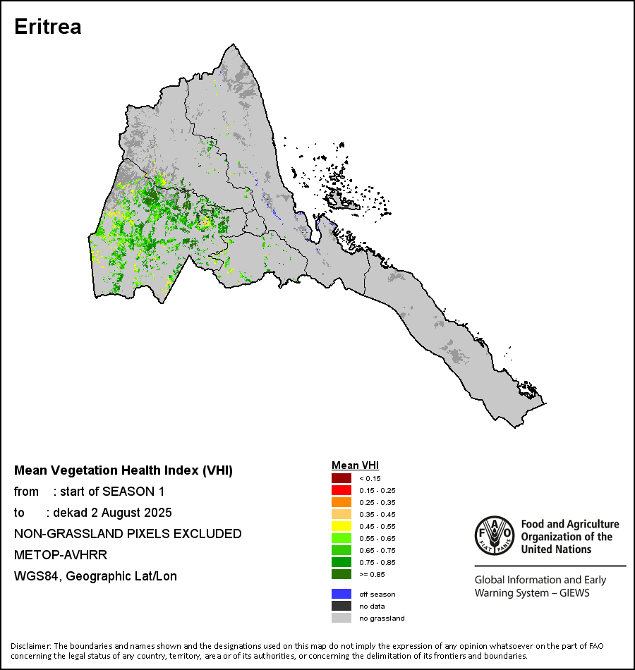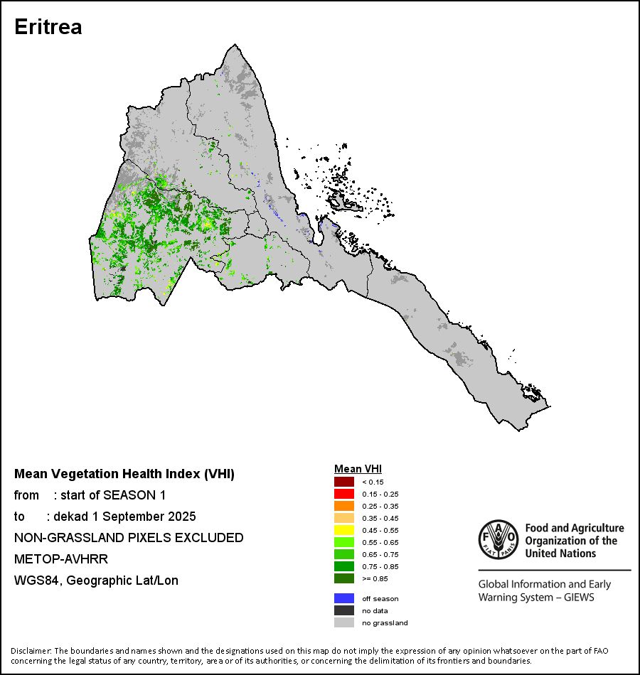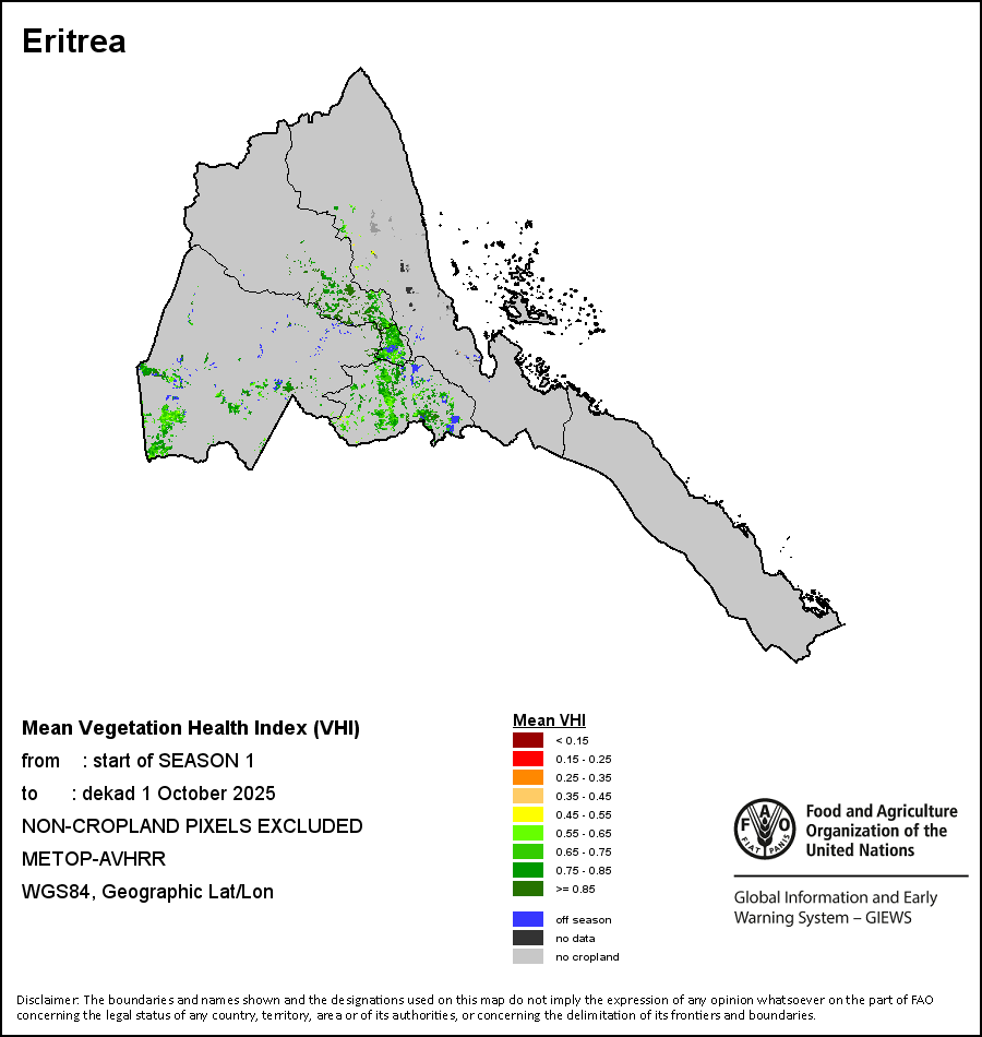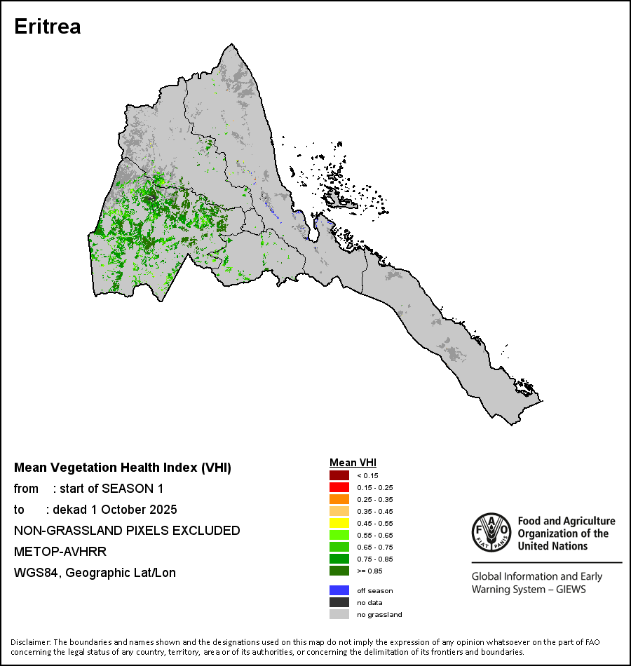 The country level maps and graphs depict the latest 36-month period of the seasonal, vegetation and precipitation indicators. The data is presented by dekad and month.   More