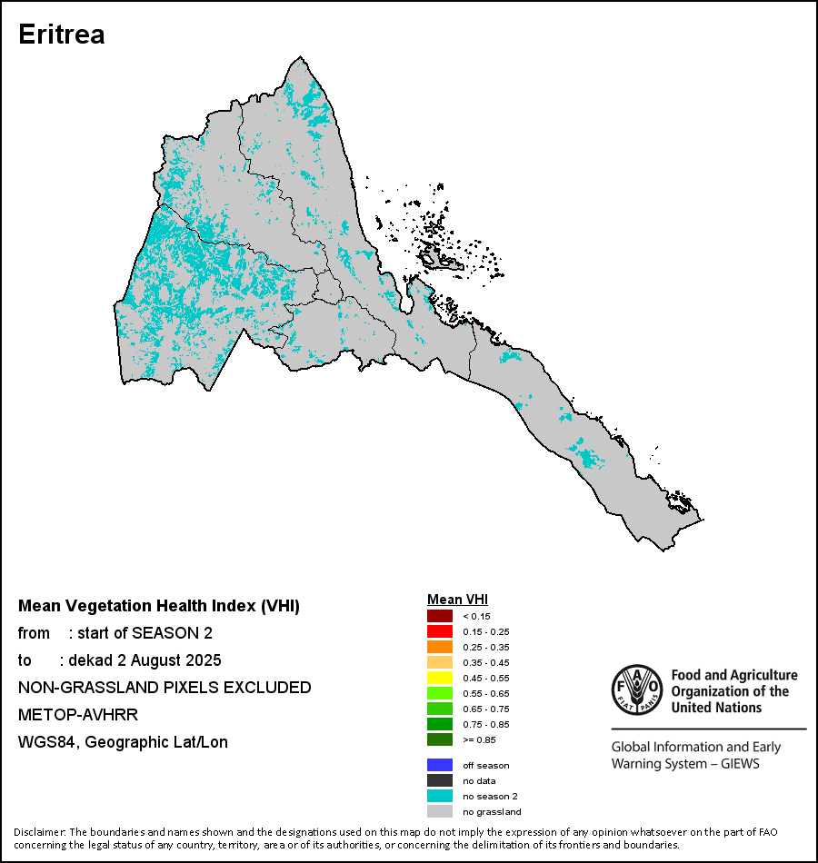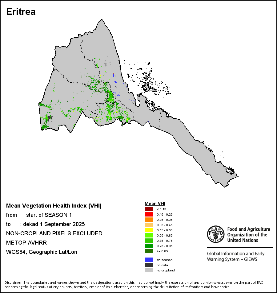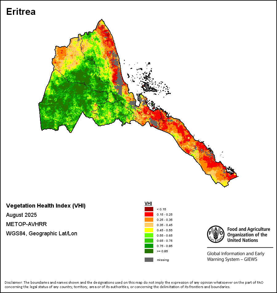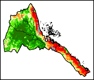 The Vegetation Health Index (VHI) illustrates the severity of drought based on the vegetation health and the influence of temperature on plant conditions. The VHI is a composite index and the elementary indicator used to compute the ASI. It combines both the Vegetation Condition Index (VCI) and the Temperature Condition Index (TCI). The TCI is calculated using a similar equation to the VCI, but relates the current temperature to the long-term maximum and minimum , as it is assumed that higher temperatures tend to cause a deterioration in vegetation conditions. A decrease in the VHI would, for example, indicate relatively poor vegetation conditions and warmer temperatures, signifying stressed vegetation conditions, and over a longer period would be indicative of drought. The VHI images are computed for the two main seasons and in three modalities: dekadal, monthly and annual.