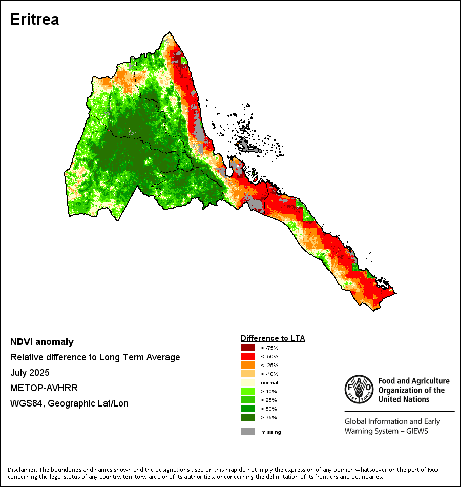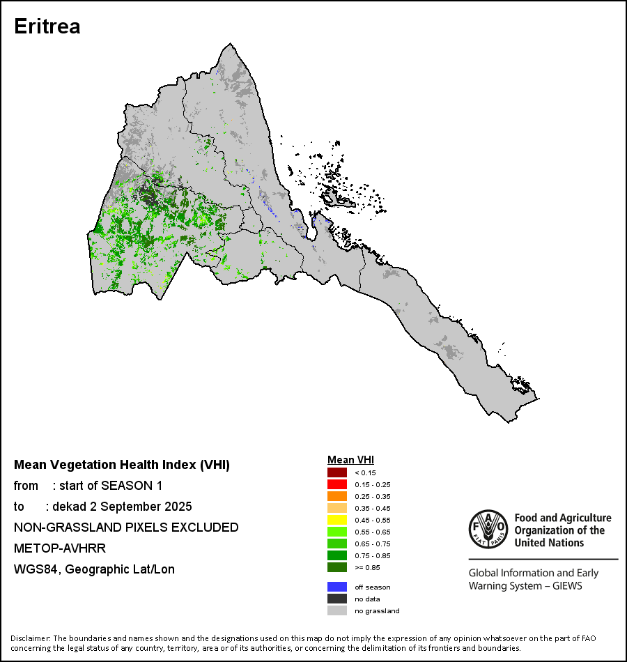 The Normalized Difference Vegetation Index (NDVI) measures the “greenness” of ground cover and is used as a proxy to indicate the density and health of vegetation. NDVI values range from +1 to -1, with high positive values corresponding to dense and healthy vegetation, and low and/or negative NDVI values indicating poor vegetation conditions or sparse vegetative cover. The NDVI anomaly indicates the variation of the current dekad to the long-term average, where a positive value (for example 20 percent) would signify enhanced vegetation conditions compared to the average, while a negative value (for instance -40 percent) would indicate comparatively poor vegetation conditions.