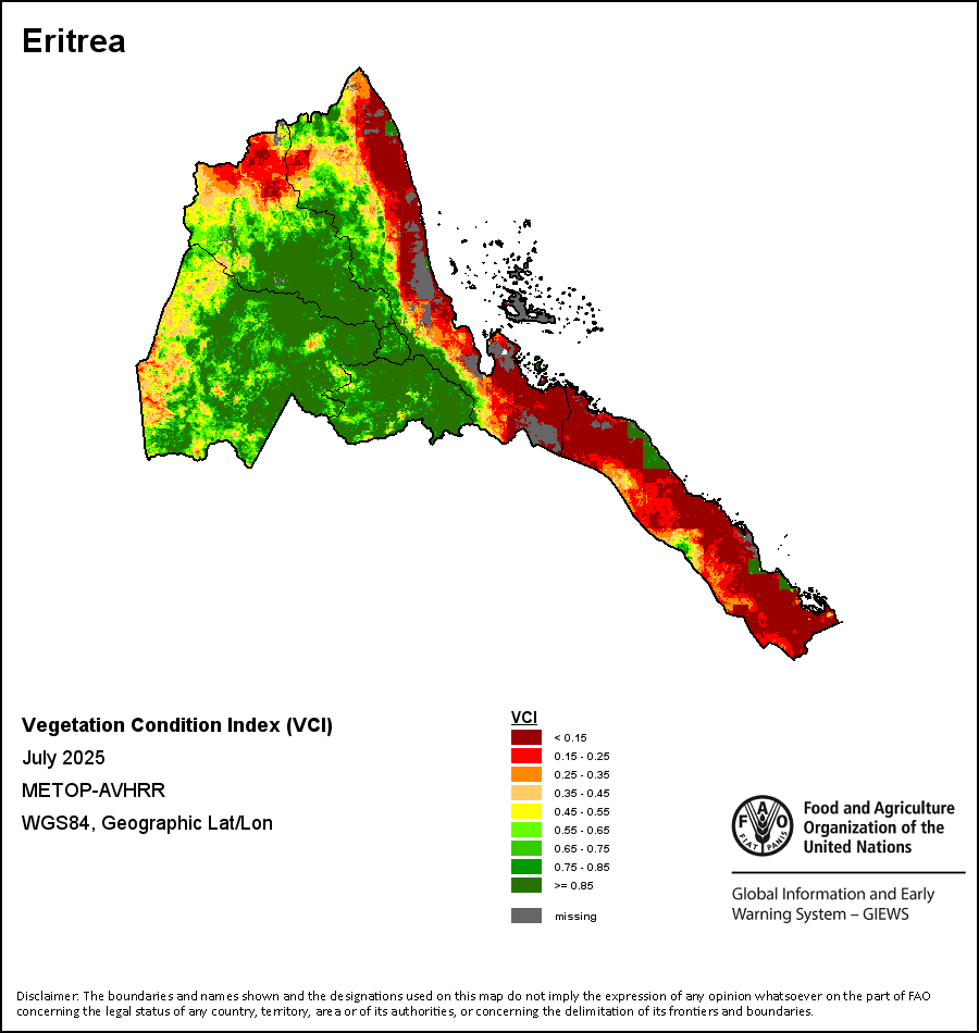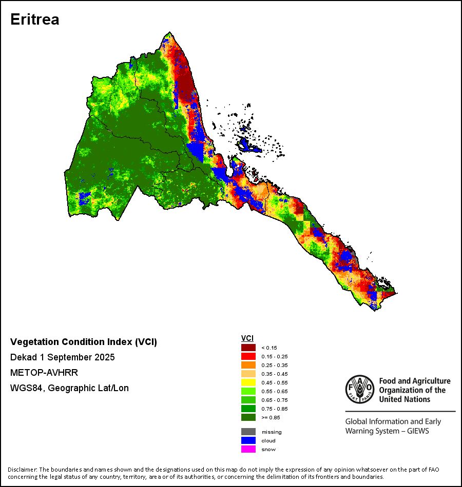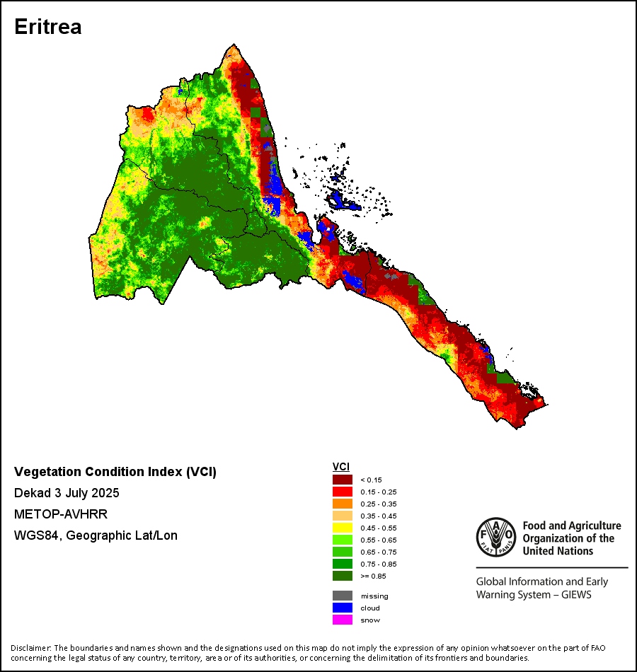 The Vegetation Condition Index (VCI) evaluates the current vegetation health in comparison to the historical trends. The VCI relates current dekadal Normalized Difference Vegetation Index (NDVI) to its long-term minimum and maximum, normalized by the historical range of NDVI values for the same dekad. The VCI was designed to separate the weather-related component of the NDVI from the ecological element.
