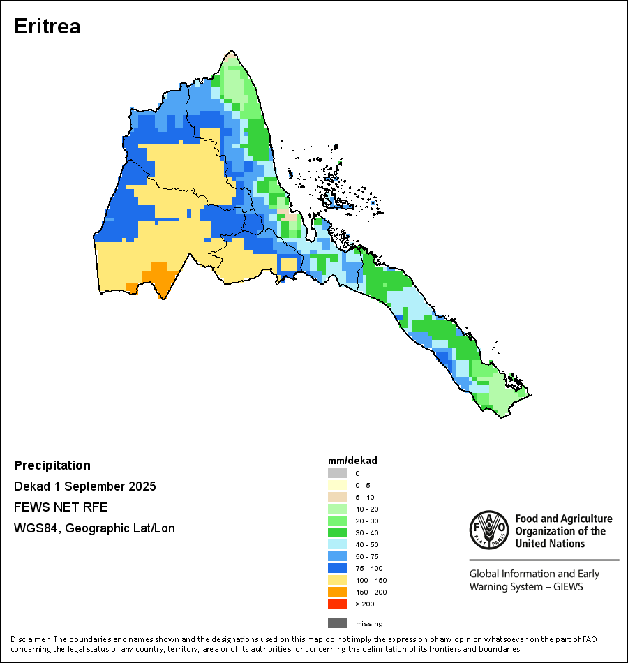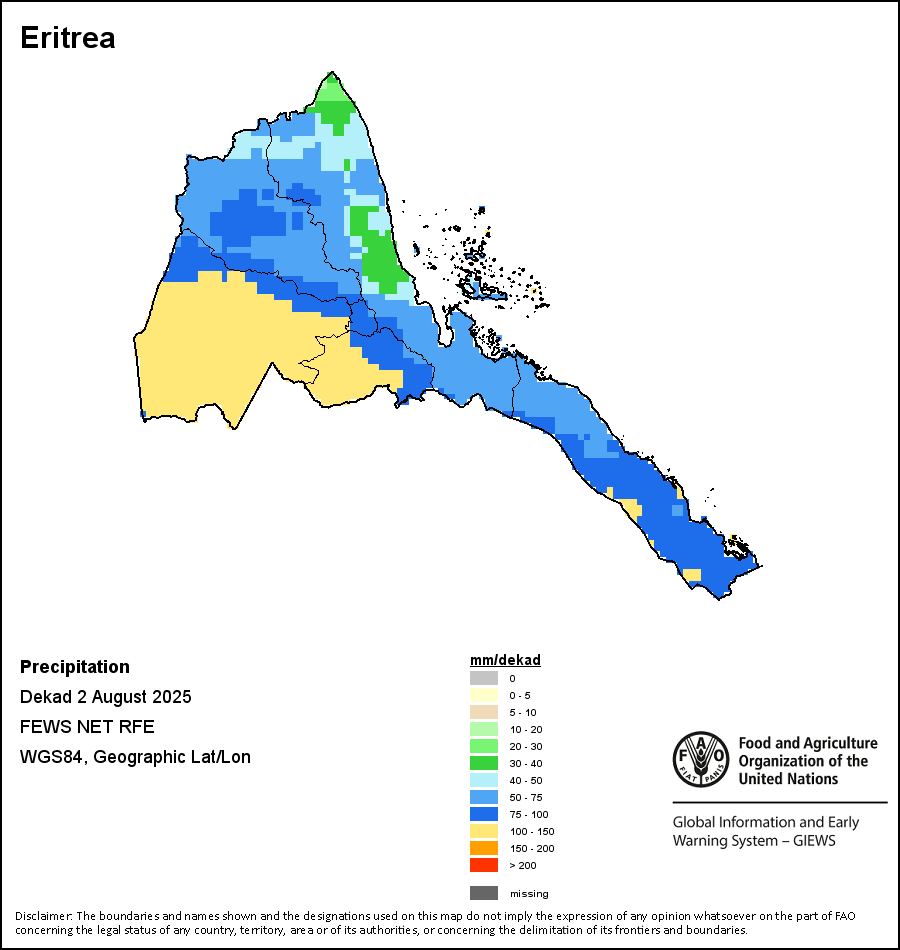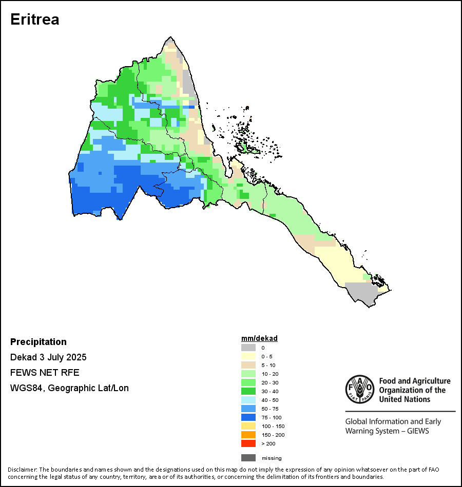 The map depicts cumulative rainfall volumes over a dekad (a 10-day period). Precipitation estimates for all African countries (except Cabo Verde and Mauritius) are taken from NOAA/FEWSNet, while for the remaining countries data is obtained from ECMWF.