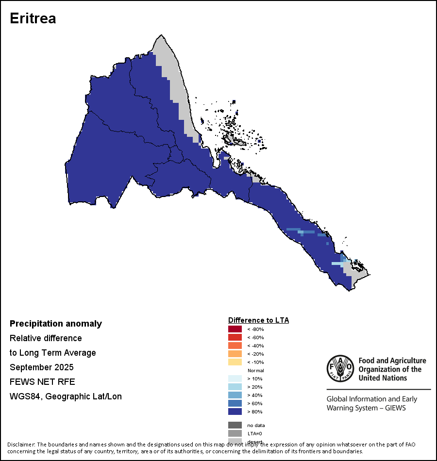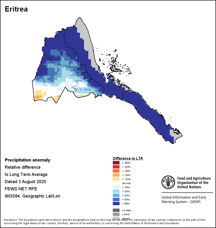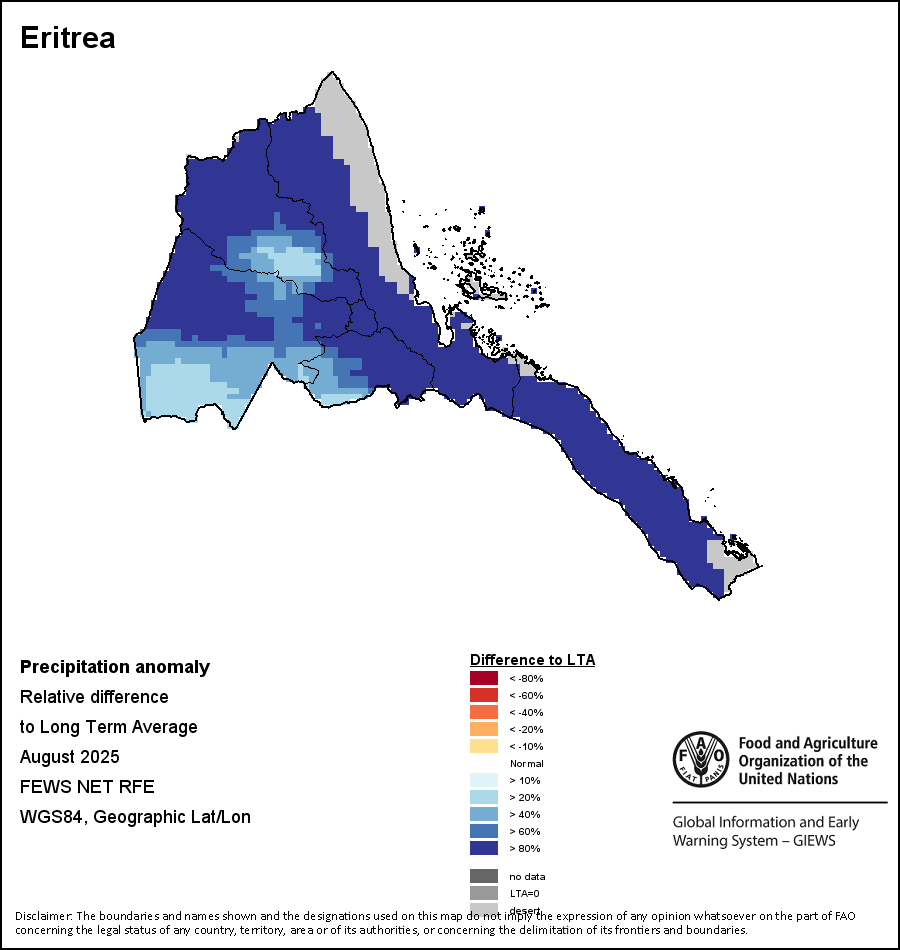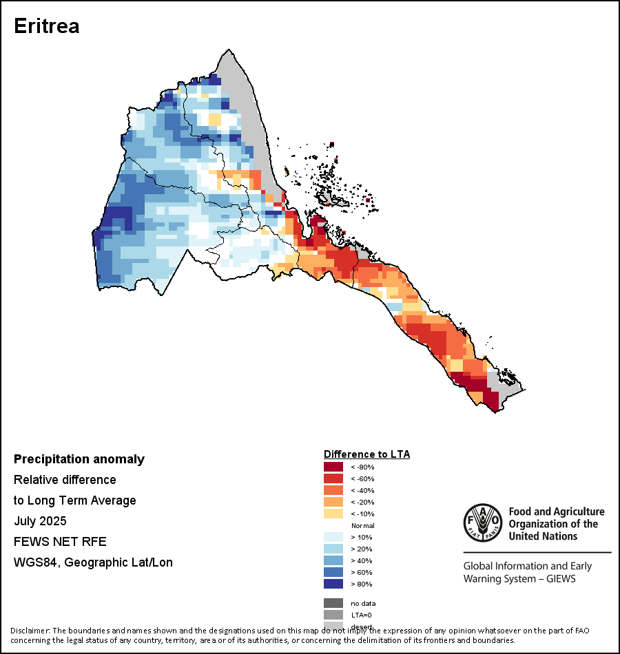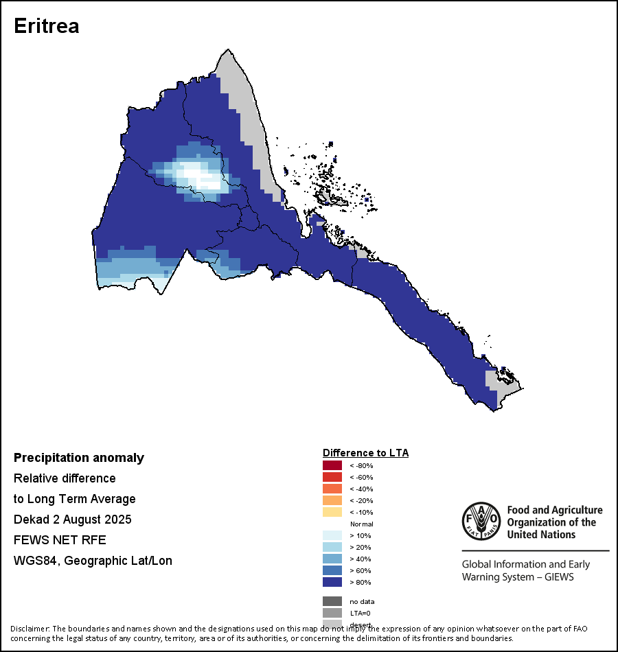 The map illustrates the difference between the current rainfall volume and the average level. Rainfall levels are compared with the Long-Term Average (LTA), which refers to the period 1989-2015. Warmer colours identify areas which have received lower-than-average rainfall, while colder colours are given to areas where precipitation has been above average.