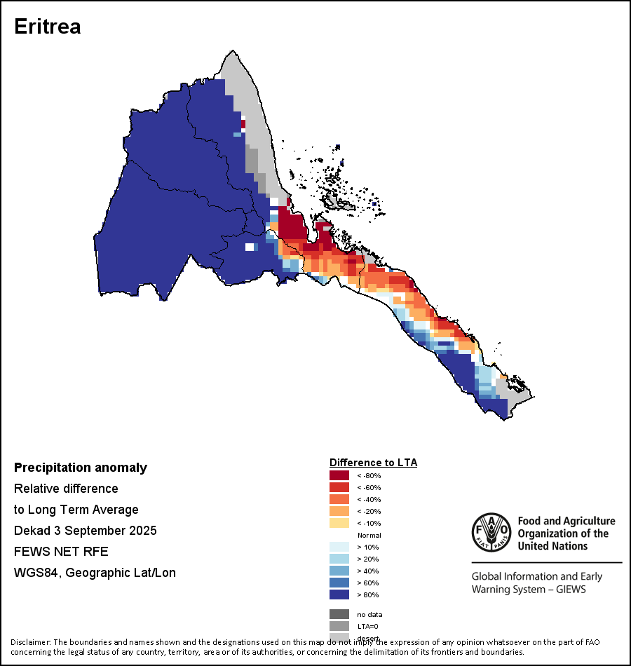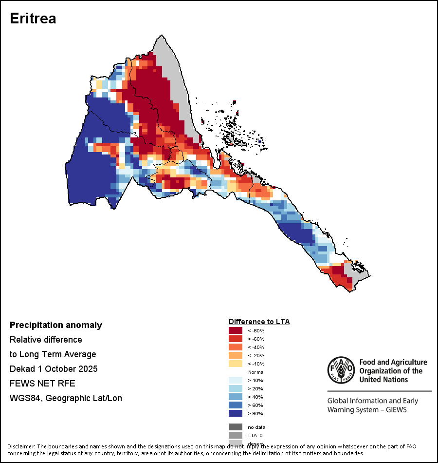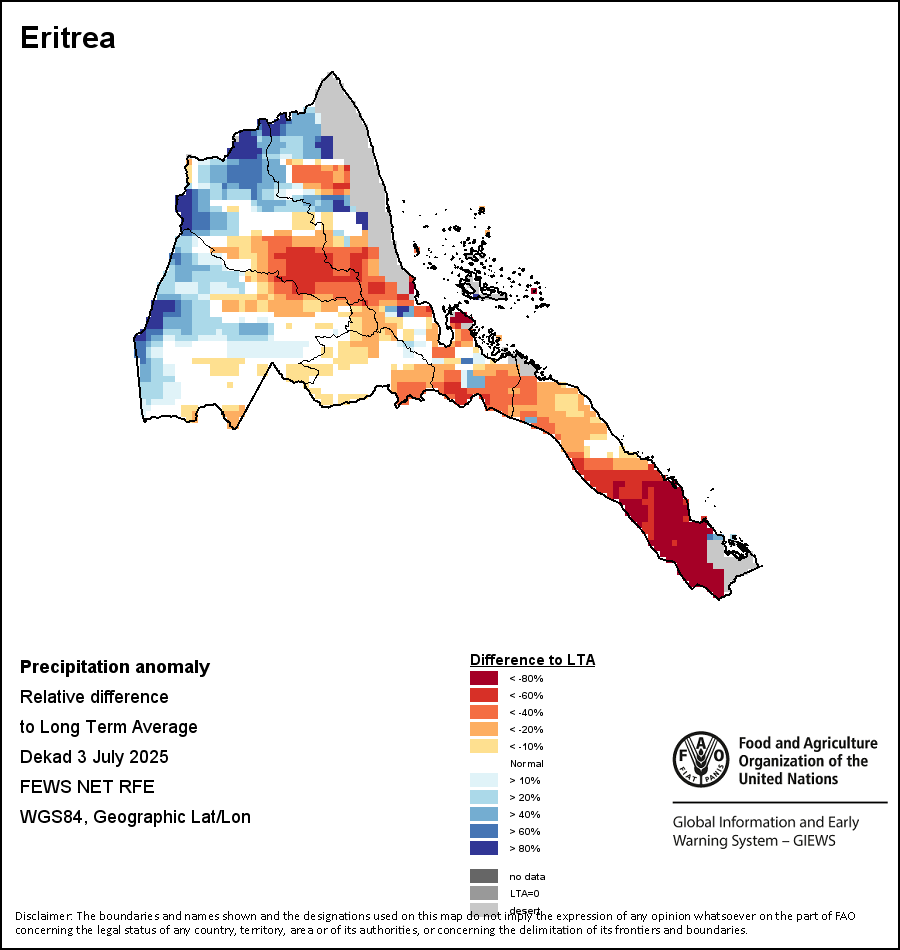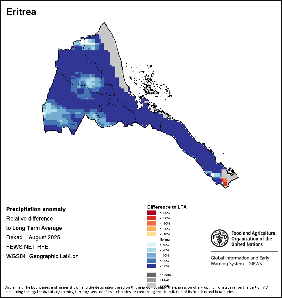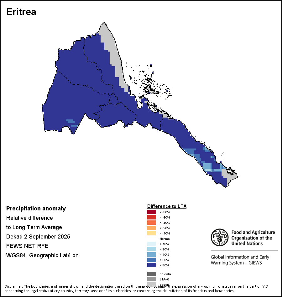 The map illustrates the difference between the current rainfall volume and the average level. Rainfall levels are compared with the Long-Term Average (LTA), which refers to the period 1989-2015. Warmer colours identify areas which have received lower-than-average rainfall, while colder colours are given to areas where precipitation has been above average.