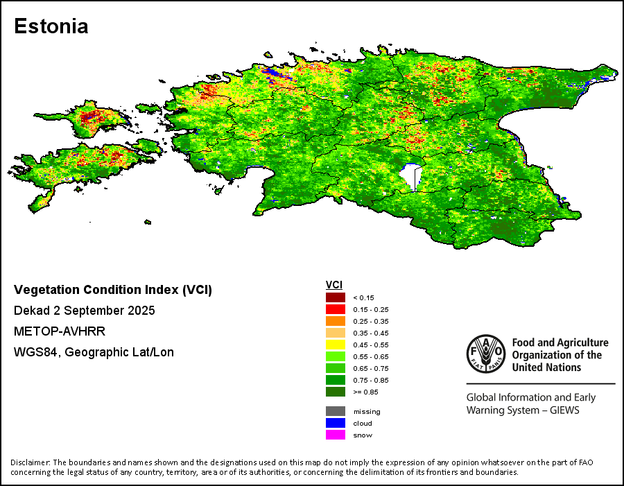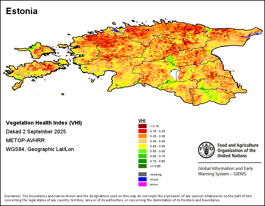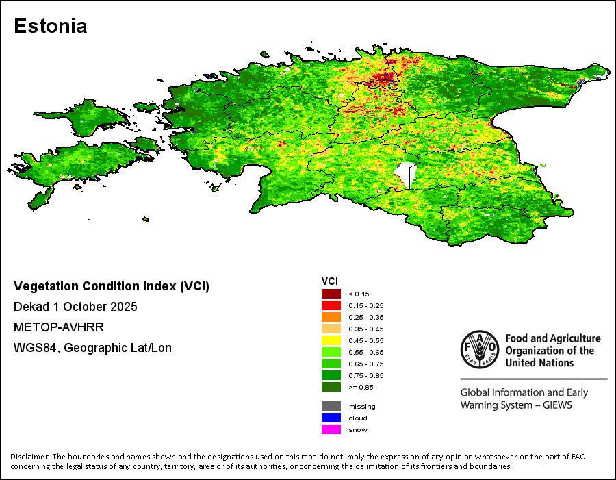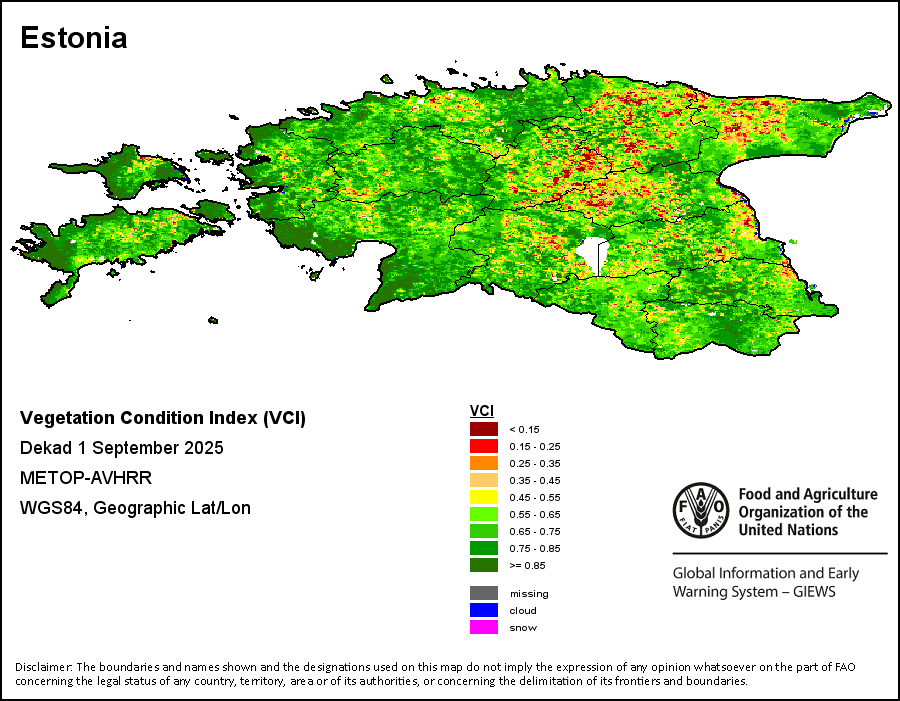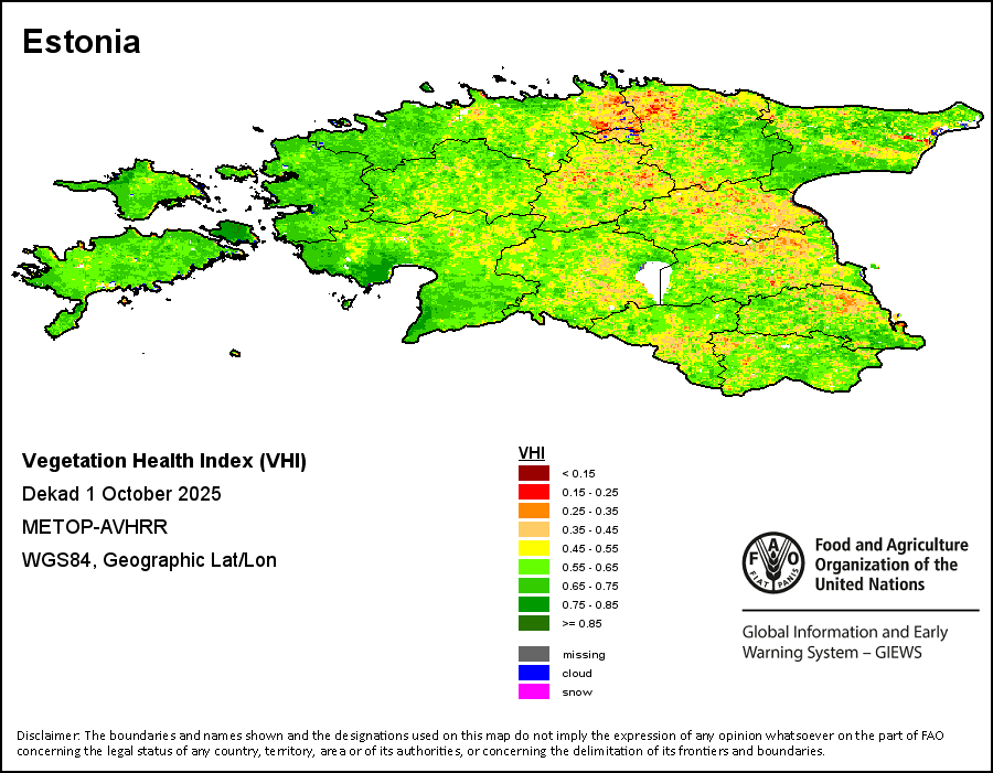 植被健康指数(VHI)根据植被健康状况以及气温对作物状况的影响情况显示干旱的严重程度。 VHI是一项综合指数,是用于计算ASI的基础性指标。它结合了植被状况指数(VCI)和气温状况指数(TCI)。TCI的计算采用了与VCI类似的方程,但它把当前气温与长期最高和最低值联系起来,因为一个假定前提是气温越高就倾向于造成植被状况恶化。比方说,VHI指数下降就意味着植被状况相对较差,而气温越高则意味着植被状况受到胁迫,较长时间延续则成为干旱的指征。VHI映像针对两个主要季节进行计算并分为三种时间模式:旬度、月度和年度。