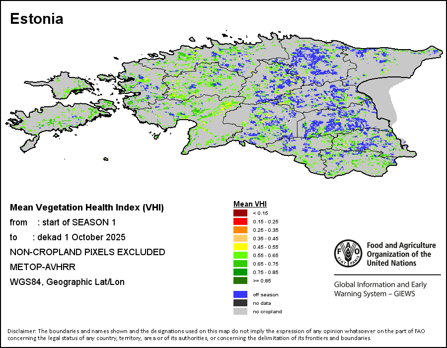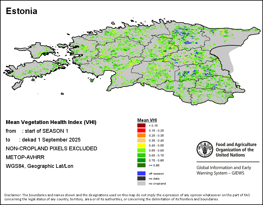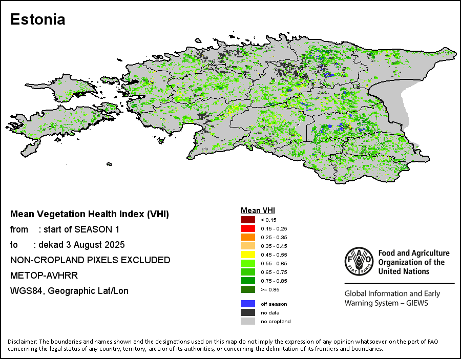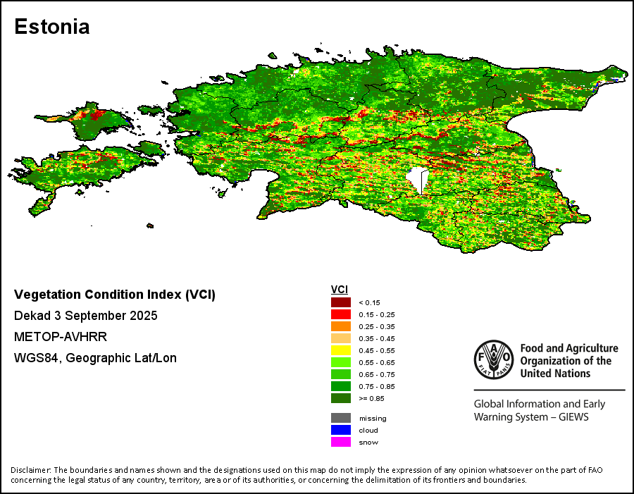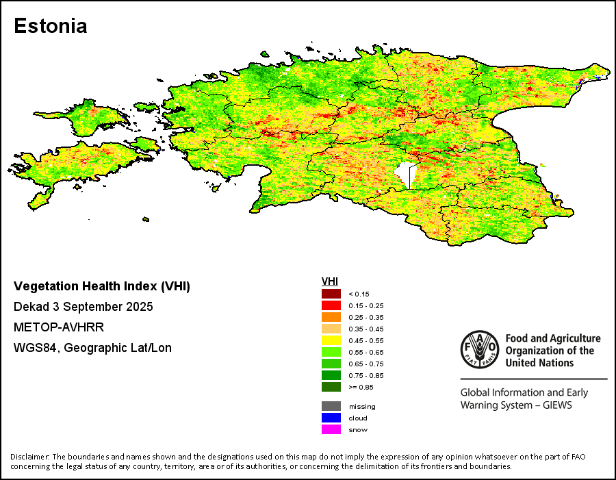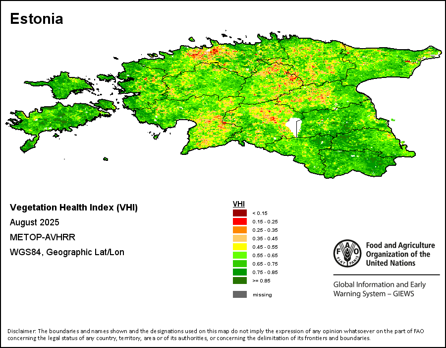 植被健康指数(VHI)根据植被健康状况以及气温对作物状况的影响情况显示干旱的严重程度。 VHI是一项综合指数,是用于计算ASI的基础性指标。它结合了植被状况指数(VCI)和气温状况指数(TCI)。TCI的计算采用了与VCI类似的方程,但它把当前气温与长期最高和最低值联系起来,因为一个假定前提是气温越高就倾向于造成植被状况恶化。比方说,VHI指数下降就意味着植被状况相对较差,而气温越高则意味着植被状况受到胁迫,较长时间延续则成为干旱的指征。VHI映像针对两个主要季节进行计算并分为三种时间模式:旬度、月度和年度。