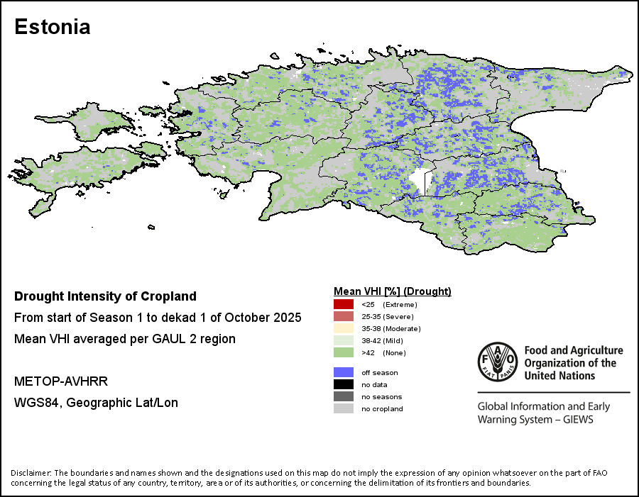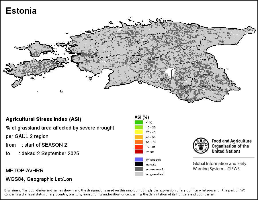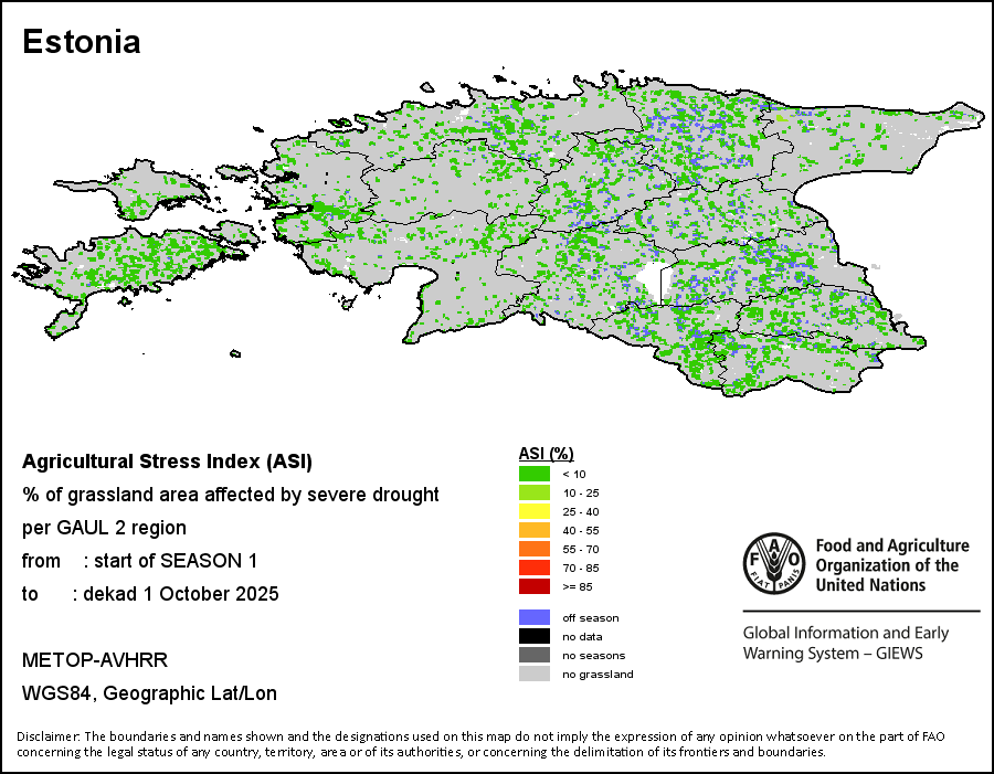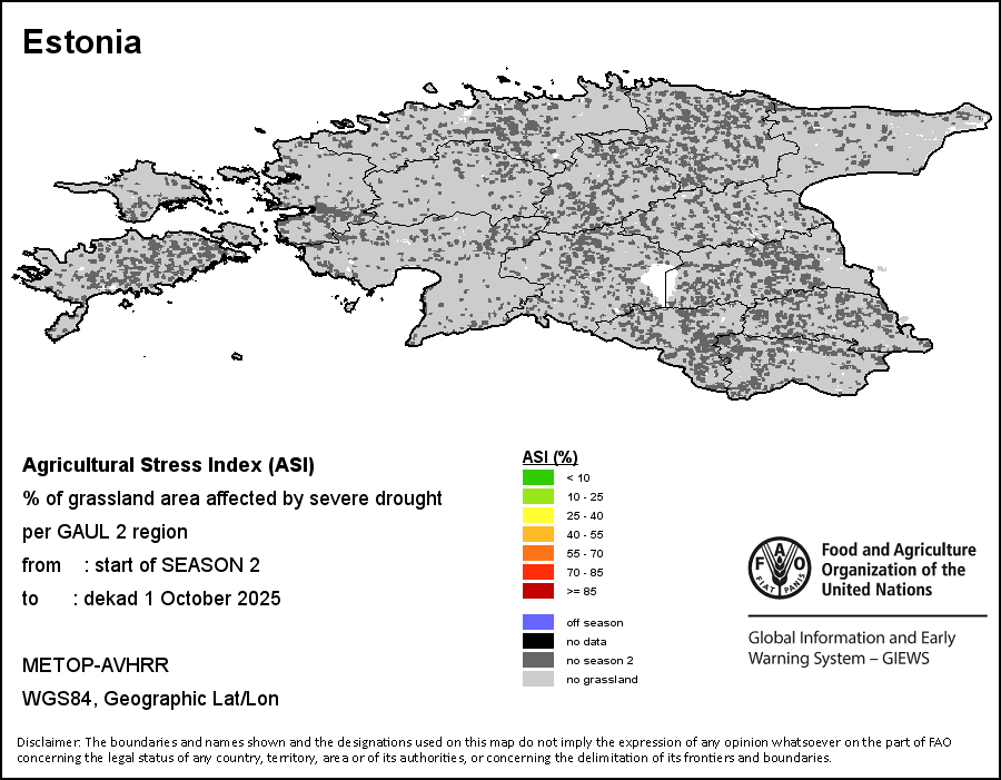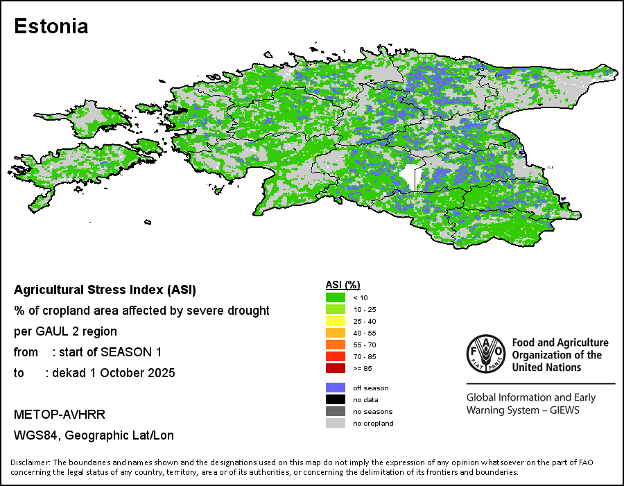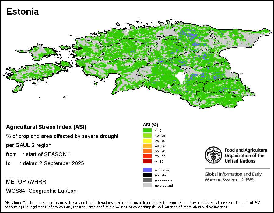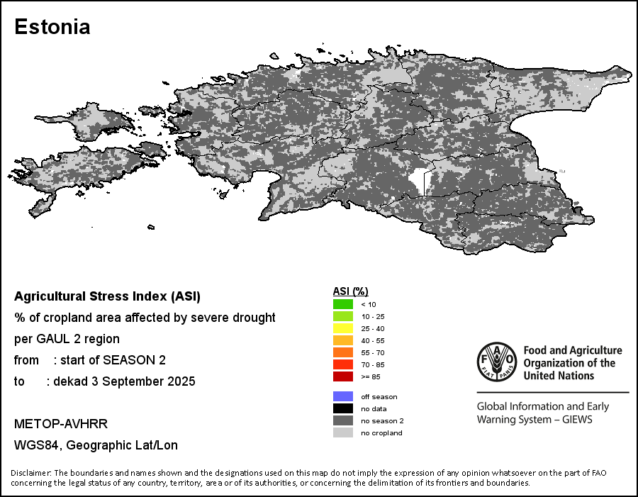 农业干旱胁迫指数(ASI)是一项速览指数,有助于在早期甄别较大可能发生水胁迫(干旱)的耕地。 该指数通过整合植被健康指数(VHI)在评估农业旱情方面具有关键意义的两个维度,即时间和空间维度,而得出。计算农业干旱胁迫指数的第一步是求植被健康指数的时间平均值,对作物周期内旱情的强度和时长进行像素级评估;这项计算包括采用作物系数衡量某种作物在各物候阶段对干旱胁迫的敏感度。第二步是确定旱情的空间广度,方法是计算植被健康指数值低于35%(Kogan前期研究将这一数值确定为评估干旱程度的临界值,1995年)的耕地的像素百分比。然后把各个行政区域根据受影响面积的百分比进行划分,便于对结果进行快速解读。