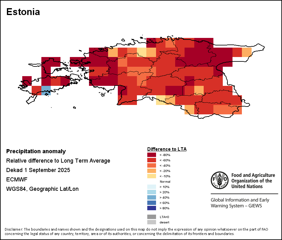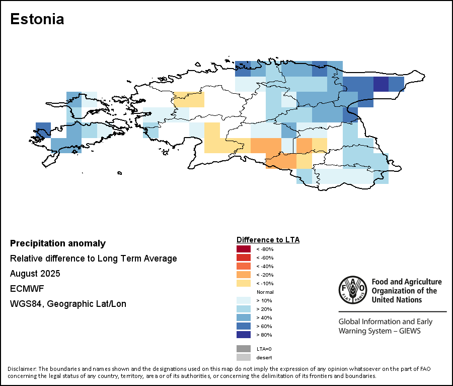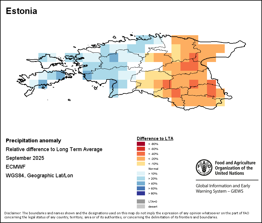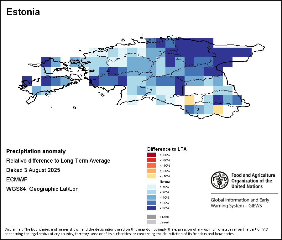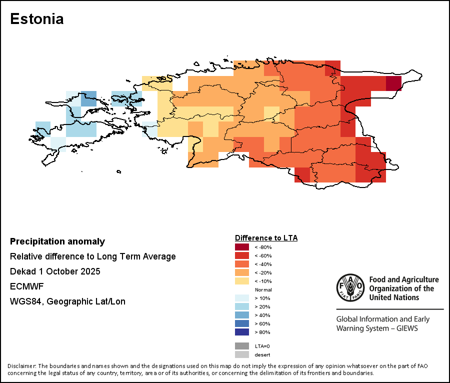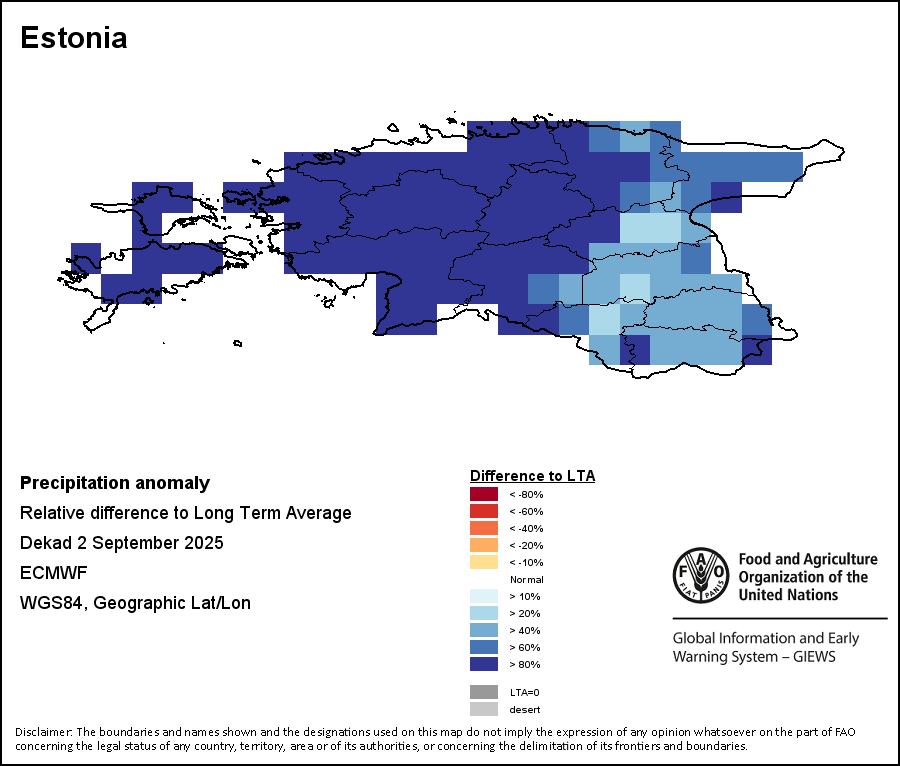 该图谱显示了当前降水量与平均水平之间的差异。 由降水量水平与长期平均值(LTA)进行比较得出,长期平均值系指1989-2015年期间的数值。暖色调指示的是降水量低于平均水平的地区,而冷色调指示的则是降水量高于平均水平的地区。降雨量估算数据来自欧洲中期天气预报这些(ECMWF)。