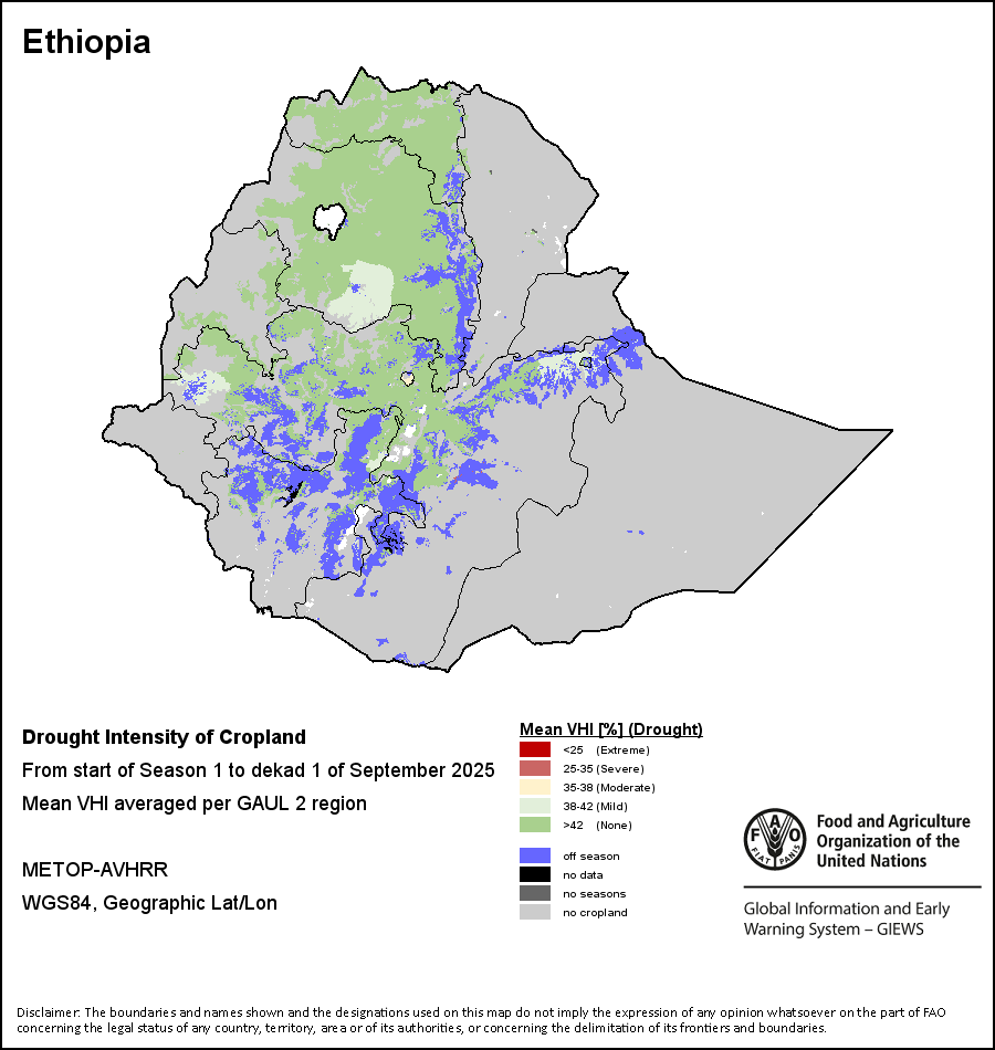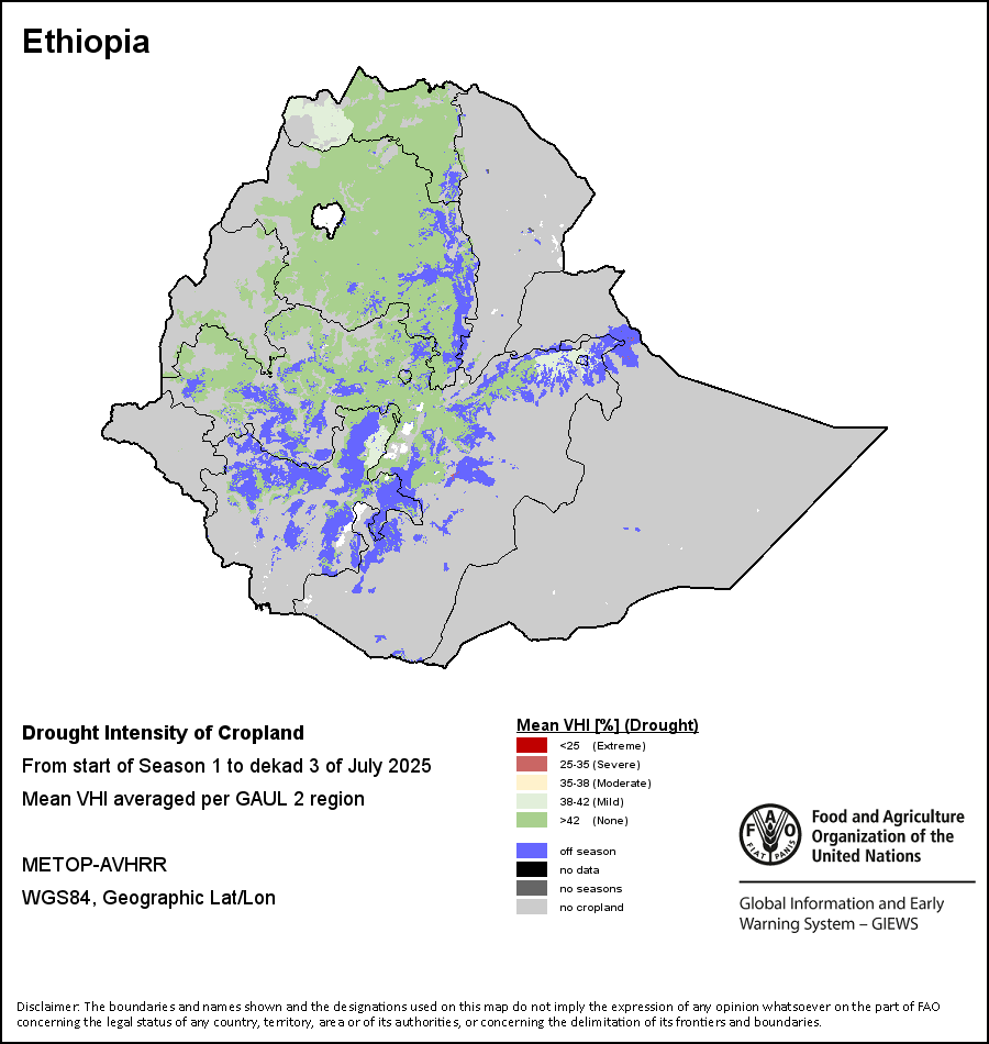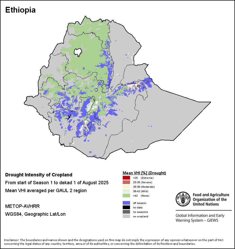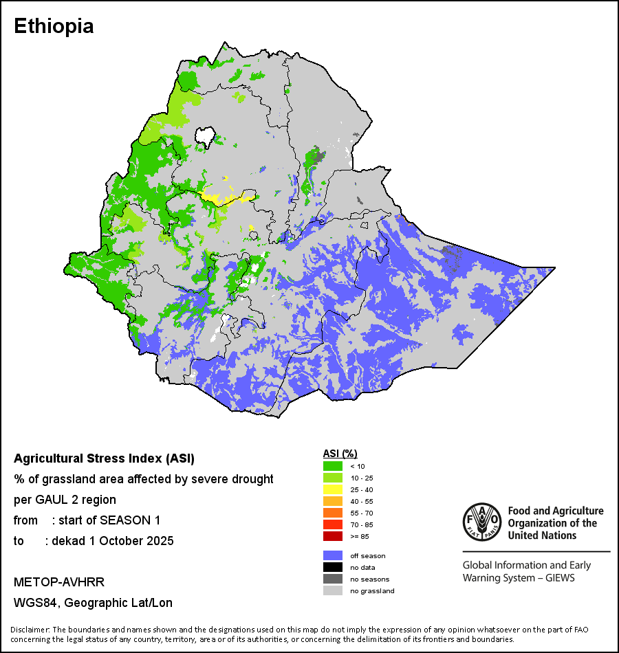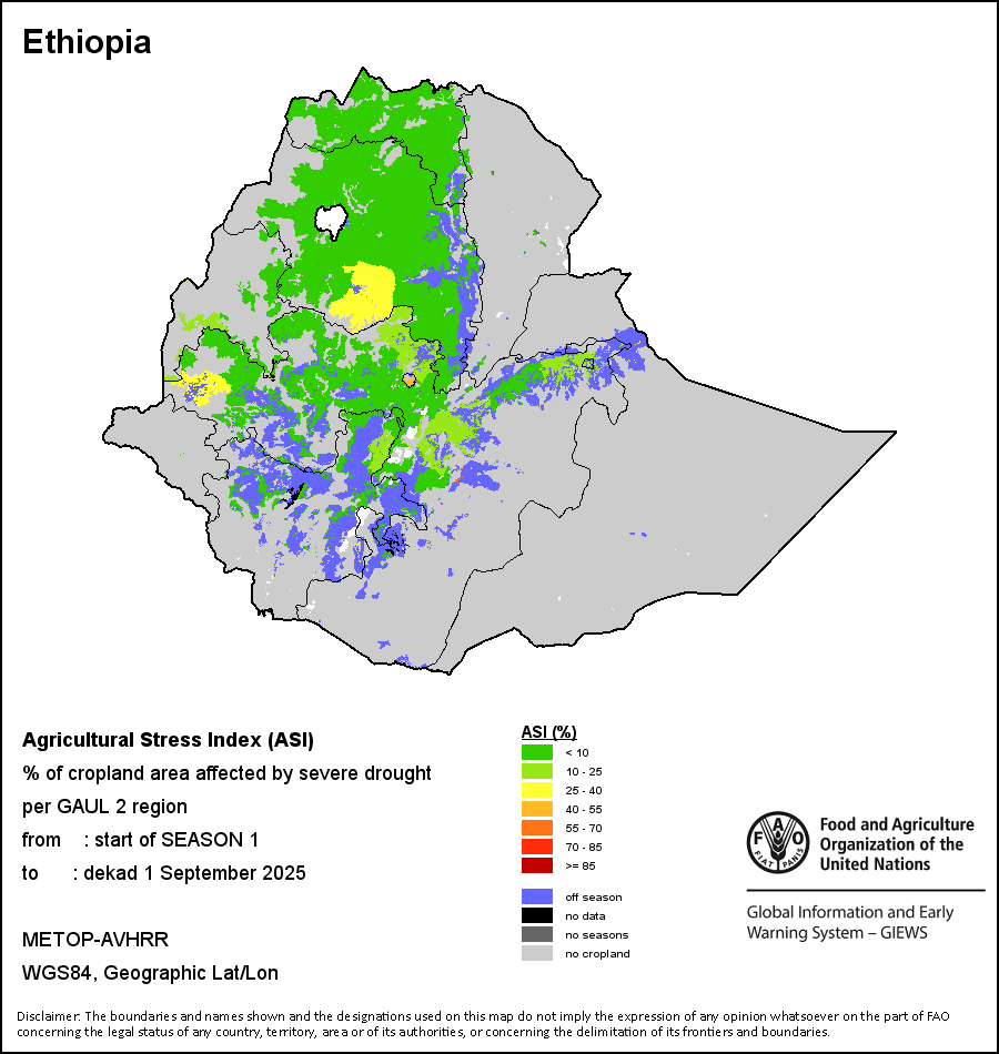 The Agricultural Stress Index (ASI) is a quick-look indicator that facilitates the early identification of cropped land with a high likelihood of water stress (drought). The Index is based on the integration of the Vegetation Health Index (VHI) in two dimensions that are critical in the assessment of a drought event in agriculture: temporal and spatial. The first step of the ASI calculation is a temporal averaging of the VHI, assessing the intensity and duration of dry periods occurring during the crop cycle at the pixel level; this calculation includes the use of crop coefficients, which introduces sensitivity of a crop to water stress during each phenological phase. The second step determines the spatial extent of drought events by calculating the percentage of pixels in arable areas with a VHI value below 35 percent (this value was identified as a critical threshold in assessing the extent of drought in previous research by Kogan, 1995). Each administrative area is classified according to the percentage of the affected area to facilitate the quick interpretation of results.