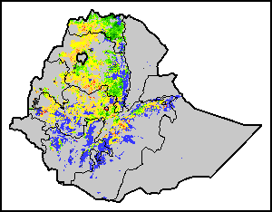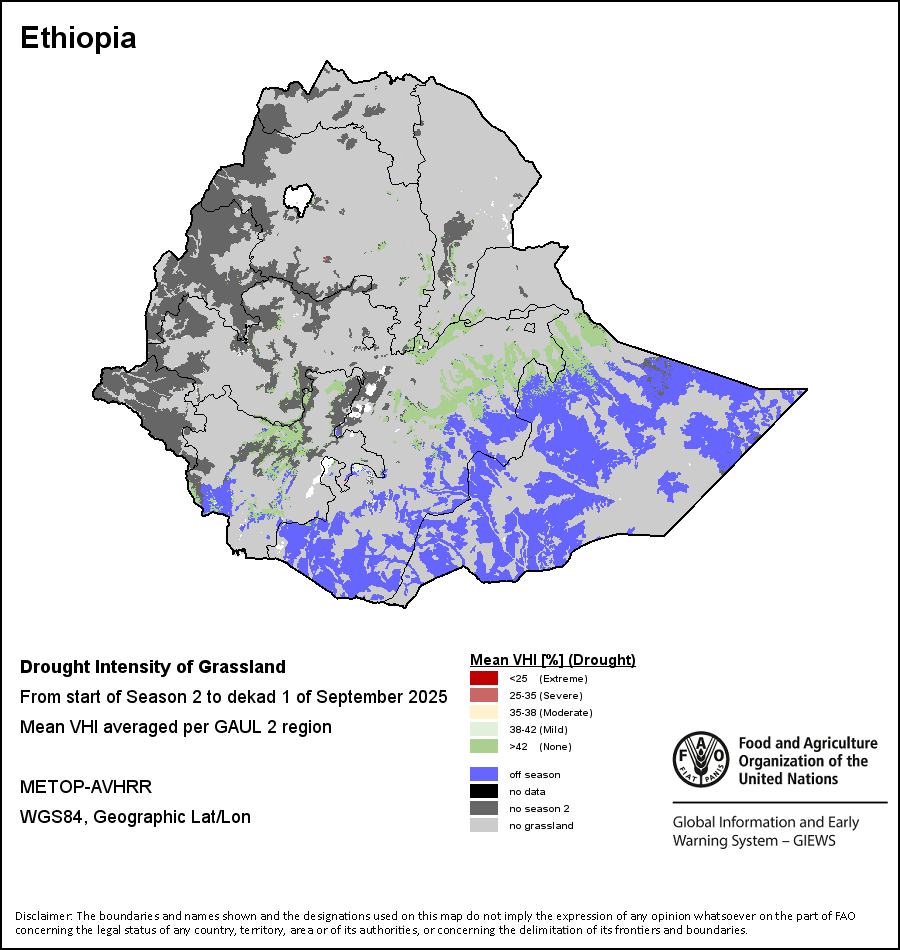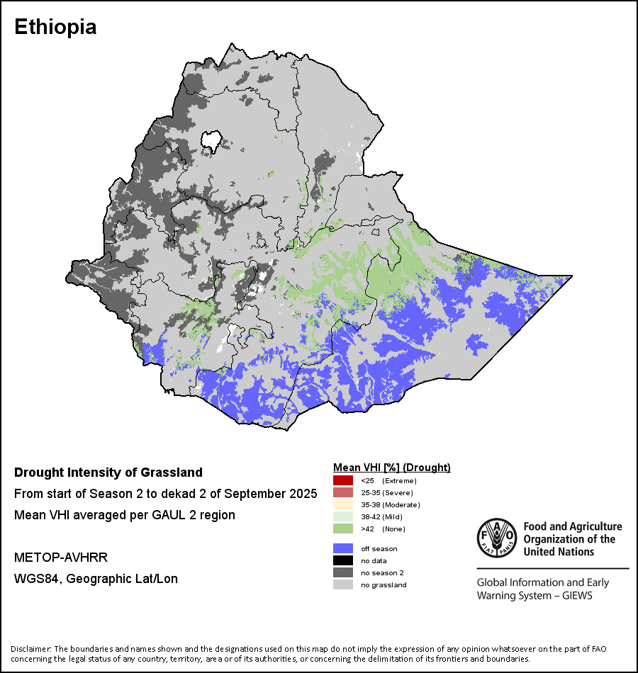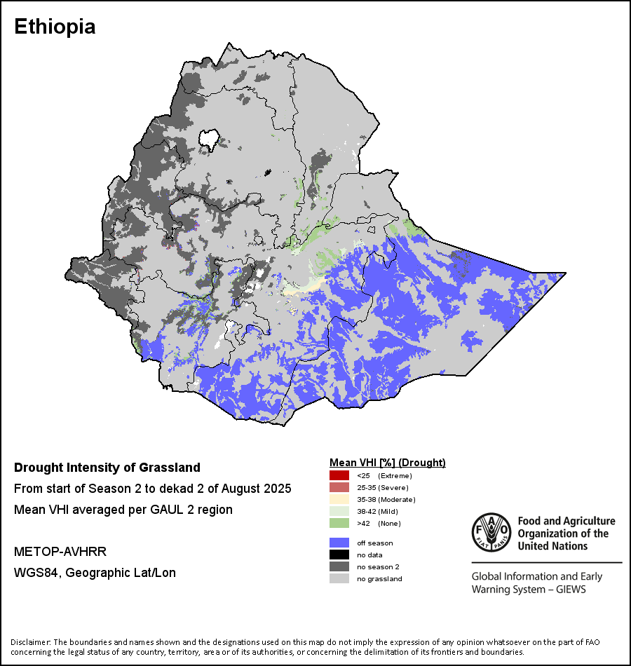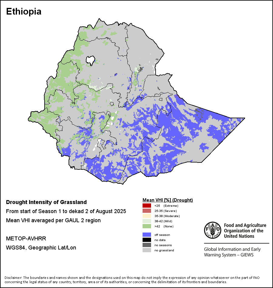 The Agricultural Stress Index (ASI) is a quick-look indicator that facilitates the early identification of cropped land with a high likelihood of water stress (drought). The Index is based on the integration of the Vegetation Health Index (VHI) in two dimensions that are critical in the assessment of a drought event in agriculture: temporal and spatial. The first step of the ASI calculation is a temporal averaging of the VHI, assessing the intensity and duration of dry periods occurring during the crop cycle at the pixel level; this calculation includes the use of crop coefficients, which introduces sensitivity of a crop to water stress during each phenological phase. The second step determines the spatial extent of drought events by calculating the percentage of pixels in arable areas with a VHI value below 35 percent (this value was identified as a critical threshold in assessing the extent of drought in previous research by Kogan, 1995). Each administrative area is classified according to the percentage of the affected area to facilitate the quick interpretation of results.