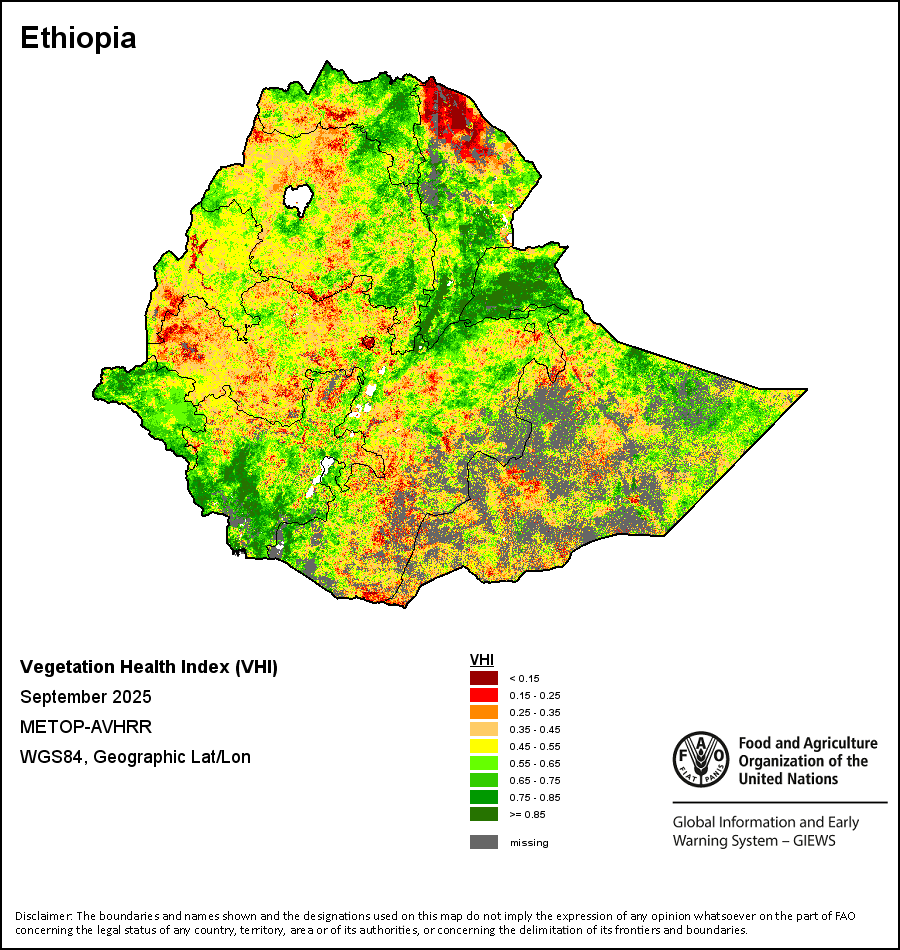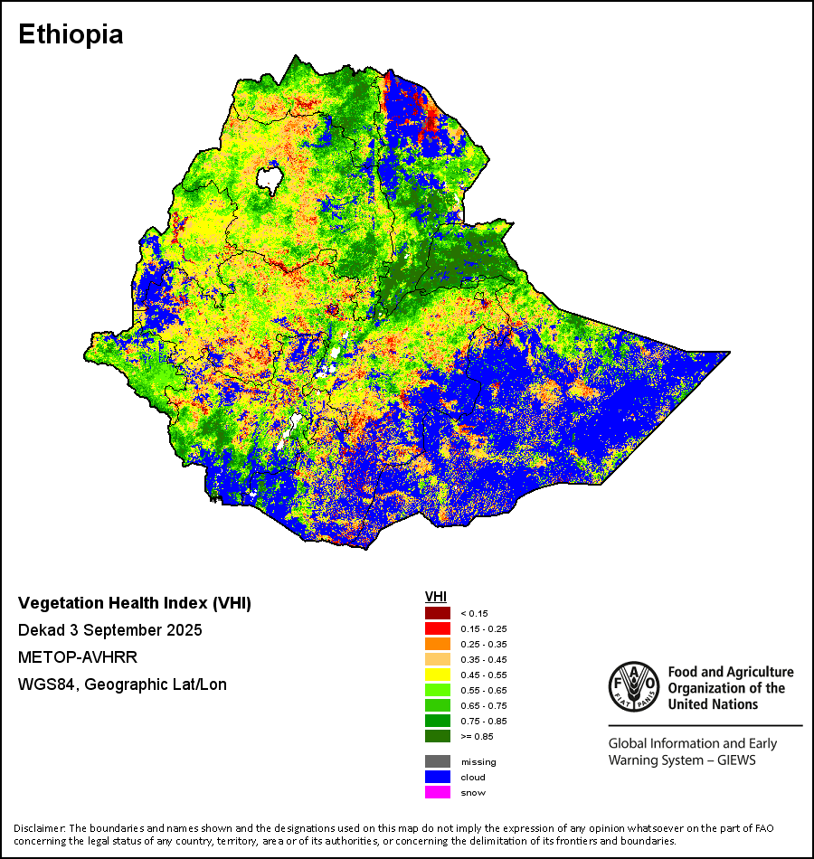 The Vegetation Health Index (VHI) illustrates the severity of drought based on the vegetation health and the influence of temperature on plant conditions. The VHI is a composite index and the elementary indicator used to compute the ASI. It combines both the Vegetation Condition Index (VCI) and the Temperature Condition Index (TCI). The TCI is calculated using a similar equation to the VCI, but relates the current temperature to the long-term maximum and minimum , as it is assumed that higher temperatures tend to cause a deterioration in vegetation conditions. A decrease in the VHI would, for example, indicate relatively poor vegetation conditions and warmer temperatures, signifying stressed vegetation conditions, and over a longer period would be indicative of drought. The VHI images are computed for the two main seasons and in three modalities: dekadal, monthly and annual.