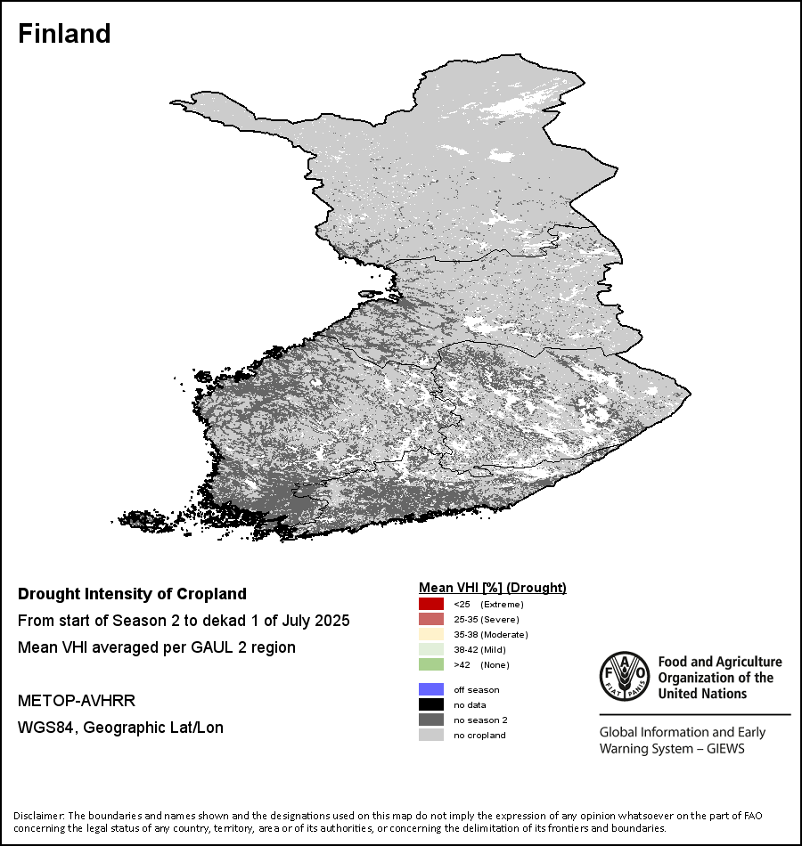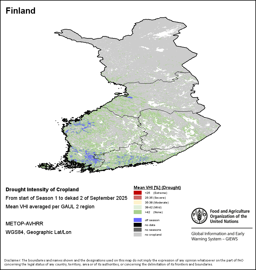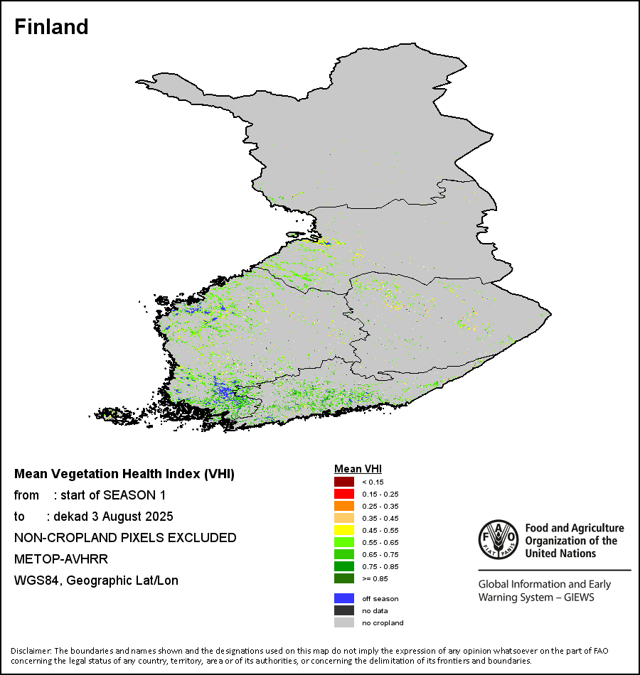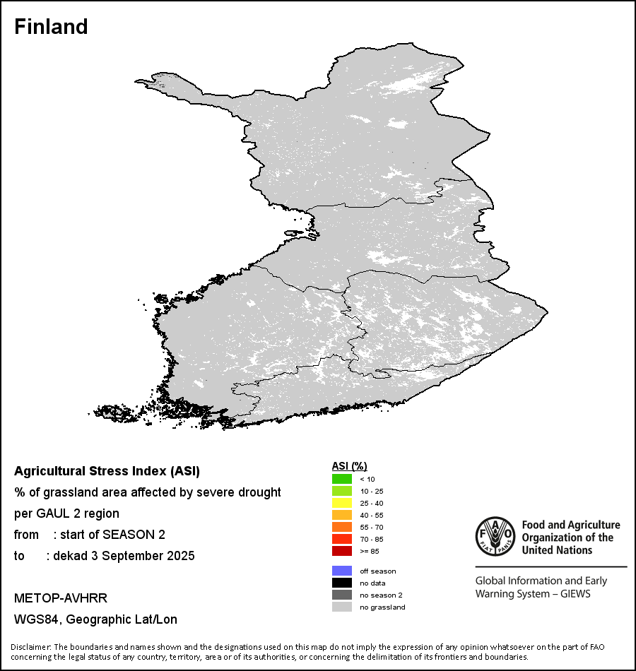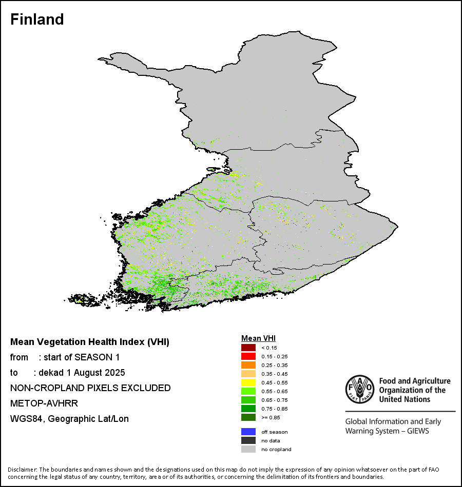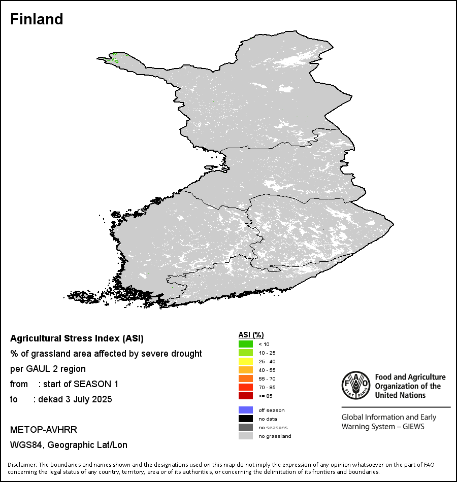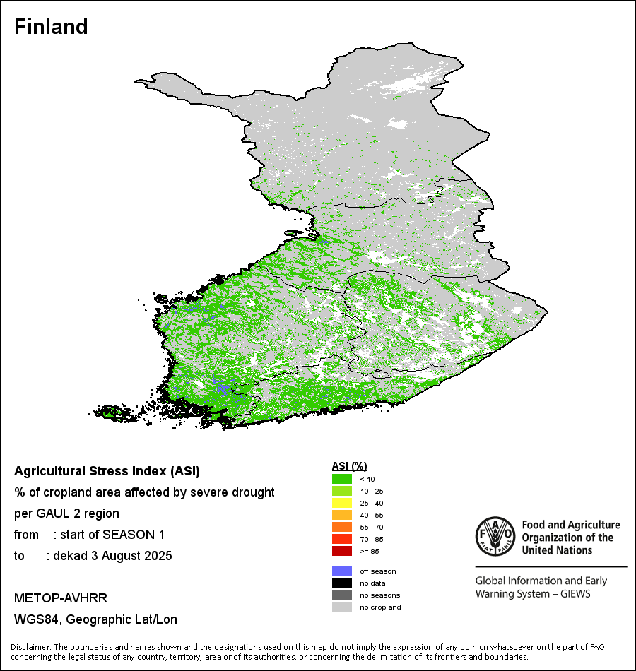 The Agricultural Stress Index (ASI) is a quick-look indicator that facilitates the early identification of cropped land with a high likelihood of water stress (drought). The Index is based on the integration of the Vegetation Health Index (VHI) in two dimensions that are critical in the assessment of a drought event in agriculture: temporal and spatial. The first step of the ASI calculation is a temporal averaging of the VHI, assessing the intensity and duration of dry periods occurring during the crop cycle at the pixel level; this calculation includes the use of crop coefficients, which introduces sensitivity of a crop to water stress during each phenological phase. The second step determines the spatial extent of drought events by calculating the percentage of pixels in arable areas with a VHI value below 35 percent (this value was identified as a critical threshold in assessing the extent of drought in previous research by Kogan, 1995). Each administrative area is classified according to the percentage of the affected area to facilitate the quick interpretation of results.
