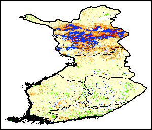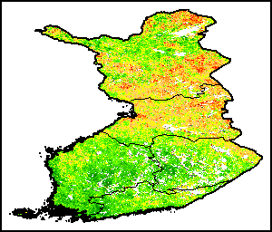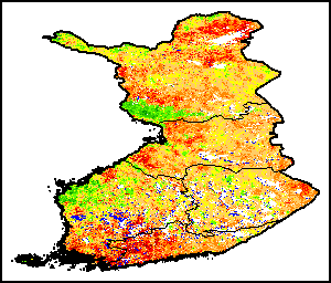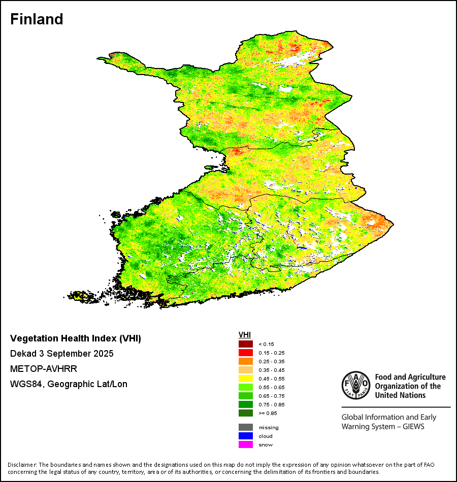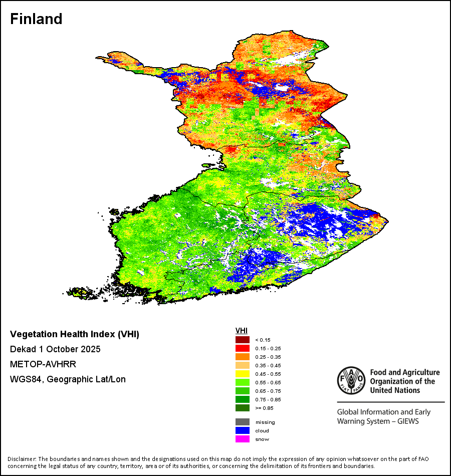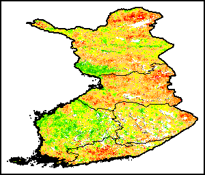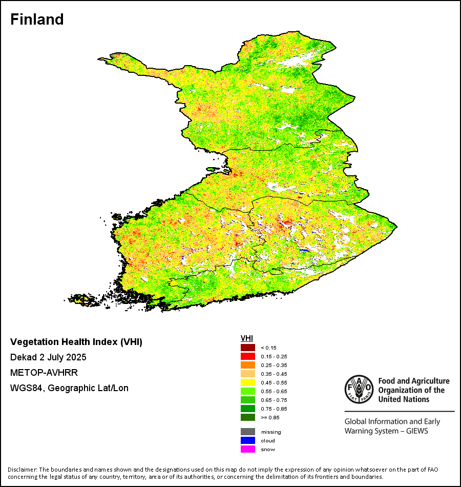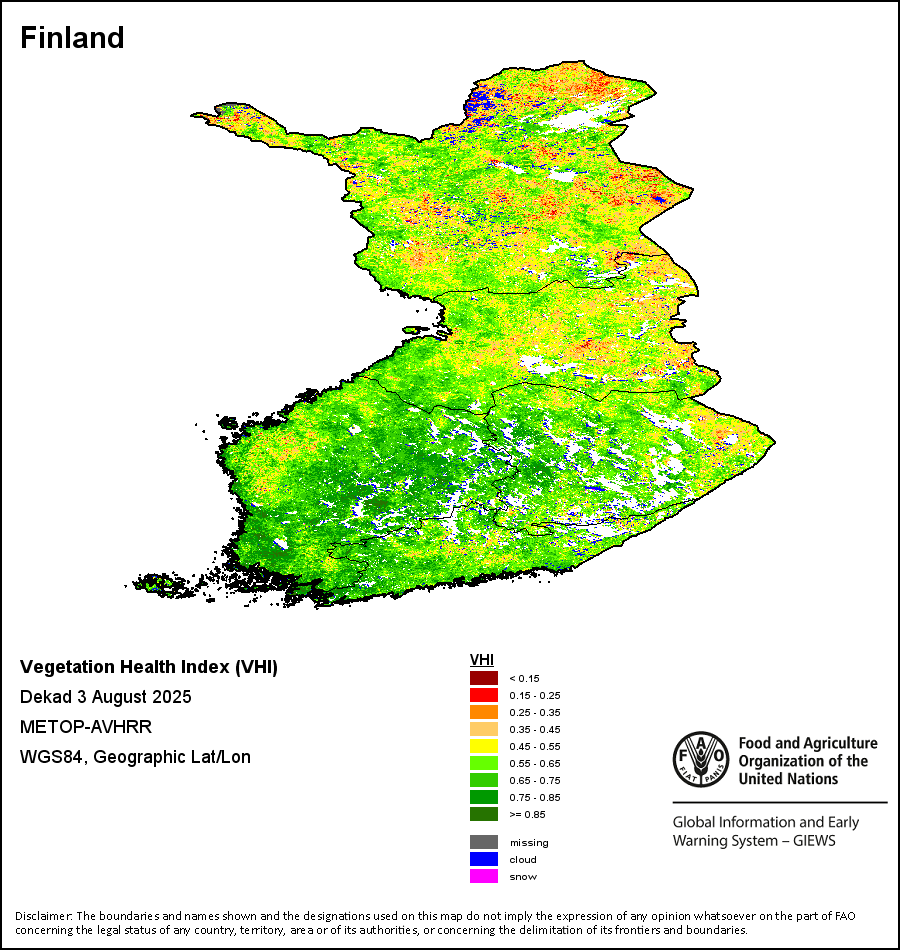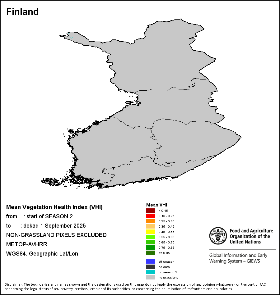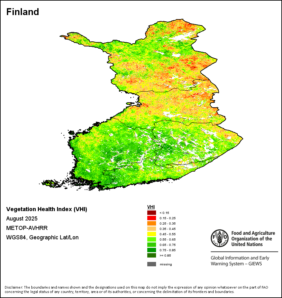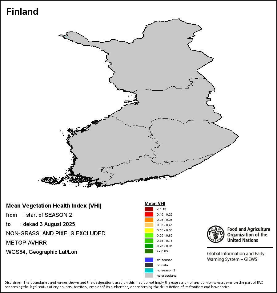 The Agricultural Stress Index (ASI) is a quick-look indicator that facilitates the early identification of cropped land with a high likelihood of water stress (drought). The Index is based on the integration of the Vegetation Health Index (VHI) in two dimensions that are critical in the assessment of a drought event in agriculture: temporal and spatial. The first step of the ASI calculation is a temporal averaging of the VHI, assessing the intensity and duration of dry periods occurring during the crop cycle at the pixel level; this calculation includes the use of crop coefficients, which introduces sensitivity of a crop to water stress during each phenological phase. The second step determines the spatial extent of drought events by calculating the percentage of pixels in arable areas with a VHI value below 35 percent (this value was identified as a critical threshold in assessing the extent of drought in previous research by Kogan, 1995). Each administrative area is classified according to the percentage of the affected area to facilitate the quick interpretation of results.