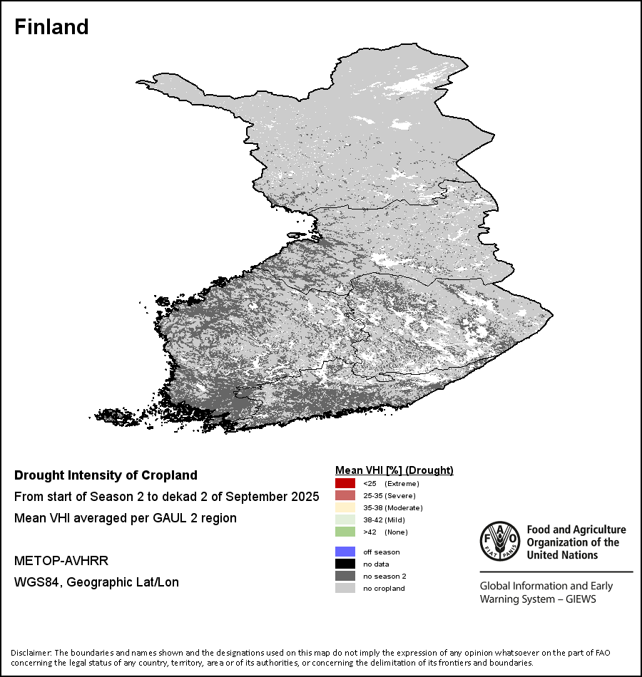 Agricultural droughts are classified by their intensity and are categorized into four classes: Extreme, Severe, Moderate or Mild. The intensity of the drought is calculated through the Weighted Mean Vegetation Health Index aggregated per GAUL 2 region, indicating that the poorer the vegetation health the more severe the drought.