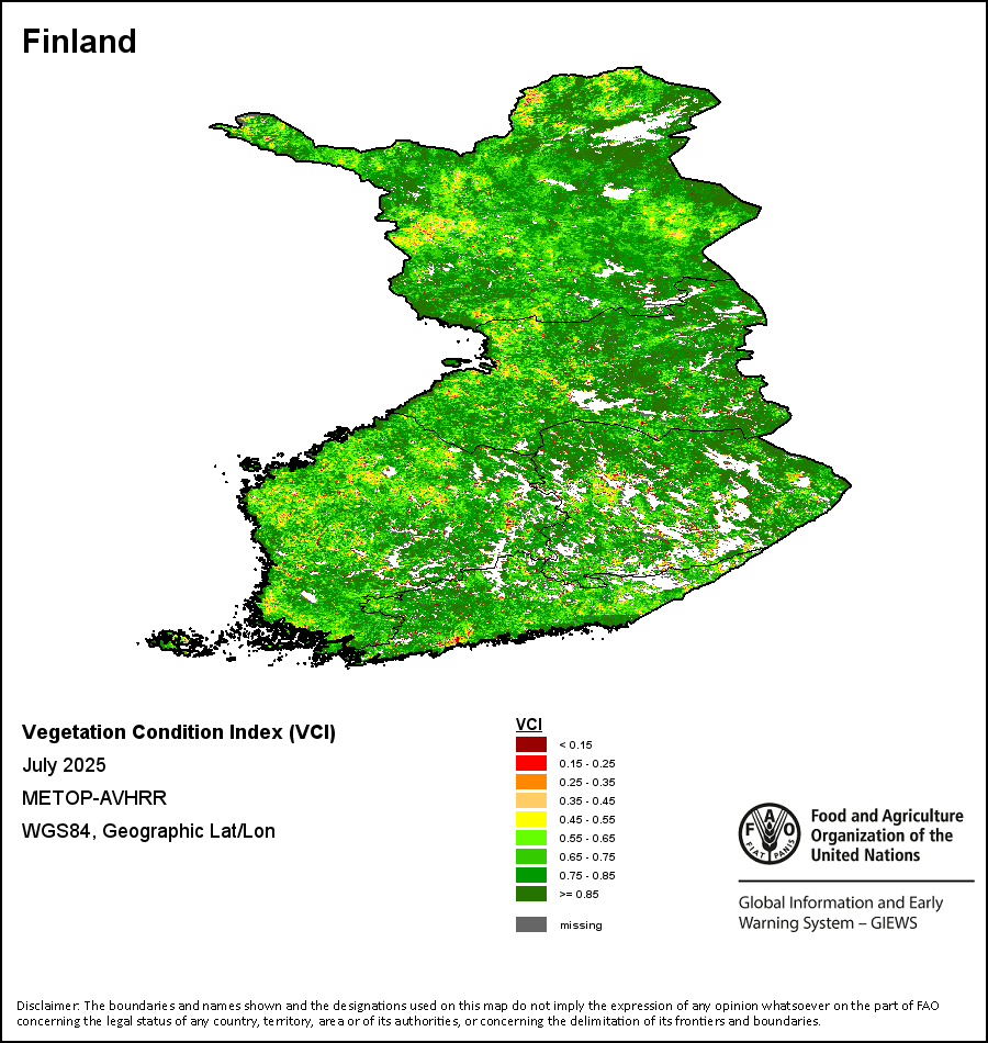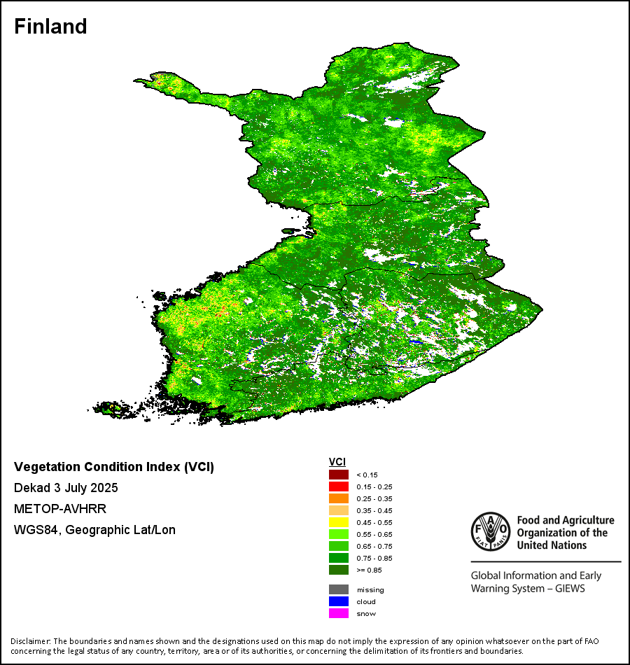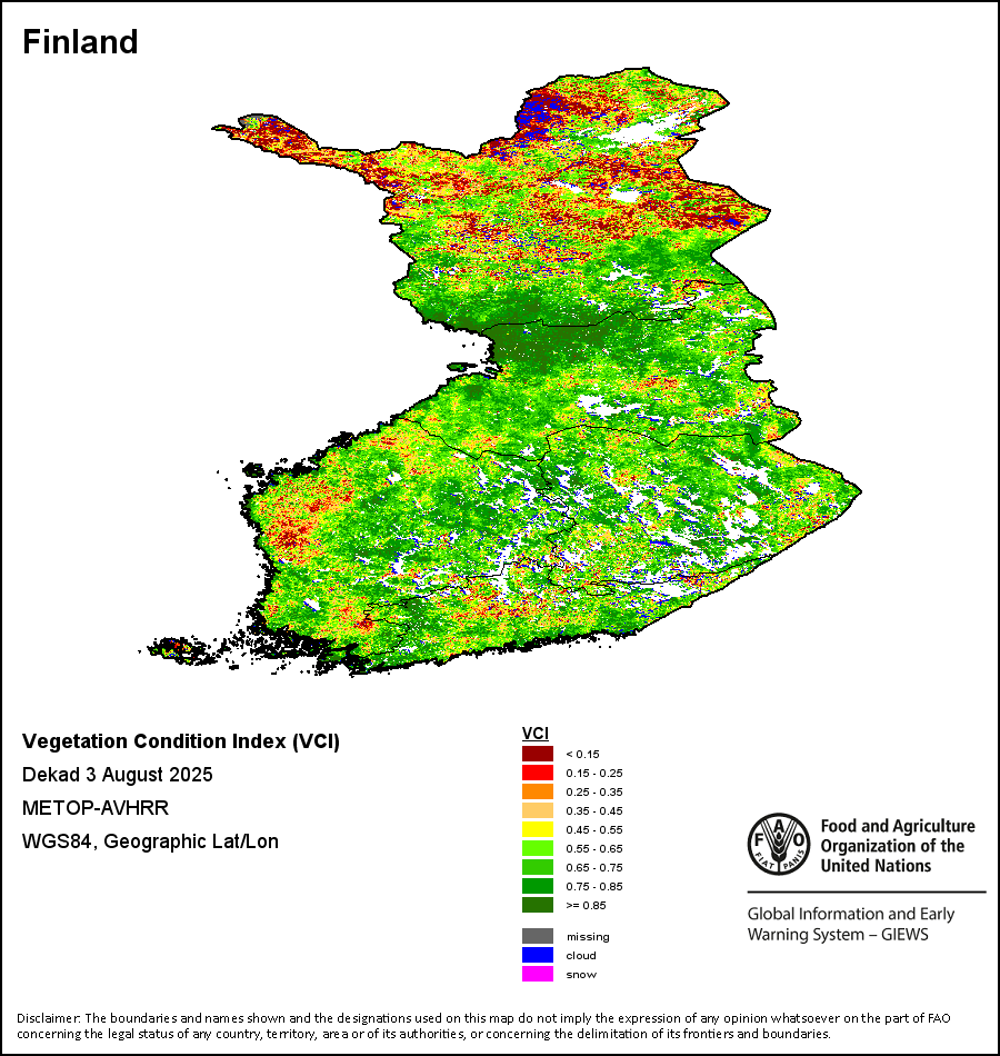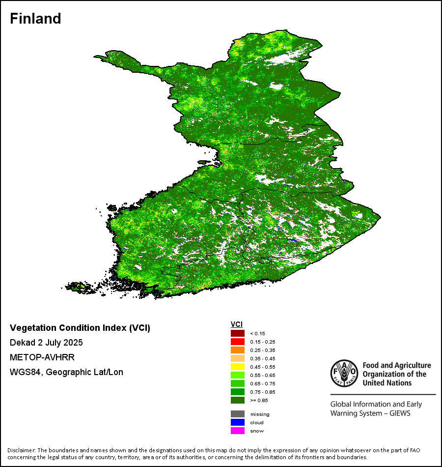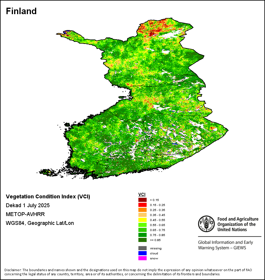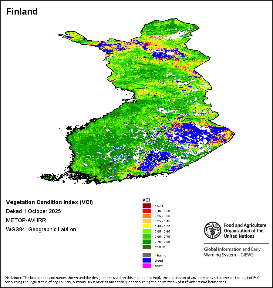 The Vegetation Condition Index (VCI) evaluates the current vegetation health in comparison to the historical trends. The VCI relates current dekadal Normalized Difference Vegetation Index (NDVI) to its long-term minimum and maximum, normalized by the historical range of NDVI values for the same dekad. The VCI was designed to separate the weather-related component of the NDVI from the ecological element.