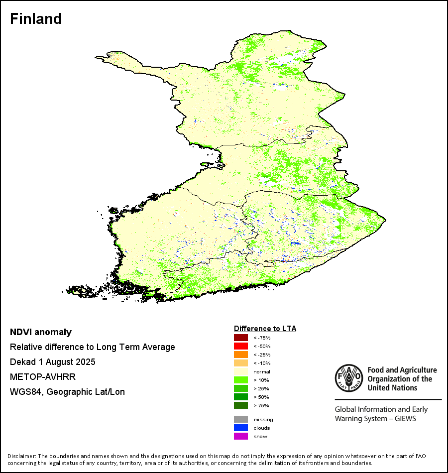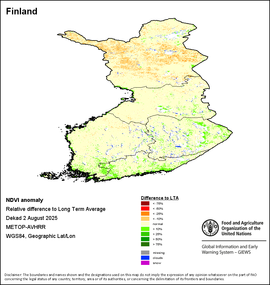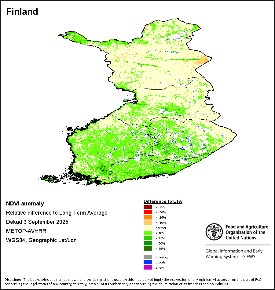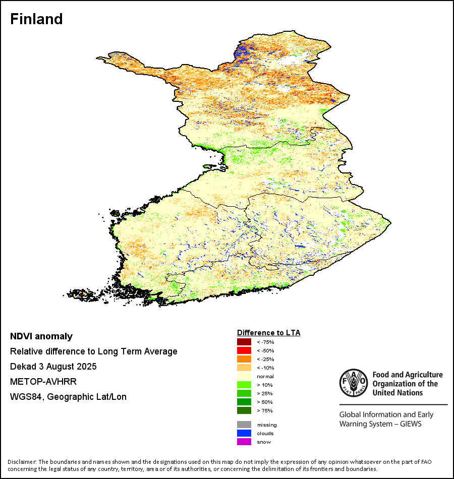 The Normalized Difference Vegetation Index (NDVI) measures the “greenness” of ground cover and is used as a proxy to indicate the density and health of vegetation. NDVI values range from +1 to -1, with high positive values corresponding to dense and healthy vegetation, and low and/or negative NDVI values indicating poor vegetation conditions or sparse vegetative cover. The NDVI anomaly indicates the variation of the current dekad to the long-term average, where a positive value (for example 20 percent) would signify enhanced vegetation conditions compared to the average, while a negative value (for instance -40 percent) would indicate comparatively poor vegetation conditions.