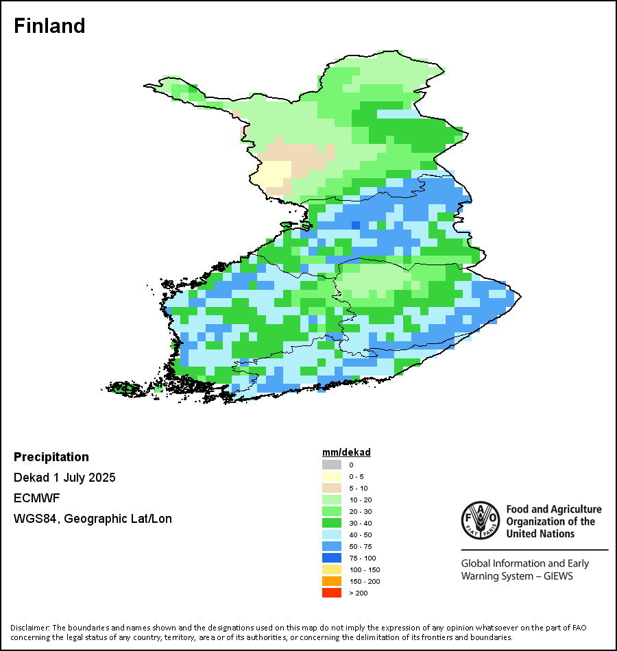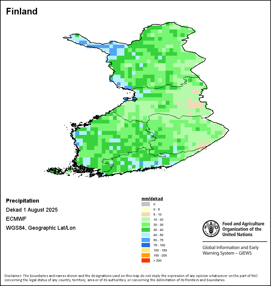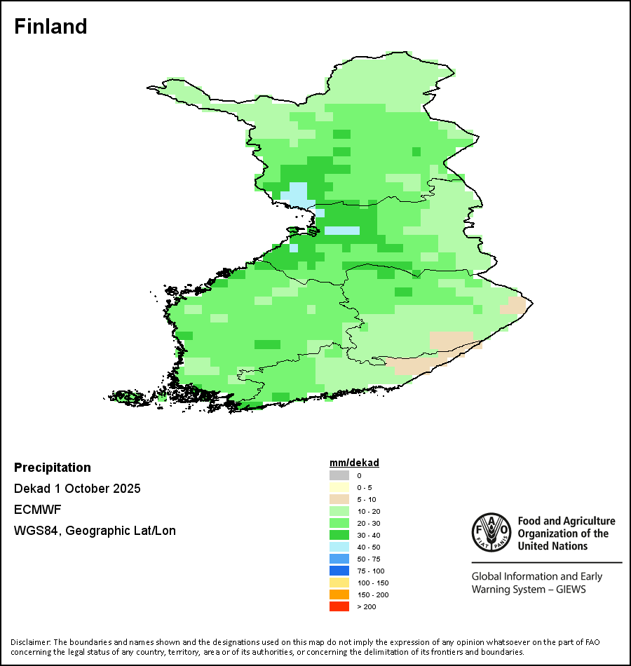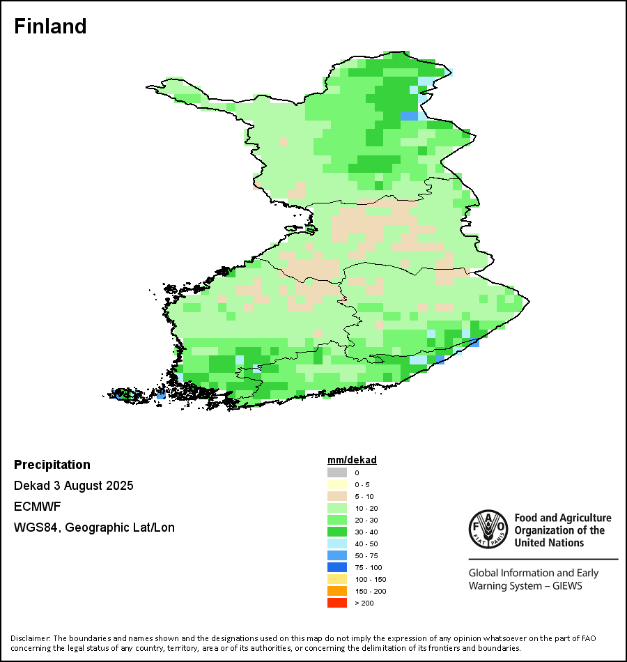 The map depicts cumulative rainfall volumes over a dekad (a 10-day period). Precipitation estimates for all African countries (except Cabo Verde and Mauritius) are taken from NOAA/FEWSNet, while for the remaining countries data is obtained from ECMWF.