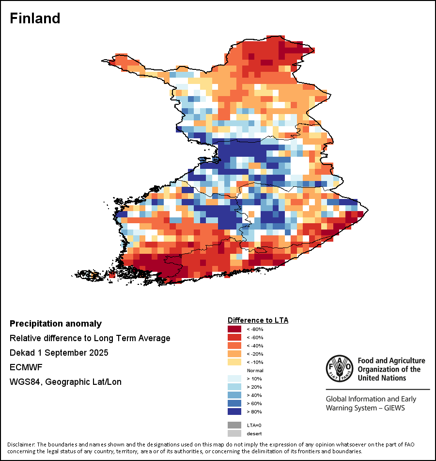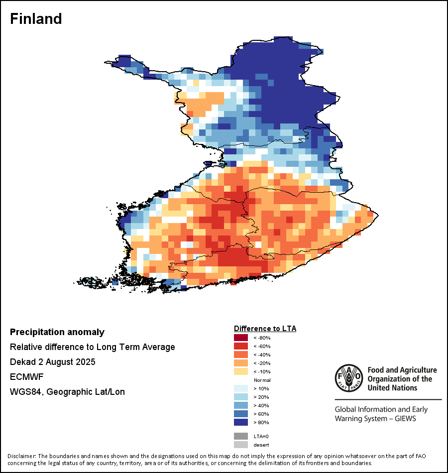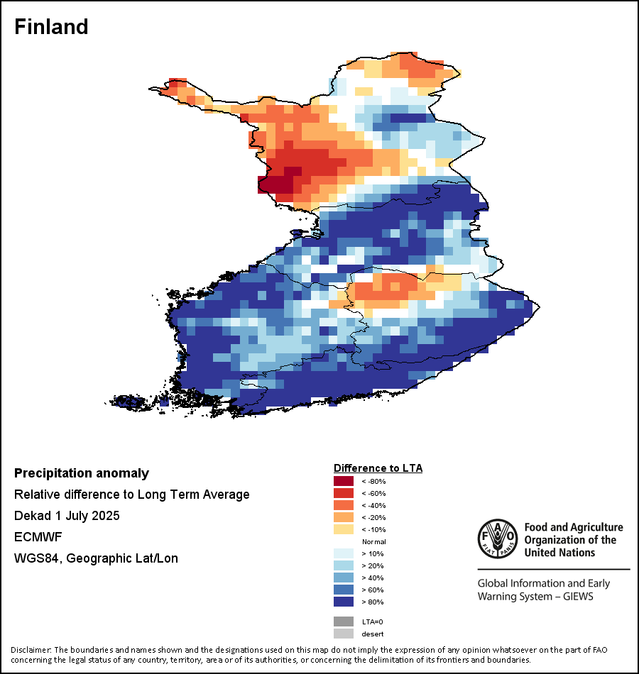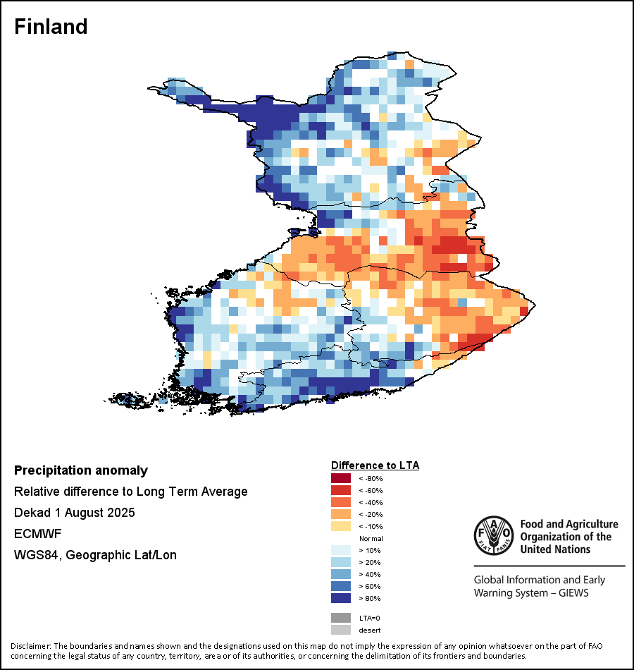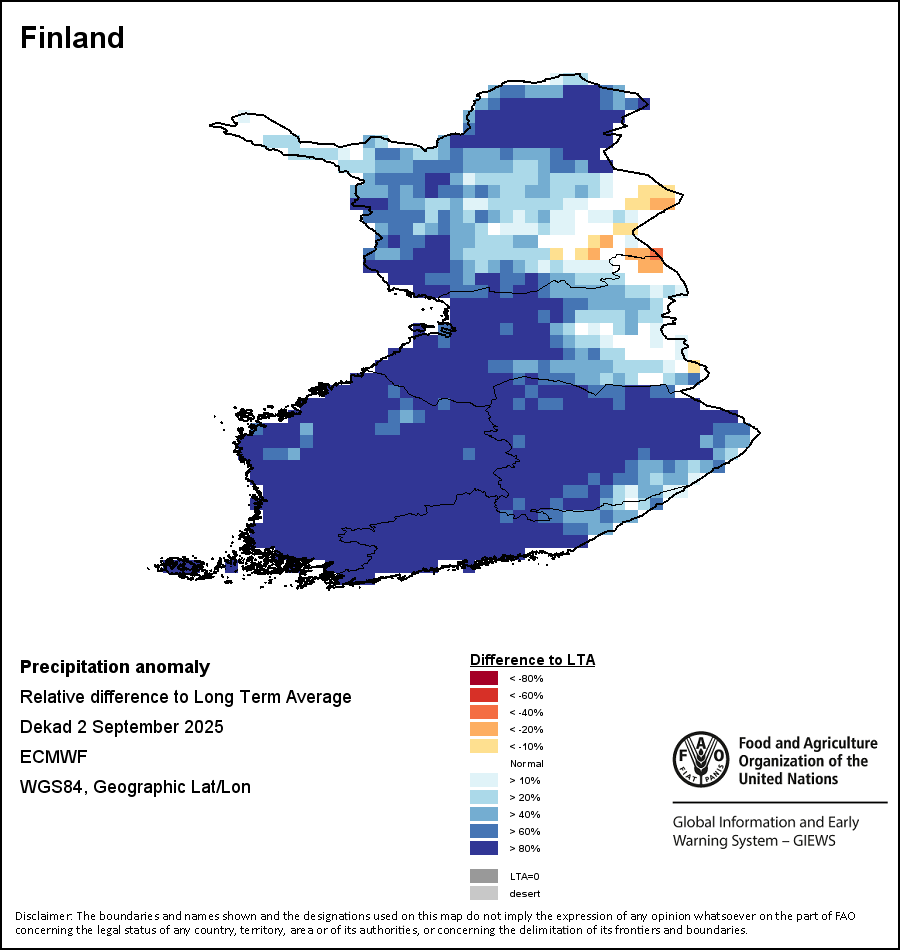 The map illustrates the difference between the current rainfall volume and the average level. Rainfall levels are compared with the Long-Term Average (LTA), which refers to the period 1989-2015. Warmer colours identify areas which have received lower-than-average rainfall, while colder colours are given to areas where precipitation has been above average.