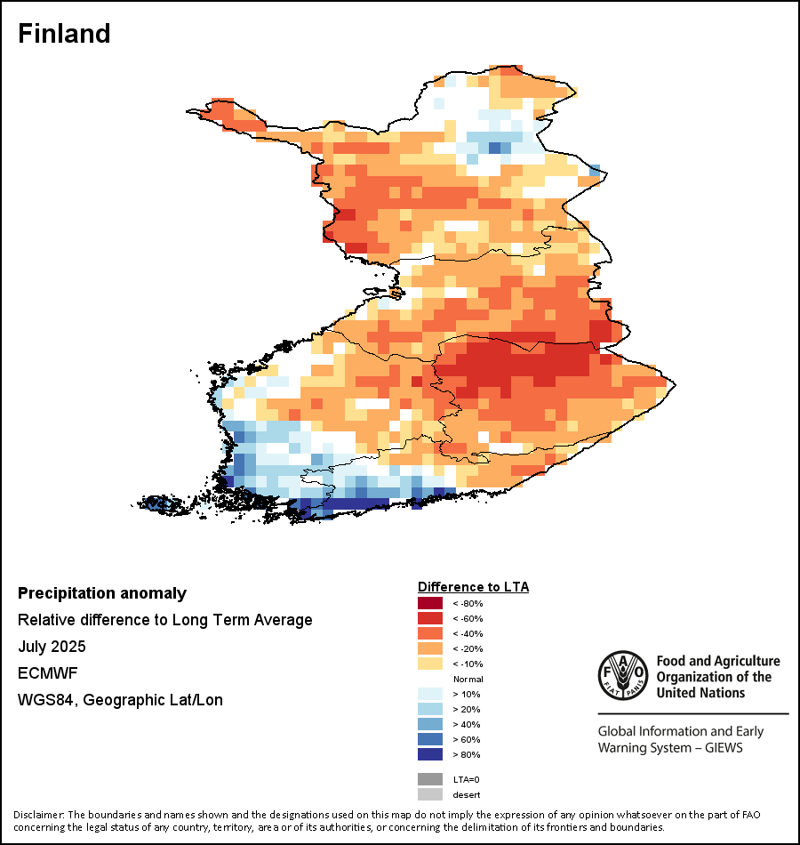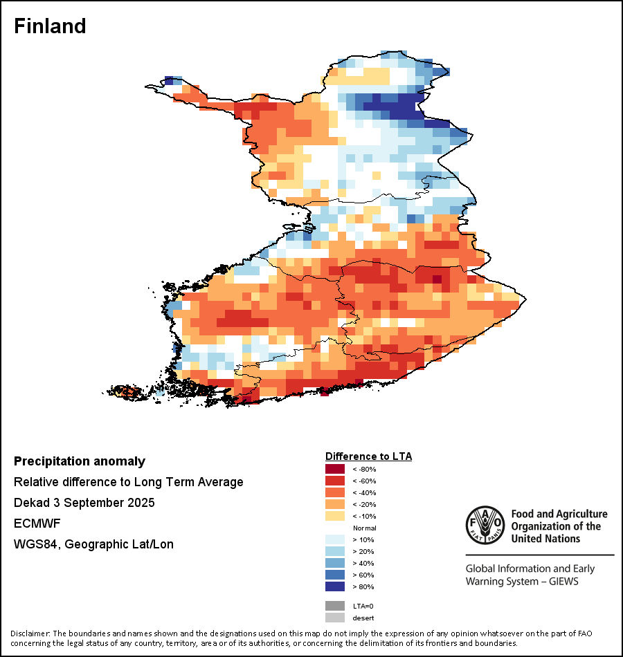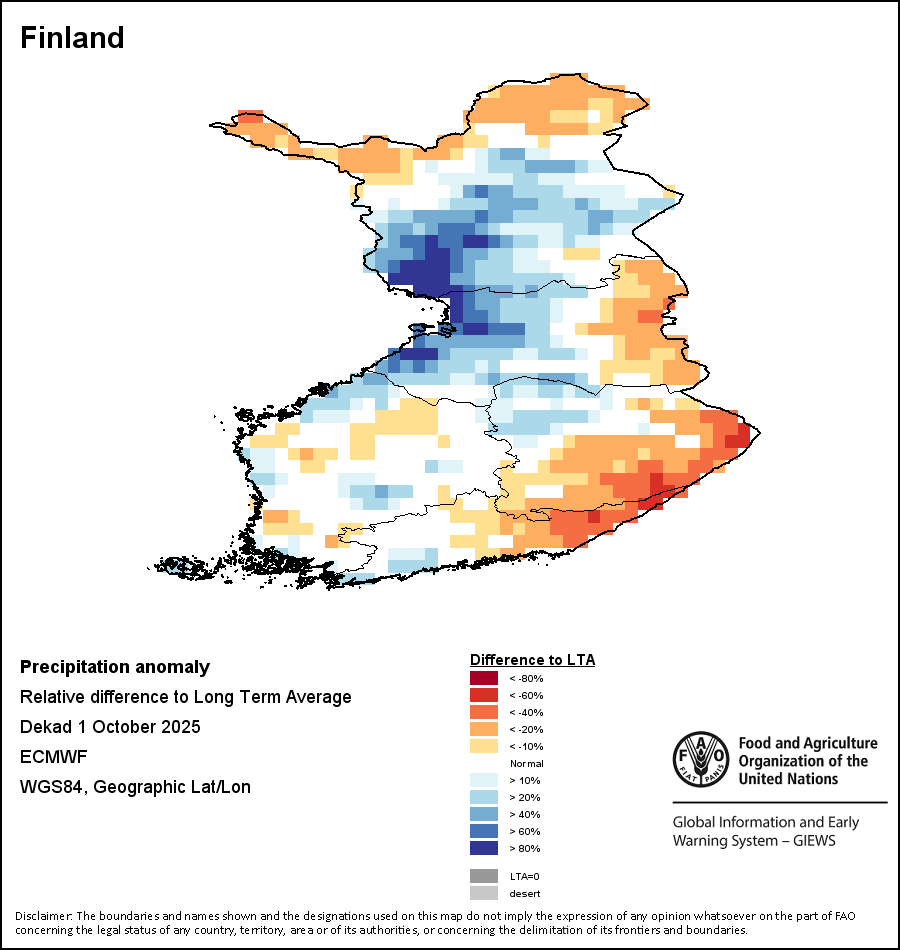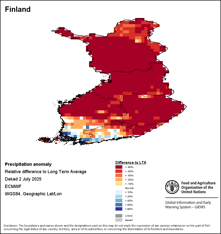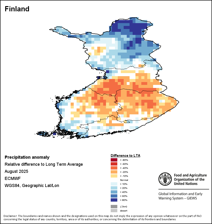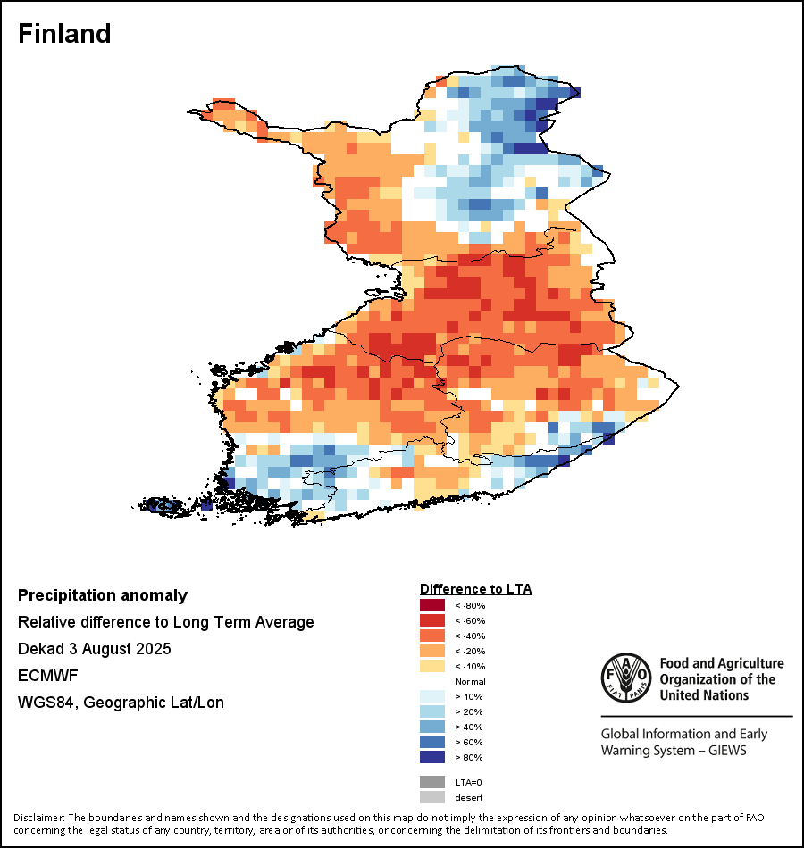 The map illustrates the difference between the current rainfall volume and the average level. Rainfall levels are compared with the Long-Term Average (LTA), which refers to the period 1989-2015. Warmer colours identify areas which have received lower-than-average rainfall, while colder colours are given to areas where precipitation has been above average.
