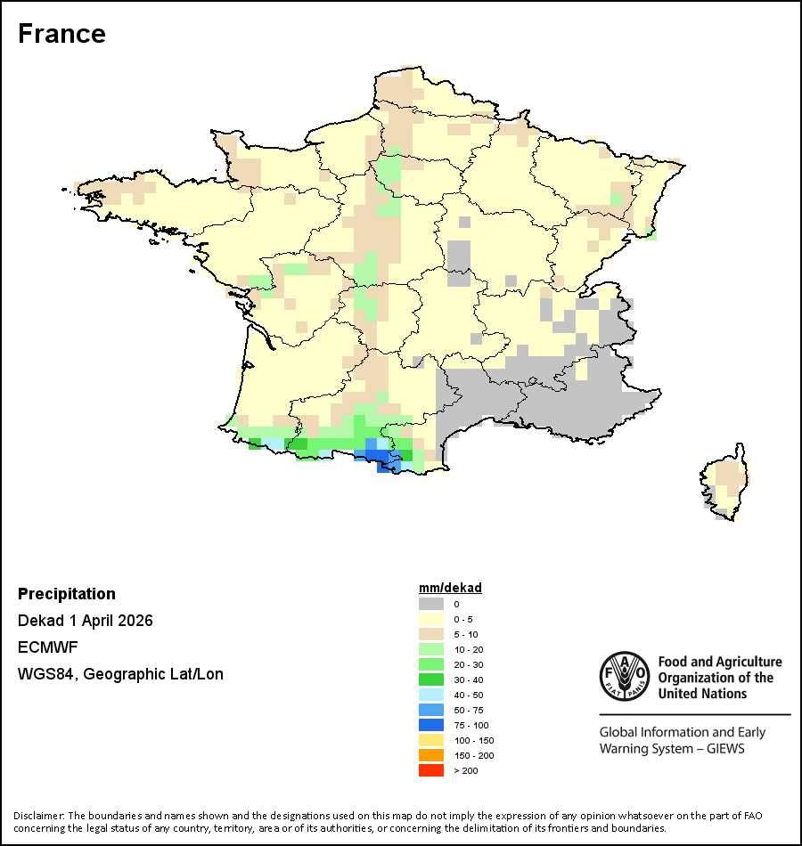На карте изображены кумулятивные объемы осадков в декаду (10-дневный период). Оценки атмосферных осадков для всех африканских стран (за исключением Кабо-Верде и Маврикия) получены из системы NOAA/Системы раннего предупреждения об опасности голода, а по остальным странам данные получены из системы ECMWF.