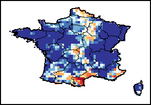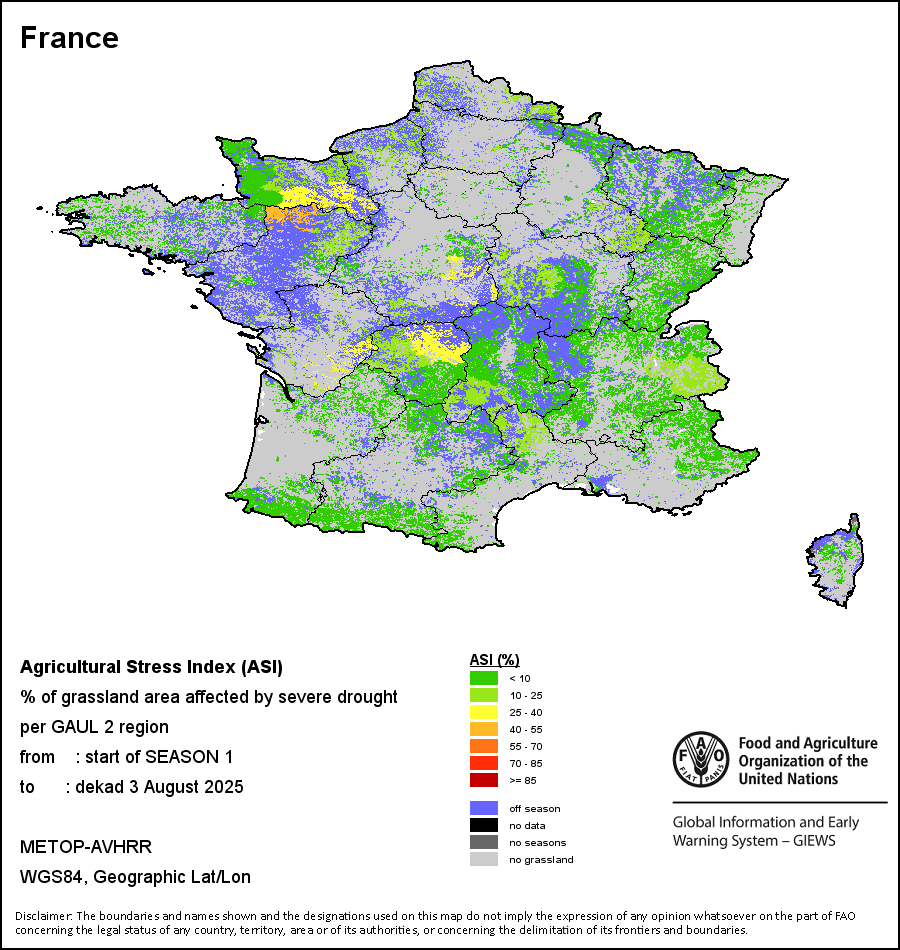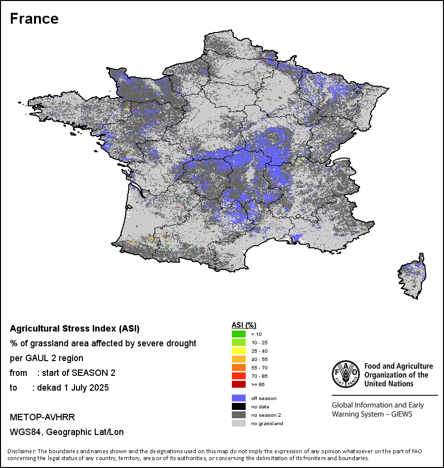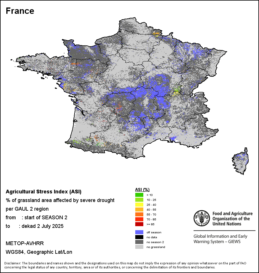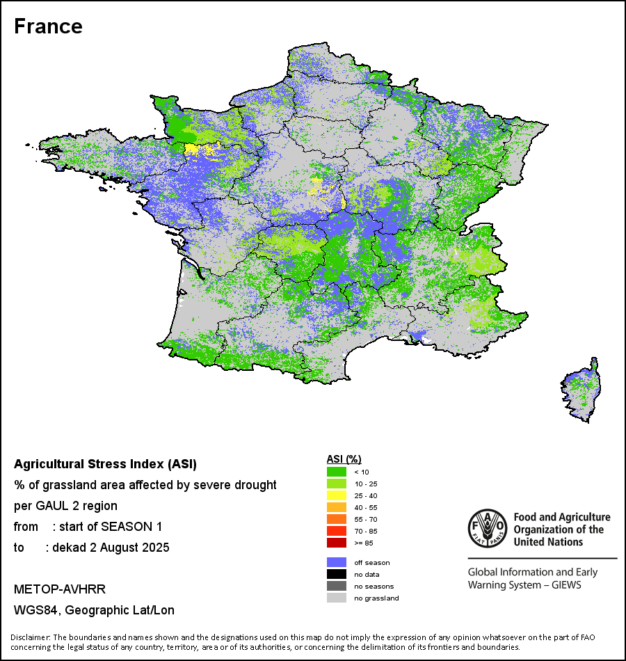 该地图显示的是两类地区的干旱发生频率:i)耕地面积的30%发生旱情;或ii)耕地面积的50%发生旱情。 严重旱情的历史频率(根据ASI的定义)是根据全部时间序列(1984-2024年)计算得出的。